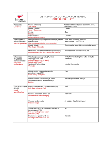 LISTA DANYCH DOTYCZĄCYCH TERENU SITE CHECK LIST Położenie Location Nazwa lokalizacji Kostrzyn-Slubice Special Economic Zone, Site name Subzone Lubsko Miasto / Gmina Lubsko Town / Commune Powiat Żary District Województwo Lubuskie Province (Voivodship) Maksymalna dostępna powierzchnia (w jednym Max. area available: 33,90 ha Powierzchnia As one piece : 28,7721 ha kawałku) ha nieruchomości Area of property Max. area available (as one piece) ha Kształt działki Rectangular, long side connected to street The shape of the site Informacje dotyczące nieruchomości Property information Możliwości powiększenia terenu (krótki opis) Possibility for expansion (short description) Purchase from private individuals Orientacyjna cena gruntu PLN/m2 włączając 22% VAT Approx. land price PLN/m 2 including 23% VAT Właściciel / właściciele Owner(s) 37 PLN/m including VAT ( the ability to negotiate) Aktualny plan zagospodarowania przestrzennego (T/N) Valid zoning plan (Y/N) Yes Przeznaczenie w miejscowym planie zagospodarowania przestrzennego Zoning Industry-production, storage Charakterystyka Klasa gruntów wraz z powierzchnią ha Soil class with area ha działki Land specification 2 Lubsko Community 3b-6 Różnica poziomów terenu m Differences in land level m Max 10m Obecne użytkowanie Present usage At present the plot isn’t used Zanieczyszczenia wód powierzchniowych i gruntowych (T/N) Soil and underground water pollution (Y/N) Poziom wód gruntowych m Underground water level m No No data Połączenia transportowe Transport links Czy były prowadzone badania geologiczne terenu (T/N) Were geological research done (Y/N) No Ryzyko wystąpienia zalań lub obsunięć terenu (T/N) Risk of flooding or land slide (Y/N) No Przeszkody podziemne (T/N) Underground obstacles (Y/N) No Przeszkody występujące na powierzchni terenu (T/N) Ground and overhead obstacles (Y/N) No Istniejące ograniczenia ekologiczne (T/N) Ecological restrictions (Y/N) According to the zoning plan Budynki i zabudowania na terenie (T/N) Buildings / other constructions on site (Y/N) No Droga dojazdowa do terenu (rodzaj drogi i jej szerokość) Access road to the plot (type and width of access road) Autostrada / droga krajowa km Nearest motorway / national road km Woivodship road No. 287, Freeway Motorway A18 – 32 km S3/national road No. 32- 46 km National road No.12- 20 km Motorway A2-70 km Porty rzeczne i morskie w odległości do 200 km River ports: Sea and river ports located up to 200 km Nowa Sól – 60 km Eisenhüttenstadt (Germany)-63 km Głogów- 104 km Kolej km Railway line km Istniejąca infrastruktura Existing infrastructure Sea harbor: Szczecin port-265 km Lubsko – 3km Bocznica kolejowa km Railway siding km 3 km Najbliższe lotnisko międzynarodowe km Nearest international airport km Berlin – 150 km Wrocław- 180 km Poznań – 180 km Najbliższe miasto wojewódzkie km Nearest province capital km Zielona Góra – 46 km Gorzów Wlkp. – 140 km Elektryczność na terenie (T/N) Electricity (Y/N) Yes Odległość przyłącza od granicy terenu Connection point (distance from boundary) m Napięcie Voltage kV At the boundary 15 Kv Dostępna moc Available capacity MW Gaz na terenie (T/N) Gas (Y/N) 3-4 MW No Odległość przyłącza od granicy działki Connection point (distance from boundary) m Wartość kaloryczna 3 Calorific value MJ/Nm 1500 m Średnica rury Pipe diameter mm 150 mm Dostępna objętość Available capacity Nm 3/h More than 500 m3/h Woda na terenie (T/N) Water supply (Y/N) Odległość przyłącza od granicy terenu Connection point (distance from boundary) m Dostępna objętość Available capacity m 3/24h Kanalizacja na terenie (T/N) Sewage discharge (Y/N) Odległość przyłącza od granicy terenu Connection point (distance from boundary) m Dostępna objętość Available capacity m3/24h Oczyszczalnia ścieków na terenie bądź w bezpośrednim sąsiedztwie Treatment plant (Y/N) Telefony (T/N) Telephone (Y/N) 27 MJ/m 3 Social-Yes Industry-Yes At the border of the plot By 60 m3/h 3 602 m /day 220 000 m 3/year Yes At the border of the plot - Yes-3 km 3 1 533 000 m /year Yes Odległość przyłącza od granicy terenu Connection point (distance from boundary) m Zoning-Resolution of Community: 1) Uchwała Nr XXIII/156/12 z dnia 27 czerwca 2012 r. ( the northern part of the plot) 2) Uchwała Nr XXXIII/230/13 z dnia 22 kwietnia 2013 r. ( the southern part of the plot) Uwagi Comments Osoba przygotowująca ofertę Offer prepared by Osoby do kontaktu Contact person Beata Pawlak-Alechno, Bevollmächtigte des Bürgermeisters für Wirtschaftsförderung und Auslandszusammenarbeit +48 603 560 218, [email protected], deutsche Sprache Beata Pawlak-Alechno, Bevollmächtigte des Bürgermeisters für Wirtschaftsförderung und Auslandszusammenarbeit +48 603 560 218, [email protected], deutsche Sprache