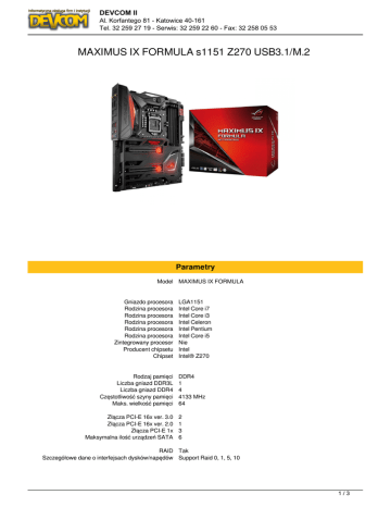 DEVCOM II Al. Korfantego 81 - Katowice 40-161 Tel. 32 259 27 19 - Serwis: 32 259 22 60 - Fax: 32 258 05 53 MAXIMUS IX FORMULA s1151 Z270 USB3.1/M.2 Parametry Model MAXIMUS IX FORMULA Gniazdo procesora Rodzina procesora Rodzina procesora Rodzina procesora Rodzina procesora Rodzina procesora Zintegrowany procesor Producent chipsetu Chipset Rodzaj pamięci Liczba gniazd DDR3L Liczba gniazd DDR4 Częstotliwość szyny pamięci Maks. wielkość pamięci Złącza PCI-E 16x ver. 3.0 Złącza PCI-E 16x ver. 2.0 Złącza PCI-E 1x Maksymalna ilość urządzeń SATA LGA1151 Intel Core i7 Intel Core i3 Intel Celeron Intel Pentium Intel Core i5 Nie Intel Intel® Z270 DDR4 1 4 4133 MHz 64 2 1 3 6 RAID Tak Szczegółowe dane o interfejsach dysków/napędów Support Raid 0, 1, 5, 10 1/3 DEVCOM II Al. Korfantego 81 - Katowice 40-161 Tel. 32 259 27 19 - Serwis: 32 259 22 60 - Fax: 32 258 05 53 Zintegrowana karta graficzna Tak Karta dźwiękowa ROG SupremeFX 8-Channel High Definition Audio CODEC S1220 - Impedance sense for front and rear headphone outputs - Supports : Jack-detection, Multi-streaming, Front Panel Jack-retasking - High quality 120 dB SNR stereo playback output and 113 dB SNR recording input - SupremeFX Shielding Technology - ESS® ES9023P - Supports up to 32-Bit/192kHz playback *6 Audio Feature : - Gold-plated jacks - Optical S/PDIF out port(s) at back panel - Sonic Radar III - Sonic Studio III Interfejs sieciowy Interfejs sieciowy Interfejs sieciowy Interfejs sieciowy Bluetooth 1 x 10/100/1000 Mbit/s Wi-Fi 802.11a/b/g/n/ac Intel® I219V Anti-surge LANGuard ROG GameFirst Technology Porty USB na tylnym panelu 10 Porty USB do wyprowadzenia z płyty 5 Liczba portów USB 3.0 6 Liczba portów USB 3.1 3 Złącza zewnętrzne Złącza zewnętrzne Złącza zewnętrzne Złącza zewnętrzne Złącza zewnętrzne Złącza zewnętrzne Złącza zewnętrzne Złącza zewnętrzne Złącza zewnętrzne Złącza zewnętrzne Złącza zewnętrzne Złącza zewnętrzne Złącza zewnętrzne Złącza zewnętrzne Złącza zewnętrzne Złącza dostępne na płycie Złącza dostępne na płycie Złącza dostępne na płycie Złącza dostępne na płycie Złącza dostępne na płycie Złącza dostępne na płycie Złącza dostępne na płycie Złącza dostępne na płycie Złącza dostępne na płycie Złącza dostępne na płycie Złącza dostępne na płycie 1 x Głośnik tylny 1 x USB 3.1 Type-C 1 x Line In 1 x RJ-45 1 x USB 3.1 4 x USB 3.0 1 x Line Out 1 x MIC 4 x USB 2.0 1 x S/PDIF 1 x Głośnik centralny / Subwoofer 1 x DisplayPort 1 x HDMI 1 x Przycisk Clear CMOS 1 x Przycisk USB BIOS Flashback 1 x 4pin wentylator procesora 1 x 4pin wentylator opcjonalny procesora 3 x 4pin wentylator obudowy 1 x 8pin 12V zasilanie 1 x 24pin ATX zasilanie 2 x M.2 6 x SATA III 6Gb/s 1 x USB 2.0/1.1 1 x USB 3.0 1 x USB 3.1 1 x TPM 2/3 DEVCOM II Al. Korfantego 81 - Katowice 40-161 Tel. 32 259 27 19 - Serwis: 32 259 22 60 - Fax: 32 258 05 53 Złącza dostępne na płycie Złącza dostępne na płycie Złącza dostępne na płycie Złącza dostępne na płycie Złącza dostępne na płycie Złącza dostępne na płycie Złącza dostępne na płycie Złącza dostępne na płycie Bios 1 x System panel 1 x Przedni panel audio 1 x Diody zasilania 1 x Przycisk MemOK! 1 x Przycisk zasilania 1 x Przycisk reset 1 x Przełącznik "Slow mode" 1 x Zworka LN2 Mode 1 x 128 Mb Flash ROM, UEFI AMI BIOS, PnP, DMI3.0, WfM2.0, SM BIOS 3.0, ACPI 5.0, Multi-language BIOS, ASUS EZ Flash 3, CrashFree BIOS 3, F11 EZ Tuning Wizard, F6 Qfan Control, F3 My Favorites, Last Modified log, F12 PrintScreen, F3 Shortcut functions and ASUS DRAM SPD (Serial Presence Detect) memory information. Format płyty ATX Wymiary 30.5 cm x 24.4 cm Akcesoria w zestawie User's manual 3 x SATA 6Gb/s cable(s) 1 x M.2 Screw Package 1 x CPU installation tool 1 x Supporting DVD 1 x ASUS 2T2R dual band Wi-Fi moving antennas (WiFi 802.11a/b/g/n/ac compliant) 1 x SLI HB BRIDGE(2-WAY-M) 1 x ROG big sticker 1 x Q-Connector 1 x 10-in-1 ROG cable label 1 x M.2 bracket 1 x Extension Cable for RGB strips (80 cm) 1 x ROG coasters Obsługiwane systemy operacyjne Windows 7 Obsługiwane systemy operacyjne Windows 8 Obsługiwane systemy operacyjne Windows 10 3/3 Powered by TCPDF (www.tcpdf.org)