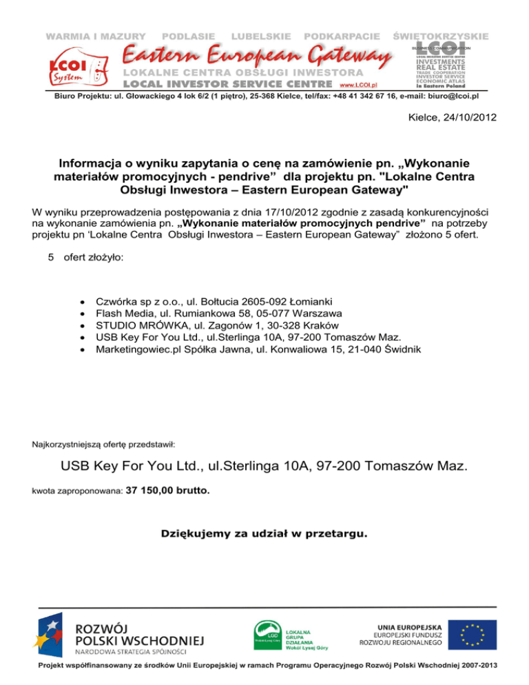 Kielce, 24/10/2012 Informacja o wyniku zapytania o cenę na zamówienie pn. „Wykonanie materiałów promocyjnych - pendrive” dla projektu pn. "Lokalne Centra Obsługi Inwestora – Eastern European Gateway" W wyniku przeprowadzenia postępowania z dnia 17/10/2012 zgodnie z zasadą konkurencyjności na wykonanie zamówienia pn. „Wykonanie materiałów promocyjnych pendrive” na potrzeby projektu pn ‘Lokalne Centra Obsługi Inwestora – Eastern European Gateway” złożono 5 ofert. 5 ofert złożyło: Czwórka sp z o.o., ul. Bołtucia 2605-092 Łomianki Flash Media, ul. Rumiankowa 58, 05-077 Warszawa STUDIO MRÓWKA, ul. Zagonów 1, 30-328 Kraków USB Key For You Ltd., ul.Sterlinga 10A, 97-200 Tomaszów Maz. Marketingowiec.pl Spółka Jawna, ul. Konwaliowa 15, 21-040 Świdnik Najkorzystniejszą ofertę przedstawił: USB Key For You Ltd., ul.Sterlinga 10A, 97-200 Tomaszów Maz. kwota zaproponowana: 37 150,00 brutto. Dziękujemy za udział w przetargu.