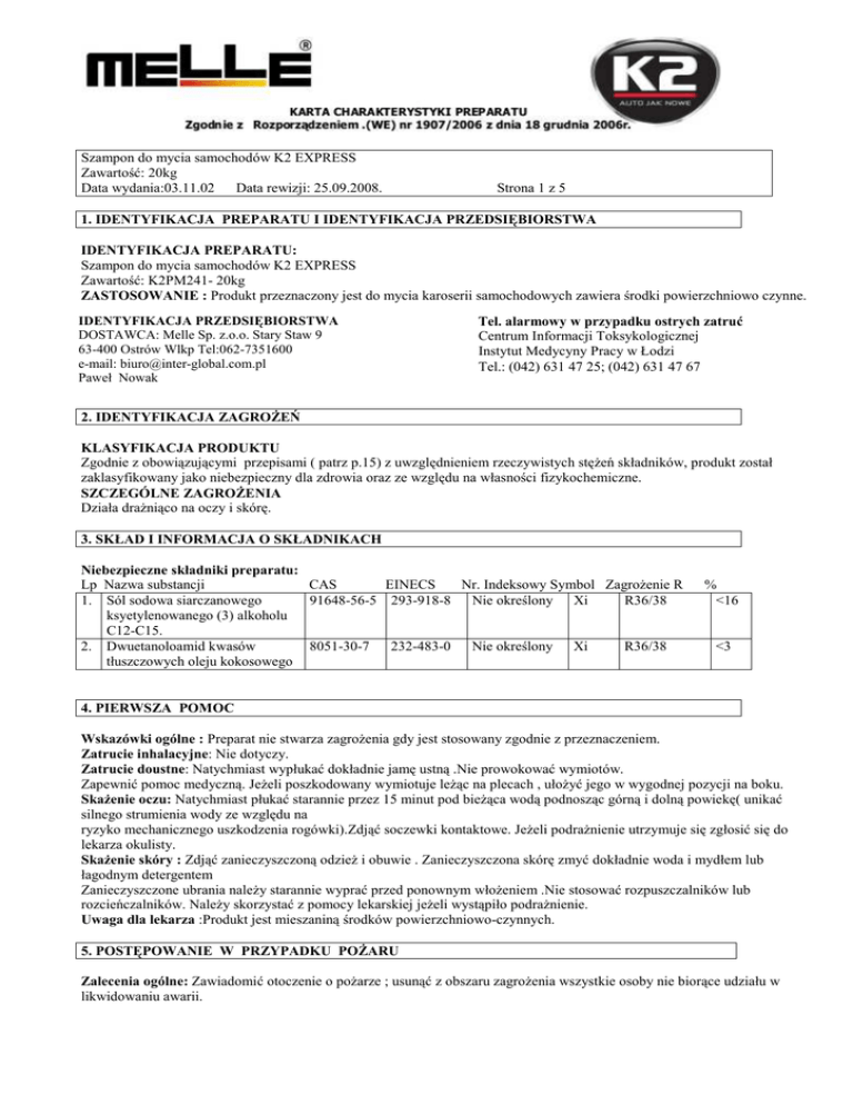 Szampon do mycia samochodów K2 EXPRESS Zawartość: 20kg Data wydania:03.11.02 Data rewizji: 25.09.2008. Strona 1 z 5 1. IDENTYFIKACJA PREPARATU I IDENTYFIKACJA PRZEDSIĘBIORSTWA IDENTYFIKACJA PREPARATU: Szampon do mycia samochodów K2 EXPRESS Zawartość: K2PM241- 20kg ZASTOSOWANIE : Produkt przeznaczony jest do mycia karoserii samochodowych zawiera środki powierzchniowo czynne. IDENTYFIKACJA PRZEDSIĘBIORSTWA DOSTAWCA: Melle Sp. z.o.o. Stary Staw 9 63-400 Ostrów Wlkp Tel:062-7351600 e-mail: [email protected] Paweł Nowak Tel. alarmowy w przypadku ostrych zatruć Centrum Informacji Toksykologicznej Instytut Medycyny Pracy w Łodzi Tel.: (042) 631 47 25; (042) 631 47 67 2. IDENTYFIKACJA ZAGROśEŃ KLASYFIKACJA PRODUKTU Zgodnie z obowiązującymi przepisami ( patrz p.15) z uwzględnieniem rzeczywistych stęŜeń składników, produkt został zaklasyfikowany jako niebezpieczny dla zdrowia oraz ze względu na własności fizykochemiczne. SZCZEGÓLNE ZAGROśENIA Działa draŜniąco na oczy i skórę. 3. SKŁAD I INFORMACJA O SKŁADNIKACH Niebezpieczne składniki preparatu: Lp Nazwa substancji CAS EINECS Nr. Indeksowy Symbol ZagroŜenie R 1. Sól sodowa siarczanowego 91648-56-5 293-918-8 Nie określony Xi R36/38 ksyetylenowanego (3) alkoholu C12-C15. 2. Dwuetanoloamid kwasów 8051-30-7 232-483-0 Nie określony Xi R36/38 tłuszczowych oleju kokosowego % <16 <3 4. PIERWSZA POMOC Wskazówki ogólne : Preparat nie stwarza zagroŜenia gdy jest stosowany zgodnie z przeznaczeniem. Zatrucie inhalacyjne: Nie dotyczy. Zatrucie doustne: Natychmiast wypłukać dokładnie jamę ustną .Nie prowokować wymiotów. Zapewnić pomoc medyczną. JeŜeli poszkodowany wymiotuje leŜąc na plecach , ułoŜyć jego w wygodnej pozycji na boku. SkaŜenie oczu: Natychmiast płukać starannie przez 15 minut pod bieŜąca wodą podnosząc górną i dolną powiekę( unikać silnego strumienia wody ze względu na ryzyko mechanicznego uszkodzenia rogówki).Zdjąć soczewki kontaktowe. JeŜeli podraŜnienie utrzymuje się zgłosić się do lekarza okulisty. SkaŜenie skóry : Zdjąć zanieczyszczoną odzieŜ i obuwie . Zanieczyszczona skórę zmyć dokładnie woda i mydłem lub łagodnym detergentem Zanieczyszczone ubrania naleŜy starannie wyprać przed ponownym włoŜeniem .Nie stosować rozpuszczalników lub rozcieńczalników. NaleŜy skorzystać z pomocy lekarskiej jeŜeli wystąpiło podraŜnienie. Uwaga dla lekarza :Produkt jest mieszaniną środków powierzchniowo-czynnych. 5. POSTĘPOWANIE W PRZYPADKU POśARU Zalecenia ogólne: Zawiadomić otoczenie o poŜarze ; usunąć z obszaru zagroŜenia wszystkie osoby nie biorące udziału w likwidowaniu awarii. Szampon do mycia samochodów K2 EXPRESS Zawartość: 20kg strona 2 z 5 Odpowiednie środki gaśnicze: Woda metodą natryskową , suche środki gaśnicze, piana odporna na działanie alkoholu, dwutlenek węgla . Chłodzić preparaty znajdujące się w okolicy poŜaru prysznicem wodnym lub usunąć je z obszaru zagroŜonego. Środki gaśnicze , których nie wolno uŜywać ze względów bezpieczeństwa: Gaszenie pełnym strumieniem wody. Środki ochrony indywidualnej dla straŜaków: UŜywać zabezpieczeń dla górnych dróg oddechowych , sprzęt ochronny dróg oddechowych –taki jak na wyposaŜeniu straŜaków oraz ubranie ochronne. ZagroŜenia związane ze spalaniem: Powstają tlenki węgla , tlenki azotu oraz pary amin.. Opakowania mogą się topić i przeciekać wskutek ognia i ciepła. Inne wskazówki: Sąsiednie pojemniki chłodzić wodą. Zanieczyszczoną wodę zebrać do zbiorników. 6. POSTĘPOWANIE W PRZYPADKU NIEZAMIERZONEGO UWOLNIENIA DO ŚRODOWISKA Środki ochrony indywidualnej: Ewakuować osoby niezwiązane z usuwaniem awarii. Nie wdychać par. Stosować ubranie ochronne i zabezpieczenia oczu i dróg oddechowych. Unikać zanieczyszczenia substancją. Posiadać przy sobie butelkę z wodą do przemywania oczu. Uwaga na śliskie powierzchnię po wylaniu produktu na posadzkę. Środki ostroŜności w zakresie ochrony środowiska: Zapobiec przedostaniu się do wód .W przypadku zanieczyszczenia produktem rzek , jezior , gruntu lub kanalizacji zawiadomić o tym odpowiednie władze .Zapobiec rozprzestrzenianiu produktu poprzez stosowanie materiałów pochłaniających jak trociny , ziemia okrzemkowa itp. , obwałowania z dostępnych materiałów .Uszkodzone opakowania umieścić w innych szczelnych opakowaniach celem dalszego wykorzystania produktu. Metody oczyszczania: Materiał zebrać do pojemników i przekazać do unieszkodliwienia. Zanieczyszczoną powierzchnię spłukać wodą .Zanieczyszczoną skórę umyć wodą z mydłem. Pozostałości nie są niebezpieczne. 7. POSTĘPOWANIE Z PREPARATEM I ICH MAGAZYNOWANIE Posługiwanie się: Zapobieganie zatruciom: podczas stosowania nie jeść , nie pić , unikać kontaktu z cieczą. przestrzegać zasad higieny osobistej , stosować odzieŜ i sprzęt ochronny , unikać wdychania. Środki ochrony indywidualnej – patrz punkt 8 Zapobieganie poŜarom i wybuchom: nie ma uwarunkowań. Magazynowanie: Wymogi odnośnie pomieszczeń magazynowych i warunków przechowywania: Przechowywać w oryginalnych zamkniętych pojemnikach Inne uwagi odnośnie warunków przechowywania: Magazynować w suchym , krytym i dobrze wentylowanym miejscu. Temperatura magazynowania +5 do + 40 stop C z dala od silnych utleniaczy. Chronić przed mrozem.. Rodzaj opakowań: Kanistry z tworzywa sztucznego o zawartości 20kg. 8. KONTROLA NARAśENIA I ŚRODKI OCHRONY INDYWIDUALNEJ Kontrola naraŜenia: Wartości dopuszczalnych stęŜeńOchrony osobiste: oczu, dróg oddechowych , rąk: nie są wymagane przy normalnym zastosowaniu produktu. Ochrona skóry i ciała :niekonieczna; Zalecenia higieniczne: Myć ręce przed kaŜdą przerwą i po zakończeniu pracy oraz przed spoŜywaniem posiłków i korzystaniem z toalety. Zanieczyszczoną skórę umyć natychmiast wodą z mydłem . Trzymać z dala od Ŝywności , napojów i pasz .OdzieŜ zanieczyszczoną prod