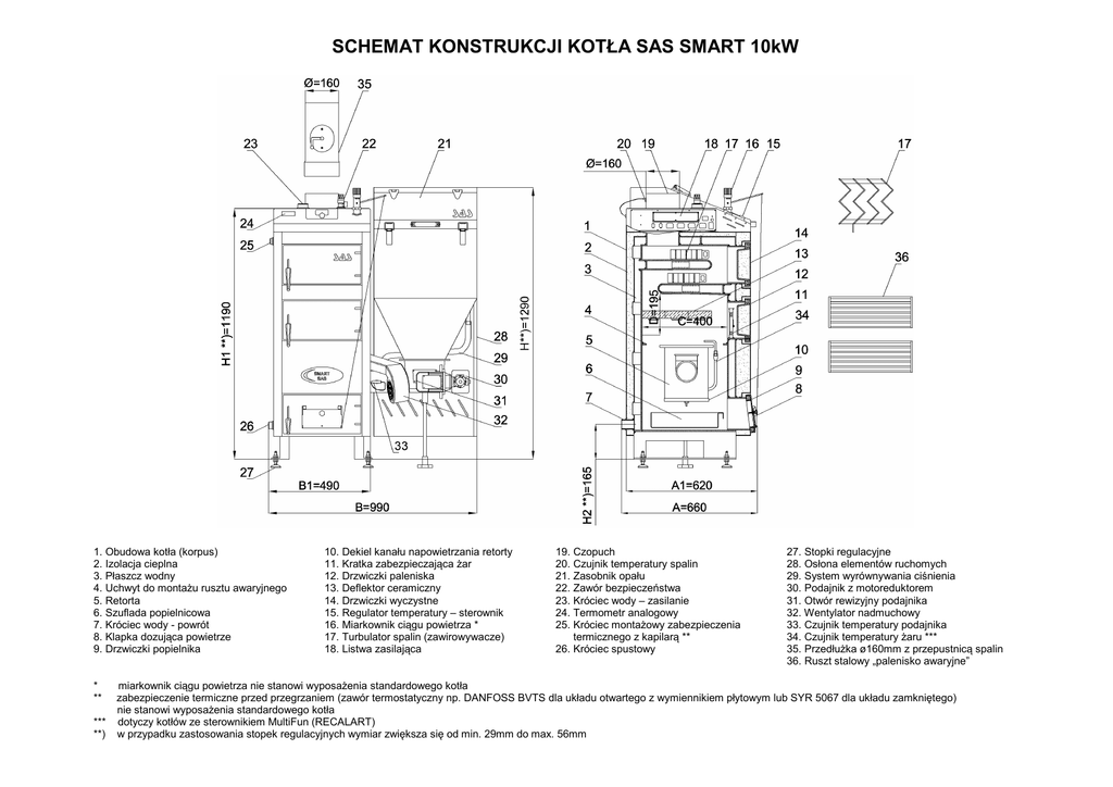 SCHEMAT KONSTRUKCJI KOTŁA SAS SMART 10kW 1. Obudowa kotła (korpus) 2. Izolacja cieplna 3. Płaszcz wodny 4. Uchwyt do montażu rusztu awaryjnego 5. Retorta 6. Szuflada popielnicowa 7. Króciec wody - powrót 8. Klapka dozująca powietrze 9. Drzwiczki popielnika * ** *** **) 10. Dekiel kanału napowietrzania retorty 11. Kratka zabezpieczająca żar 12. Drzwiczki paleniska 13. Deflektor ceramiczny 14. Drzwiczki wyczystne 15. Regulator temperatury – sterownik 16. Miarkownik ciągu powietrza * 17. Turbulator spalin (zawirowywacze) 18. Listwa zasilająca 19. Czopuch 20. Czujnik temperatury spalin 21. Zasobnik opału 22. Zawór bezpieczeństwa 23. Króciec wody – zasilanie 24. Termometr analogowy 25. Króciec montażowy zabezpieczenia termicznego z kapilarą ** 26. Króciec spustowy 27. Stopki regulacyjne 28. Osłona elementów ruchomych 29. System wyrównywania ciśnienia 30. Podajnik z motoreduktorem 31. Otwór rewizyjny podajnika 32. Wentylator nadmuchowy 33. Czujnik temperatury podajnika 34. Czujnik temperatury żaru *** 35. Przedłużka ø160mm z przepustnicą spalin 36. Ruszt stalowy „palenisko awaryjne” miarkownik ciągu powietrza nie stanowi wyposażenia standardowego kotła zabezpieczenie termiczne przed przegrzaniem (zawór termostatyczny np. DANFOSS BVTS dla układu otwartego z wymiennikiem płytowym lub SYR 5067 dla układu zamkniętego) nie stanowi wyposażenia standardowego kotła dotyczy kotłów ze sterownikiem MultiFun (RECALART) w przypadku zastosowania stopek regulacyjnych wymiar zwiększa się od min. 29mm do max. 56mm