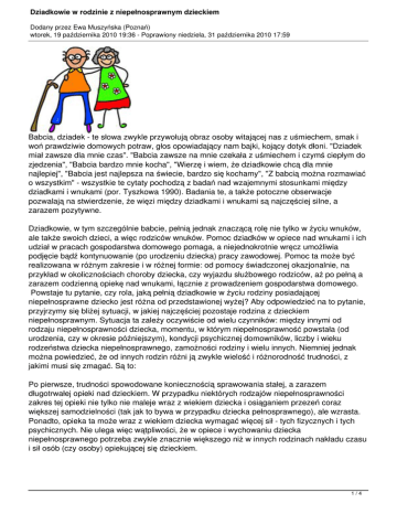 Dziadkowie w rodzinie z niepełnosprawnym dzieckiem Dodany przez Ewa Muszyńska (Poznań) wtorek, 19 października 2010 19:36 - Poprawiony niedziela, 31 października 2010 17:59 Babcia, dziadek - te słowa zwykle przywołują obraz osoby witającej nas z uśmiechem, smak i woń prawdziwie domowych potraw, głos opowiadający nam bajki, kojący dotyk dłoni. "Dziadek miał zawsze dla mnie czas". "Babcia zawsze na mnie czekała z uśmiechem i czymś ciepłym do zjedzenia", "Babcia bardzo mnie kocha", "Wierzę i wiem, że dziadkowie chcą dla mnie najlepiej", "Babcia jest najlepsza na świecie, bardzo się kochamy", "Z babcią można rozmawiać o wszystkim" - wszystkie te cytaty pochodzą z badań nad wzajemnymi stosunkami między dziadkami i wnukami (por. Tyszkowa 1990). Badania te, a także potoczne obserwacje pozwalają na stwierdzenie, że więzi między dziadkami i wnukami są najczęściej silne, a zarazem pozytywne. Dziadkowie, w tym szczególnie babcie, pełnią jednak znaczącą rolę nie tylko w życiu wnuków, ale także swoich dzieci, a więc rodziców wnuków. Pomoc dziadków w opiece nad wnukami i ich udział w pracach gospodarstwa domowego pomaga, a niejednokrotnie wręcz umożliwia podjęcie bądź kontynuowanie (po urodzeniu dziecka) pracy zawodowej. Pomoc ta może być realizowana w różnym zakresie i w różnej formie: od pomocy świadczonej okazjonalnie, na przykład w okolicznościach choroby dziecka, czy wyjazdu służbowego rodziców, aż po pełną a zarazem codzienną opiekę nad wnukami, łącznie z prowadzeniem gospodarstwa domowego. Powstaje tu pytanie, czy rola, jaką pełnią dziadkowie w życiu rodziny posiadającej niepełnosprawne dziecko jest różna od przedstawionej wyżej? Aby odpowiedzieć na to pytanie, przyjrzymy się bliżej sytuacji, w jakiej najczęściej pozostaje rodzina z dzieckiem niepełnosprawnym. Sytuacja ta zależy oczywiście od wielu czynników: między innymi od rodzaju niepełnosprawności dziecka, momentu, w którym niepełnosprawność powstała (od urodzenia, czy w okresie późniejszym), kondycji psychicznej domowników, liczby i wieku rodzeństwa dziecka niepełnosprawnego, zamożności rodziny i wielu innych. Niemniej jednak można powiedzieć, że od innych rodzin różni ją zwykle wielość i różnorodność trudności, z jakimi musi się zmagać. Są to: Po pierwsze, trudności spowodowane koniecznością sprawowania stałej, a zarazem długotrwałej opieki nad dzieckiem. W przypadku niektórych rodzajów niepełnosprawności zakres tej opieki nie tylko nie maleje wraz z wiekiem dziecka i osiąganiem przezeń coraz większej samodzielności (tak jak to bywa w przypadku dziecka pełnosprawnego), ale wzrasta. Ponadto, opieka ta może wraz z wiekiem dziecka wymagać więcej sił - tych fizycznych i tych psychicznych. Nie ulega więc wątpliwości, że w opiece i wychowaniu dziecka niepełnosprawnego potrzeba zwykle znacznie większego niż w innych rodzinach nakładu czasu i sił osób (czy osoby) opiekującej się dzieckiem. 1/4 Dziadkowie w rodzinie z niepełnosprawnym dzieckiem Dodany przez Ewa Muszyńska (Poznań) wtorek, 19 października 2010 19:36 - Poprawiony niedziela, 31 października 2010 17:59 Po drugie, opieka i wychowanie dziecka niepełnosprawnego wymaga znajomości potrzeb, ograniczeń, ale i możliwości dziecka niepełnosprawnego i dostosowania metod opieki i wychowania do tych potrzeb. Co więcej, pożądane jest, aby opiekunowie dziecka niepełnosprawnego czynnie włączali się do jego terapii. Wszystko to wymaga wiedzy, swoistych umiejętności, a często dodatkowych i wcale niemałych środków finansowych. Trzecim rodzajem trudności, z jakim boryka się zwykle rodzina z dzieckiem niepełnosprawnym, są te natury emocjonalnej. O nich pisano już niemało. Chodzi tu zarówno o stany uczuciowe powstające w chwili pojawienia się niepełnosprawności jak i te, które towarzyszą codziennemu zmaganiu się z różnego rodzaju trudnościami. Trudności emocjonalne, o których mowa, są udziałem zarówno rodziców, rodzeństwa, jak i samego niepełnosprawnego dziecka. Znaczne ograniczenie kontaktów społecznych jest kolejnym, czwartym rodzajem trudności, z jakimi boryka się często rodzina posiadająca dziecko niepełnosprawne. Doświadcza jej zresztą samo dziecko również. Jakże często dziecko niepełnosprawny pozbawione jest możliwości przebywania w gronie rówieśników. Wymienione wyżej, to tylko niektóre z trudności, jakie występują w rodzinie posiadającej niepełnosprawne dziecko. W zmaganiu się z nimi szczególną rolę odgrywają właśnie dziadkowie, a szczególnie babcie. To oni - często sami potrzebując wsparcia, wspierają swoich najbliższych - wnuków ale i swoje własne dzieci. Trzeba nam w tym miejscu bowiem zauważyć i z całą mocą podkreślić, że pomocy i wsparcia w różnych jego formach doświadczają nie tylko niepełnosprawny wnuk, ale i jego rodzice - słowem cała rodzina. W pierwszym rzędzie jest to trudna do przecenienia pomoc w opiece nad niepełnosprawnym wnukiem i jego wychowaniu. Jak wynika z badań prowadzonych nad rolą dziadków, rola osoby doglądającej dzieci jest często przez nich spełnianą. Jakkolwiek jednak wszystkie małe dzieci wymagają czasu, uwagi i energii, to potrzeby opieki nad nimi w miarę ich wzrastania maleją. Inaczej jest w przypadku dziecka niepełnosprawnego - wspominałam o tym wyżej. Dziadkowie, dysponujący zwykle znacznie większą niż rodzice dziecka ilością wolnego czasu, mogą więc odciążyć rodziców, a także - co ważne - rodzeństwa dziecka niepełnosprawnego. Od rodzeństwa oczekuje się bowiem i wymaga, że podejmą się opieki nad niepełnosprawnym bratem czy siostrą. Opieka ta jest nie tylko znacznie bardziej uciążliwa niż opieka nad młodszym rodzeństwem, ale i bardziej ograniczająca dziecko pełnosprawny, szczególnie w jego własnych kontaktach z rówieśnikami. Warto tu zauważyć, że nawet wtedy,