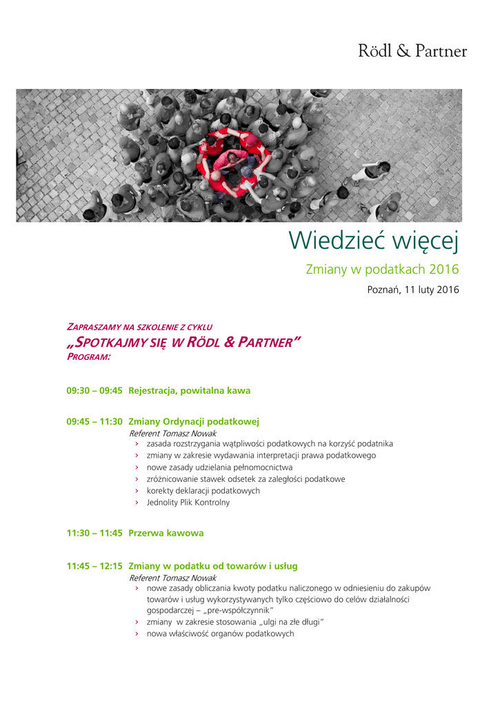 Wiedzieć więcej Zmiany w podatkach 2016 Poznań, 11 luty 2016 ZAPRASZAMY NA SZKOLENIE Z CYKLU „SPOTKAJMY SIĘ W RÖDL & PARTNER” PROGRAM: 09:30 – 09:45 Rejestracja, powitalna kawa 09:45 – 11:30 Zmiany Ordynacji podatkowej Referent Tomasz Nowak › › › › › › zasada rozstrzygania wątpliwości podatkowych na korzyść podatnika zmiany w zakresie wydawania interpretacji prawa podatkowego nowe zasady udzielania pełnomocnictwa zróżnicowanie stawek odsetek za zaległości podatkowe korekty deklaracji podatkowych Jednolity Plik Kontrolny 11:30 – 11:45 Przerwa kawowa 11:45 – 12:15 Zmiany w podatku od towarów i usług Referent Tomasz Nowak › nowe zasady obliczania kwoty podatku naliczonego w odniesieniu do zakupów towarów i usług wykorzystywanych tylko częściowo do celów działalności gospodarczej – „pre-współczynnik” › zmiany w zakresie stosowania „ulgi na złe długi” › nowa właściwość organów podatkowych 12:15 – 13:30 Podatek dochodowy od osób prawnych Referent Izabela Karolak › określenie zasad korygowania przychodów oraz kosztów uzyskania przychodów › likwidacja obowiązku zmniejszenia kosztów uzyskania przychodów o nieuregulowane kwoty › klauzula zapobiegająca nadużyciom w przypadku zwolnienia od opodatkowania dochodów z dywidend i innych przychodów z tytułu udziału w zyskach osób prawnych › ulga z tytułu ponoszenia kosztów na działalność badawczo – rozwojową › pozostałe zmiany Podatek dochodowy od osób fizycznych Referent Izabela Karolak › określenie zasad korygowania przychodów oraz kosztów uzyskania przychodów › likwidacja obowiązku zmniejszenia kosztów uzyskania przychodów o nieuregulowane kwoty › zwolnienia od podatku › opodatkowanie odpraw i odszkodowań z tytułu zakazu konkurencji › opodatkowanie przychodów nieznajdujących pokrycia w ujawnionych źródłach oraz pochodzących ze źródeł nieujawnionych › obowiązek sporządzania informacji o odsetkach › ulga z tytułu ponoszenia kosztów na działalność badawczo – rozwojową › pozostałe zmiany 13:30 – 14:30 Zimny bufet i rozmowy Zmiany w podatkach 2016 Poznań, 11 luty 2016 PROWADZĄCY Absolwentka Wydziału Ekonomii Uniwersytetu Ekonomicznego w Poznaniu. Posiadając certyfikat usługowego prowadzenia ksiąg rachunkowych łączy wiedzę z zakresu rachunkowości i prawa podatkowego. Doświadczenie zawodowe zdobywała podczas pracy w biurach rachunkowych oraz pełniąc funkcję kierownika zespołu w koncernie międzynarodowym. Posługuje się językiem niemieckim. Izabela Karolak Doradca podatkowy tel.: + 48 61 624 49 26 e-mail: [email protected] Tomasz Nowak Konsultant podatkowy tel.: + 48 61 624 49 08 e-mail: [email protected] Pan Tomasz Nowak jest konsultantem podatkowym. Swoją drogę zawodową w Rödl & Partner poprzedził zdobyciem kilkuletniego doświadczenia zarówno w pracy w organach skarbowych, jak i w spółkach na stanowisku specjalisty ds. podatków. Pan Nowak jest absolwentem Wydziału Prawa i Administracji Uniwersytetu Szczecińskiego, ukończył też studia podyplomowe z zakresu prawa i podatków na Wydziale Prawa i Administracji Uniwersytetu Warszawskiego. Pan Nowak doradza klientom w zakresie bieżącego doradztwa podatkowego, w szczególności w zakresie podatku od towarów i usług. Bierze również udział w postępowaniach przed organami skarbowymi. TERMIN I ZGŁOSZENIA Spotkanie zostanie przeprowadzone w języku polskim w dniu 11 luty 2016. w godzinach 9:30-14:30 w biurze Rödl & Partner w Poznaniu, ul. Górki 7. Zgłoszenia przyjmuje: Agnieszka Ogórkiewicz fax: + 48 61 864 49 00 e-mail: [email protected] Termin nadsyłania zgłoszeń upływa 8 lutego 2016. Koszt uczestnictwa wynosi: 200 zł + 23% VAT za osobę. Dla klientów Rödl & Partner koszt uczestnictwa wynosi 100 zł + 23% VAT. Uczestnikom zapewniamy przerwy kawowe oraz zimny bufet. Informujemy także, że ilość miejsc jest ograniczona, a warunkiem uczestnictwa jest otrzymanie mailem potwierdzenia o rejestracji. ZGŁOSZENIE Zmiany w podatkach 2016 Poznań, 11 luty 2016, 9:30-14:30 ………………………………………………………………………………………………...... firma ………………………………………………………………………………………………...... imię i nazwisko uczestnika ………………………………………………… . e-mail ………………… telefon …………….. fax ………………………………………………………………………………………………...... adres: ulica, numer ……………………………………………………………… adres: miasto ……………………….......... kod pocztowy …………………… data ……………………...... podpis Zgłoszenia przyjmujemy: mailem na adres: faksem na numer: [email protected] +48 61 864 49 00 Warunkiem uczestnictwa jest otrzymanie mailem potwierdzenia o zarejestrowaniu uczestnika. Koszt uczestnictwa wynosi 200 PLN + VAT za osobę. Dla klientów Rödl & Partner koszt uczestnictwa wynosi 100 zł + 23% VAT za osobę. Uczestnikom zapewniamy przerwy kawowe oraz zimny bufet. Informujemy, że ilość miejsc jest ograniczona. Decyduje kolejność zgłoszeń. Wysłanie zgłoszenia jest równoznaczne z akceptacją przetwarzania danych osobowych i kontaktowych do celów związanych ze szkoleniami jak również promocją usług spółek grupy Rödl & Partner.