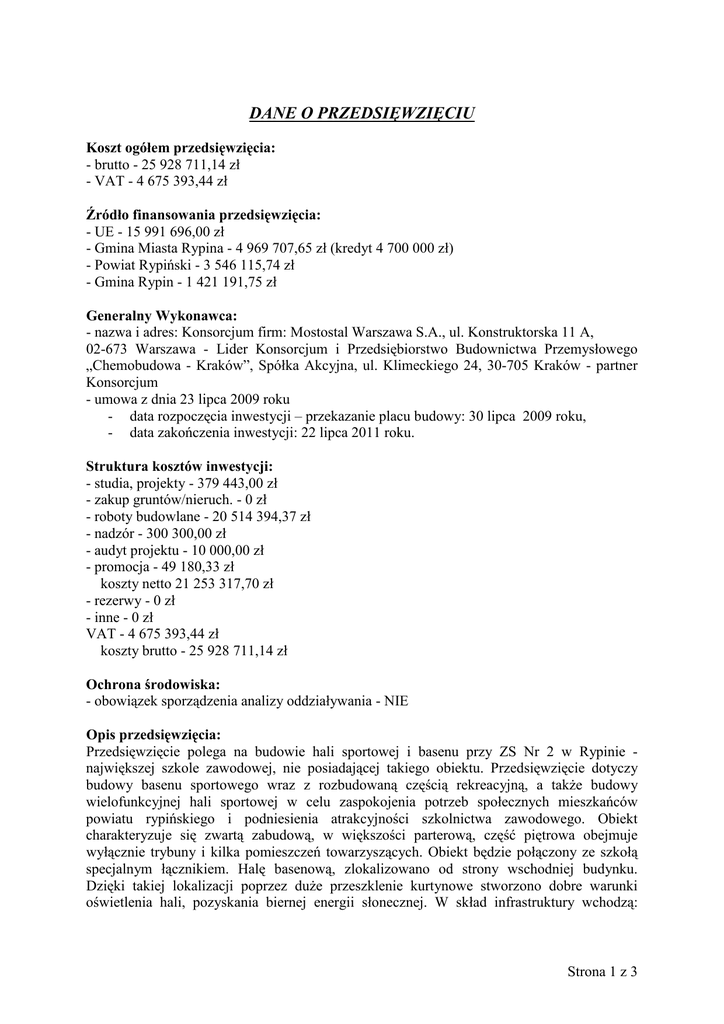 DANE O PRZEDSIĘWZIĘCIU Koszt ogółem przedsięwzięcia: - brutto - 25 928 711,14 zł - VAT - 4 675 393,44 zł Źródło finansowania przedsięwzięcia: - UE - 15 991 696,00 zł - Gmina Miasta Rypina - 4 969 707,65 zł (kredyt 4 700 000 zł) - Powiat Rypiński - 3 546 115,74 zł - Gmina Rypin - 1 421 191,75 zł Generalny Wykonawca: - nazwa i adres: Konsorcjum firm: Mostostal Warszawa S.A., ul. Konstruktorska 11 A, 02-673 Warszawa - Lider Konsorcjum i Przedsiębiorstwo Budownictwa Przemysłowego „Chemobudowa - Kraków”, Spółka Akcyjna, ul. Klimeckiego 24, 30-705 Kraków - partner Konsorcjum - umowa z dnia 23 lipca 2009 roku - data rozpoczęcia inwestycji – przekazanie placu budowy: 30 lipca 2009 roku, - data zakończenia inwestycji: 22 lipca 2011 roku. Struktura kosztów inwestycji: - studia, projekty - 379 443,00 zł - zakup gruntów/nieruch. - 0 zł - roboty budowlane - 20 514 394,37 zł - nadzór - 300 300,00 zł - audyt projektu - 10 000,00 zł - promocja - 49 180,33 zł koszty netto 21 253 317,70 zł - rezerwy - 0 zł - inne - 0 zł VAT - 4 675 393,44 zł koszty brutto - 25 928 711,14 zł Ochrona środowiska: - obowiązek sporządzenia analizy oddziaływania - NIE Opis przedsięwzięcia: Przedsięwzięcie polega na budowie hali sportowej i basenu przy ZS Nr 2 w Rypinie największej szkole zawodowej, nie posiadającej takiego obiektu. Przedsięwzięcie dotyczy budowy basenu sportowego wraz z rozbudowaną częścią rekreacyjną, a takŜe budowy wielofunkcyjnej hali sportowej w celu zaspokojenia potrzeb społecznych mieszkańców powiatu rypińskiego i podniesienia atrakcyjności szkolnictwa zawodowego. Obiekt charakteryzuje się zwartą zabudową, w większości parterową, część piętrowa obejmuje wyłącznie trybuny i kilka pomieszczeń towarzyszących. Obiekt będzie połączony ze szkołą specjalnym łącznikiem. Halę basenową, zlokalizowano od strony wschodniej budynku. Dzięki takiej lokalizacji poprzez duŜe przeszklenie kurtynowe stworzono dobre warunki oświetlenia hali, pozyskania biernej energii słonecznej. W skład infrastruktury wchodzą: Strona 1 z 3 basen sportowy (12,5 x 25 m), basen rekreacyjny (12,5 x 15 m) z atrakcjami i brodzikiem dla dzieci. Konstrukcja niecek przewidziana jest ze stali nierdzewnej. ZjeŜdŜalnia, będąca wyposaŜeniem obiektu, posiada wieŜę wyprowadzoną ponad dach i zewnętrzną zjeŜdŜalnię rurową z basenem halowym. Widownia basenu posiada 168 miejsca i wydzielone pomieszczenia komentatora. Hala wielofunkcyjna sportowa posiada arenę sportową z układem boisk o wielkości pozwalającej na organizację zwodów sportowych rangi krajowej. Zaprojektowano układ trzech boisk dla uczniów oddzielonych od siebie kurtynami przesuwnymi. Widownia została zlokalizowana ponad zespołem pomieszczeń szatniowych, posiada ona 304 miejsca siedzące. Uzupełniająco na poziomie areny przewidziano miejsca na trybunę składaną na 168 miejsc. Hala sportowa posiada niezaleŜnie wejście. Łączna ilość miejsc na widowni wynosi 472. Dane techniczne projektowanego obiektu przedstawiają się następująco: - basen sportowy 12,5 x 25 m z rozbudowaną częścią rekreacyjną (basen ok.12,5 x 15 m, zjeŜdŜalnia z basenem, jacuzzi), widownia na 168 miejsc, - wielofunkcyjna hala sportowa z układem boisk pozwalającym na prowadzenie zawodów o randze krajowej, z moŜliwością wydzielenia trzech boisk poprzecznych oddzielonych kurtynami przesuwnymi dla potrzeb młodzieŜy szkolnej, stałą widownią na 304 miejsca i 168 miejsc na trybunie składanej, -dwa zespoły saun, sala do ćwiczeń gimnastycznych, siłownia, - kręgielnia, - bar z pełnym zapleczem kuchennym, - niezbędne zaplecza techniczne. Korzyści/beneficjenci przedsięwzięcia: W wyniku realizacji przedsięwzięcia korzyści odniosą następujące grupy odbiorców projektu: - Województwo kujawsko - pomorskie, - Gmina Miasta Rypina, - Gmina Rypin, - Powiat Rypiński, - mieszkańcy powiatu rypińskiego, - młodzieŜ, - zawodnicy sekcji i klubów pływackich, - przedstawiciele innych dyscyplin sportu, - uczniowie regionu. Korzyści społeczno-ekonomiczne dla miasta Rypina: poprawa bazy edukacyjnej oraz sportowej w mieście, podniesienie standardu usług edukacyjnych oferowanych na terenie miasta, poprawa wizerunku miasta, jako jednostki, na której terenie funkcjonują nowoczesne obiekty infrastruktury społecznej, podniesienie poziomu absorpcji funduszy strukturalnych. Korzyści dla mieszkańców miasta Rypina, Gminy Rypin oraz Powiatu Rypińskiego i Województwa: podniesienie poziomu usług edukacyjnych i sportowych oferowanych przez ZS Nr 2. Korzyści dla mieszkańców: zapewnienie komfortowych warunków edukacji i sportu, poprawa dostępności do nowoczesnej infrastruktury sportowej i edukacyjnej, zapewnienie wysokiej jakości oraz nowoczesnych standardów edukacji sportowej, dostęp do nowoczesnych form kształcenia i wychowania. Strona 2 z 3 Korzyści dla pracowników ZS Nr 2: zapewnienie bazy do rozwoju edukacji i kształcenia, poprawa warunków nauczania, podniesienie wiedzy i umiejętności w kontekście realizacji projektu dofinansowanego ze środków Europejskiego Funduszu Rozwoju Regionalnego w ramach RPO WK -P 2007- 2013. Realizacja przedmiotowego projektu ma ogromne znaczenie dla rozwoju Rypina. W perspektywie długofalowej inwestycja samorządów, przyczyni się do wzrostu jakości dostępnej oferty edukacyjnej w regionie. Planowana inwestycja stworzy trwałe podstawy rozwoju sportu i edukacji na terenie Rypina dla samorządów i całego regionu, co będzie skutkowało szeregiem wymiernych korzyści społecznych i ekonomicznych. NaleŜy, zatem stwierdzić, iŜ wnioskowany projekt jest uzasadniony z ekonomicznego oraz społecznego punktu widzenia. Główne korzyści i koszty społeczno - ekonomiczne związane z realizacją projektu to: wzrost liczby potencjalnych osób korzystających w nowoczesnej bazy edukacyjno-sportowej, rozwój nowoczesnego zakresu usług edukacyj