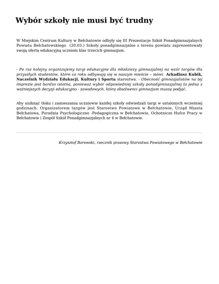 Wybór szkoły nie musi być trudny W Miejskim Centrum Kultury w Bełchatowie odbyły się III Prezentacje Szkół Ponadgimnazjalnych Powiatu Bełchatowskiego (20.03.) Szkoły ponadgimnazjalne z terenu powiatu zaprezentowały swoją ofertę edukacyjną uczniom klas trzecich gimnazjum. - Po raz kolejny organizujemy targi edukacyjne dla młodzieży gimnazjalnej na wzór targów dla przyszłych studentów, które co roku odbywają się w naszym mieście – mówi Arkadiusz Kubik, Naczelnik Wydziału Edukacji, Kultury i Sportu starostwa. - Obecność gimnazjalistów na tej imprezie jest bardzo istotna, ponieważ wybór odpowiedniej szkoły ponadgimnazjalnej to jedna z ważniejszych decyzji edukacyjno - zawodowych, którą absolwenci gimnazjum muszą podjąć. Aby uniknąć tłoku i zamieszania uczniowie każdej szkoły odwiedzali targi w ustalonych wcześniej godzinach. Organizatorem targów jest Starostwo Powiatowe w Bełchatowie, Urząd Miasta Bełchatowa, Poradnia Psychologiczno -Pedagogiczna w Bełchatowie, Ochotnicze Hufce Pracy w Bełchatowie i Zespół Szkół Ponadgimnazjalnych nr 4 w Bełchatowie. Krzysztof Borowski, rzecznik prasowy Starostwa Powiatowego w Bełchatowie