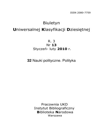 ISSN 2080-7759 Biuletyn Uniwersalnej Klasyfikacji Dziesiętnej R. 3 Nr 13 Styczeń- luty 2010 r. 32 Nauki polityczne. Polityka Pracownia UKD Instytut Bibliograficzny Biblioteka Narodowa Warszawa Aktualności 1. W wydawnictwie Biblioteki Narodowej w ramach serii Prace Instytutu Bibliograficznego opublikowana została książka autorstwa Jolanty Hys pt. Pragmatyka Języka Haseł Przedmiotowych Biblioteki Narodowej i Uniwersalnej Klasyfikacji Dziesiętnej w Przewodniku Bibliograficznym. Zawarte w rozprawie rozważania odnoszą się do okresu przed 2007 r. Poddano analizie decyzje stosowania JHP BN i UKD stosowane w opracowaniu rzeczowym książek w „Przewodniku Bibliograficznym” w okresie od 1997 r. do 2007 r. W miarę możliwości w przypisach podane zostały dane zaktualizowane, stan na 2009 r. Analiza przykładów użycia JHP BN i UKD miała na celu wyodrębnienie i nazwanie kategorii reguł pragmatycznych obydwu języków. Celem przedstawionych analiz jest opisanie mechanizmów funkcjonowania JHP BN i UKD, czyli pragmatyki obydwu języków. Publikacja nie ma charakteru poradnika. W bieżącym opracowaniu należy korzystać z materiałów dostępnych na stronie BN w zakładce dla bibliotekarzy – JHP BN oraz w zakładce dla bibliotekarzy – UKD. 2. UDC SUMMARY Pracownia UKD w ramach współpracy z Konsorcjum UKD przygotowała wykaz polskich odpowiedników słownych do wybranych symboli UKD (symboli MRF). Opracowano odpowiedniki słowne do poddziałów wspólnych oraz odpowiedniki słowne dla działów od 0 Dział ogólny do 624 Inżynieria lądowa. Termin ukończenia prac przewidziano na czerwiec 2010. Summary UDC przygotowywane jest już w 17 językach. http://universaldecimalclassification.blogspot.com/ 3. W czwartym numerze „Bibliotekarza” ukazał się artykuł autorstwa Jolanty Hys i Joanny Kwiatkowskiej „Stosowanie UKD w polskich bibliotekach - analiza ankiety”. Pracownia Uniwersalnej Klasyfikacji Dziesiętnej przygotowała i zanalizowała ankietę nt. stosowania UKD w bibliotekach polskich. Odpowiedzi od respondentów zostały nadesłane w okresie od października 2008 r. do października 2009 r. Otrzymano 62 wypełnione ankiety, w tym: - 23 ankiety z bibliotek publicznych, - 15 ankiet z bibliotek szkół wyższych, - 14 ankiet z bibliotek pedagogicznych, - 7 ankiet z bibliotek szkolnych, - 2 ankiety z bibliotek fachowych, - 1 ankietę z biblioteki towarzystwa naukowego. 25 20 publiczne 15 szkół wyższych pedagogiczne 10 5 szkolne inne 0 Jedno z pytań, na które uzyskano w ankiecie odpowiedź, dotyczyło korzystania z Biuletynu UKD - 45 spośród 62 bibliotek potwierdziło jego wykorzystanie w codziennej pracy. 4. Na pierwszym spotkaniu Komisji ds. UKD (25 listopada 2009 r.) gościłyśmy wysokiej klasy specjalistę z Biblioteki Narodowej Czech p. Marie Balikova. W swoim wystąpieniu opowiedziała o katalogu online Biblioteki Narodowej Czech i kartotece wzorcowej CZENAS. 26 listopada na konferencji „Cyfrowość bibliotek i archiwów” p. Maria Balikova wygłosiła referat pt. Subject access in Czecha. Jest on dostępny na stronie BN w zakładce dla bibliotekarzy - JHP BN - Konferencja Cyfrowość bibliotek i archiwów. http://www.bn.org.pl/download/document/1260454592.ppt 5. W nr 3 Biuletynu UKD (Dwukropek podwójny) markery genetyczne mylnie zakwalifikowano do działu 591.15::575. Prawidłowy zapis został umieszczony w nr 11 Biuletynu UKD: 575.1.08 Markery genetyczne W nr 7 Biuletynu UKD (Dział 34 Prawo. Dział 351/354 Administracja publiczna) prawo reklamy mylnie zakwalifikowano do działu 347.77:659.1. Prawidłowy zapis: 346.54:659.1 Reklama - prawo W nr 7 Biuletynu UKD (Dział 34 Prawo. Dział 351/354 Administracja publiczna) prawo radiofonii i telewizji zostało mylnie zakwalifikowane do 351.751:654.195+654.197. Prawidłowy zapis: 351.81:654.195+654.1971; 351.81:654.195 Prawo radiofonii; 351.81:654.197 Prawo telewizji. BIULETYN UKD Biuletyn Uniwersalnej Klasyfikacji Dziesiętnej (Biuletyn UKD) jest dwumiesięcznikiem, wydawanym w wersji elektronicznej, ukazującym się na stronie www.bn.org.pl w zakładce Dla Bibliotekarzy. Biuletyn UKD jest redagowany przez pracowników Pracowni Uniwersalnej Klasyfikacji Dziesiętnej. Metoda tworzenia symboli UKD jest prezentowana w MRF, "Extensions and Corrections to the UDC" i w wydanym w 2007 r. podręczniku "The Universal Decimal Classification: a guide to its use" autorstwa I.C. McIlwaine. Na tej podstawie budowana jest metodyka tworzenia symboli UKD, prezentowana w Biuletynie UKD. Do umieszczonych w Biuletynie UKD symboli dopisywane są odpowiedniki słowne zaczerpnięte z MRF i z języka naturalnego oraz odpowiedniki słowne, równoważne z JHP BN (zapisywane kursywą). W Biuletynie UKD prezentowane są odpowiedniki słowne do symboli UKD, jako uzupełnienie odpowiedników słownych do tablic skróconych, np. 1 351.817 Supervision of telecommunications. Details by …:654 w tablicach P058 symbol 001.94 Opisywanie zjawisk niewyjaśnionych całkowicie, w Biuletynie UKD 001.94 Opisywanie zjawisk niewyjaśnionych całkowicie. Istoty pozaziemskie. W Biuletynie UKD umieszczone są reguły pragmatyczne (noty stosowania, uwagi stosowania, decyzje stosowania) zalecane - rozpowszechniane w celu zastosowania. Stanowią one uzupełnienie do tablic P058. W Biuletynie UKD przedstawiono przyjęte (obligatoryjne) dla "Przewodnika Bibliograficznego", a sugerowane (postulowane) dla bibliotek rozwiązania. Istnieje możliwość przeszukiwania Biuletynu UKD przez odpowiedniki słowne i symbole UKD (Ctrl+F). BIULETYN UKD NR 13 32 NAUKI POLITYCZNE. POLITYKA 32 Nauki polityczne. Polityka 32-027.21 Filozofia polityki. Polityka – filozofia 32.019.5 Opinia publiczna. Oddziaływanie polityczne na społeczeństwo. Demagogia 316.64:32.019.5 Perswazja w polityce 930.1(091):316.64:32.019.5 Polityka historyczna 321 Formy organizacji politycznej. Państwo jako władza polityczna 321 Formy organizacji politycznej. Państwo jako władza polityczn