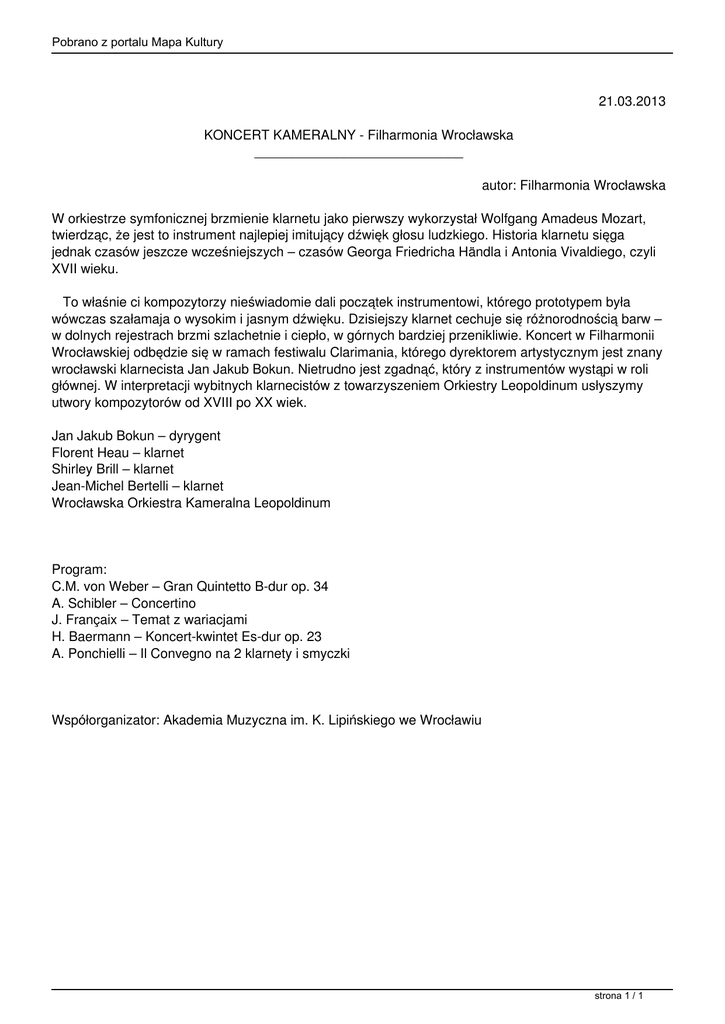 Pobrano z portalu Mapa Kultury 21.03.2013 KONCERT KAMERALNY - Filharmonia Wrocławska ____________________________ autor: Filharmonia Wrocławska W orkiestrze symfonicznej brzmienie klarnetu jako pierwszy wykorzystał Wolfgang Amadeus Mozart, twierdząc, że jest to instrument najlepiej imitujący dźwięk głosu ludzkiego. Historia klarnetu sięga jednak czasów jeszcze wcześniejszych – czasów Georga Friedricha Händla i Antonia Vivaldiego, czyli XVII wieku. To właśnie ci kompozytorzy nieświadomie dali początek instrumentowi, którego prototypem była wówczas szałamaja o wysokim i jasnym dźwięku. Dzisiejszy klarnet cechuje się różnorodnością barw – w dolnych rejestrach brzmi szlachetnie i ciepło, w górnych bardziej przenikliwie. Koncert w Filharmonii Wrocławskiej odbędzie się w ramach festiwalu Clarimania, którego dyrektorem artystycznym jest znany wrocławski klarnecista Jan Jakub Bokun. Nietrudno jest zgadnąć, który z instrumentów wystąpi w roli głównej. W interpretacji wybitnych klarnecistów z towarzyszeniem Orkiestry Leopoldinum usłyszymy utwory kompozytorów od XVIII po XX wiek. Jan Jakub Bokun – dyrygent Florent Heau – klarnet Shirley Brill – klarnet Jean-Michel Bertelli – klarnet Wrocławska Orkiestra Kameralna Leopoldinum Program: C.M. von Weber – Gran Quintetto B-dur op. 34 A. Schibler – Concertino J. Françaix – Temat z wariacjami H. Baermann – Koncert-kwintet Es-dur op. 23 A. Ponchielli – Il Convegno na 2 klarnety i smyczki Współorganizator: Akademia Muzyczna im. K. Lipińskiego we Wrocławiu strona 1 / 1