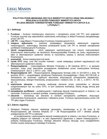 POLITYKA PODEJMOWANIA DECYZJI INWESTYCYJNYCH ORAZ SKŁADANIA I REALIZACJI ZLECEŃ FUNDUSZY INWESTYCYJNYCH W LEGG MASON TOWARZYSTWIE FUNDUSZY INWESTYCYJNYCH S.A. („Polityka”) § 1. Definicje 1. Fundusz - fundusz inwestycyjny utworzony i zarządzany przez LM TFI; pod pojęciem Fundusz rozumie się odpowiednio subfundusz wchodzący w skład Funduszu zarządzanego przez LM TFI; 2. LM TFI - Legg Mason Towarzystwo Funduszy Inwestycyjnych S.A.; 3. miejsce wykonania – podmiot, posiadający zezwolenie właściwych organów nadzorujących, wykonujący zlecenie przekazane przez LM TFI w ramach zarządzania portfelami inwestycyjnymi Funduszy; 4. obrót zorganizowany - obrót papierami wartościowymi lub innymi instrumentami finansowymi dokonywany na terytorium Rzeczypospolitej Polskiej na rynku regulowanym albo w alternatywnym systemie obrotu w rozumieniu ustawy o obrocie instrumentami finansowymi; 5. pośrednik - firma inwestycyjna lub bank; 6. rynek OTC (ang. over the counter market) - rynek niebędący rynkiem regulowanym lub alternatywnym systemem obrotu; 7. Rozporządzenie – rozporządzenie Ministra Finansów z 30 kwietnia 2013 r. w sprawie sposobu, trybu oraz warunków prowadzenia działalności przez towarzystwa funduszy inwestycyjnych (Dz.U. z 2013 r, poz. 538); 8. Rozporządzenie 231 - Rozporządzenie delegowane Komisji (UE) nr 231/2013 z dnia 19 grudnia 2012 r. uzupełniające dyrektywę Parlamentu Europejskiego i Rady 2011/61/UE w odniesieniu do zwolnień, ogólnych warunków dotyczących prowadzenia działalności, depozytariuszy, dźwigni finansowej, przejrzystości i nadzoru (Dz. U. UE. L. z 2013 r. Nr 83, str. 1); 9. wykonanie zlecenia - oznacza realizację zlecenia przez pośrednika w obrocie zorganizowanym lub na rynku OTC, w tym zawarcie transakcji, której drugą stroną jest pośrednik; 10. zarządzanie portfelami - podejmowanie i realizacja decyzji inwestycyjnych w imieniu i na rachunek Funduszu w ramach portfela inwestycyjnego Funduszu; 11. zlecenie - transakcja lub zlecenie w ramach zarządzania portfelami, dotyczące instrumentów finansowych, zawierana / składana przez Fundusz reprezentowany przez LM TFI jako organ Funduszu. § 2. Zakres regulacji 1. Niniejsza Polityka stanowi realizację obowiązku określonego w § 29 oraz § 33 Rozporządzenia, jak również Artykułu 27 – 29 Rozporządzenia 231 i określa zasady postępowania LM TFI w zakresie: a) podejmowania i wykonywania decyzji inwestycyjnych w imieniu i na rzecz Funduszy, w najlepiej pojętym ich interesie i w celu zapewnienia zgodności z celami inwestycyjnymi i polityką inwestycyjną Funduszu, którego aktywów dotyczy decyzja, przy uwzględnieniu limitów ryzyka dotyczących każdego Funduszu, Strona 1 z 7 b) składania i realizacji zleceń Funduszy, uwzględniając cenę instrumentu finansowego, koszty związane z wykonaniem zlecenia, czas zawarcia transakcji, prawdopodobieństwo zawarcia transakcji i jej rozliczenia, wielkość zlecenia, jego charakter oraz inne czynniki, które mają istotny wpływ na świadczoną usługę, c) alokacji zleceń. 2. Z zastrzeżeniem ust. 3, Polityka ma zastosowanie do wszystkich instrumentów finansowych, które mogą być nabywane do portfela inwestycyjnego każdego Funduszu zgodnie z jego statutem i dokumentem ofertowym (prospekt informacyjny, prospekt emisyjny, warunki emisji lub inny wymagany przepisami prawa dokument). 3. Polityka nie ma zastosowania do transakcji pożyczek, niewystandaryzowanych instrumentów pochodnych. Ponadto, w przypadku tytułów uczestnictwa w instytucjach zbiorowego inwestowania LM TFI nie ma najczęściej możliwości wyboru miejsca wykonania, gdyż zlecenia są kierowane do wskazanego przez dane towarzystwo funduszy inwestycyjnych agenta transferowego. § 3. Zasady Ogólne 1. LM TFI koncentruje się na uzyskaniu możliwie najlepszych wyników na zarządzanych portfelach inwestycyjnych Funduszy. Podjęcie decyzji dotyczących wyboru i dokonania lokaty w imieniu i na rzecz Funduszu LM TFI powinno być poprzedzone analizą uwarunkowań rynkowych i prawnych oraz oszacowaniem ryzyk związanych z planowaną lokatą. Wykonanie analizy uwarunkowań rynkowych i prawnych nie jest konieczne, jeśli decyzja inwestycyjna jest zgodna ze strategią inwestycyjną dla danego funduszu, a inwestycja dokonywana w wyniku decyzji inwestycyjnej nie jest nową kategorią lokat oraz nie jest dokonywana na nowym rynku na którym LM TFI dotychczas nie dokonywało lokat. 2. Decyzje inwestycyjne w imieniu i na rzecz Funduszy są podejmowane kolegialnie przez zespół zarządzających. W procesie podejmowania decyzji inwestycyjnych uczestniczy doradca inwestycyjny. 3. W przypadku decyzji inwestycyjnych związanych z napływami środków, których wielkość ma istotne znaczenie dla struktury portfela Funduszu, LM TFI preferuje nabywanie płynnych papierów wartościowych oraz takich, które przeszły wcześniej pozytywną weryfikację i już znajdują się w portfelu Funduszu, ale ostateczna decyzja inwestycyjna podejmowana przez zarządzających funduszami uwzględnia także sytuację rynkową, limity i ograniczenia wynikające z regulacji prawnych i zapisów statutowych oraz sytuację płynnościową Funduszu. 4. W przypadku decyzji inwestycyjnych związanych z umorzeniami środków, których wielkość ma istotne znaczenie dla struktury portfela Funduszu, LM TFI stara się sprzedawać instrumenty finansowe tak, aby nie naruszać struktury płynnościowej Funduszu i nie wpływać istotnie na wycenę tych aktywów, ale ostateczna decyzja inwestycyjna podejmowana przez zarządzających funduszami uwzględnia także sytuację rynkową, limity i ograniczenia wynikające z regulacji prawnych i zapisów statutowych oraz sytuację płynnościową Funduszu. 5. LM TFI nie gwarantuje uzyskania najlepszej możliwej ceny we wszelkich okolicznościach i w każdym wypadku, np. gdy różnice w obowiązujących cenach i ponoszonych kosztach wykonania zleceń są nieznaczne dla p