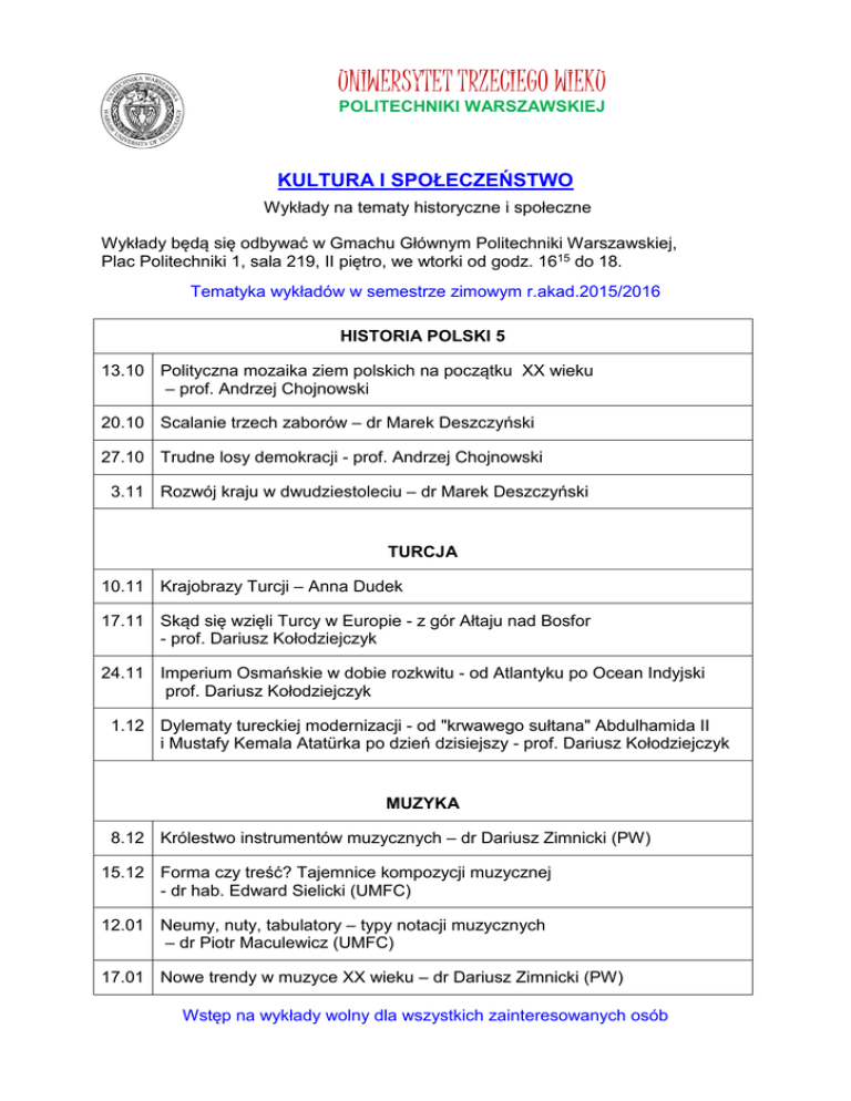 UNIWERSYTET TRZECIEGO WIEKU POLITECHNIKI WARSZAWSKIEJ KULTURA I SPOŁECZEŃSTWO Wykłady na tematy historyczne i społeczne Wykłady będą się odbywać w Gmachu Głównym Politechniki Warszawskiej, Plac Politechniki 1, sala 219, II piętro, we wtorki od godz. 1615 do 18. Tematyka wykładów w semestrze zimowym r.akad.2015/2016 HISTORIA POLSKI 5 13.10 Polityczna mozaika ziem polskich na początku XX wieku – prof. Andrzej Chojnowski 20.10 Scalanie trzech zaborów – dr Marek Deszczyński 27.10 Trudne losy demokracji - prof. Andrzej Chojnowski 3.11 Rozwój kraju w dwudziestoleciu – dr Marek Deszczyński TURCJA 10.11 Krajobrazy Turcji – Anna Dudek 17.11 Skąd się wzięli Turcy w Europie - z gór Ałtaju nad Bosfor - prof. Dariusz Kołodziejczyk 24.11 Imperium Osmańskie w dobie rozkwitu - od Atlantyku po Ocean Indyjski prof. Dariusz Kołodziejczyk 1.12 Dylematy tureckiej modernizacji - od "krwawego sułtana" Abdulhamida II i Mustafy Kemala Atatürka po dzień dzisiejszy - prof. Dariusz Kołodziejczyk MUZYKA 8.12 Królestwo instrumentów muzycznych – dr Dariusz Zimnicki (PW) 15.12 Forma czy treść? Tajemnice kompozycji muzycznej - dr hab. Edward Sielicki (UMFC) 12.01 Neumy, nuty, tabulatory – typy notacji muzycznych – dr Piotr Maculewicz (UMFC) 17.01 Nowe trendy w muzyce XX wieku – dr Dariusz Zimnicki (PW) Wstęp na wykłady wolny dla wszystkich zainteresowanych osób
