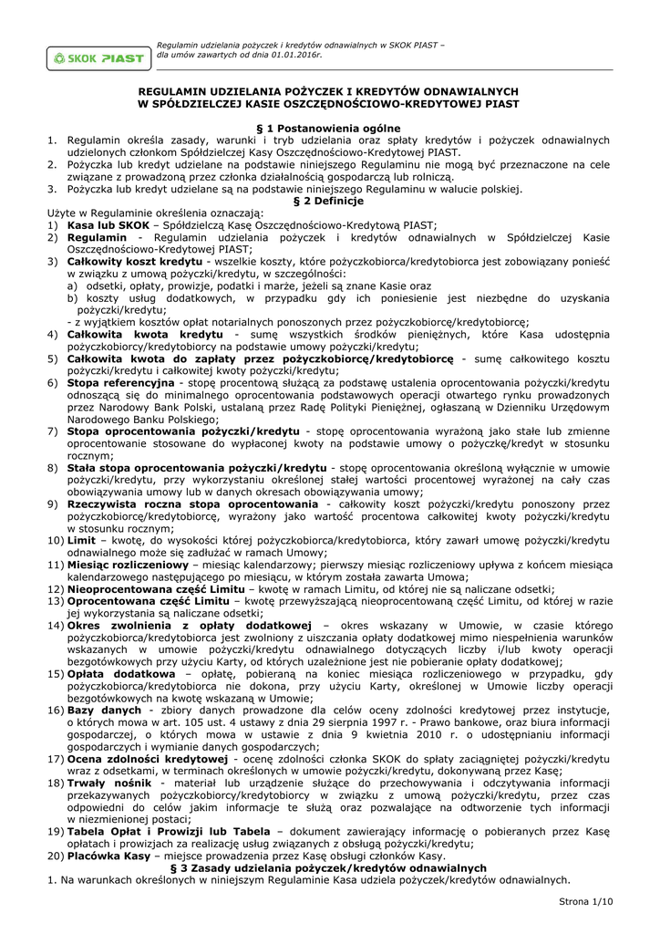 Regulamin udzielania pożyczek i kredytów odnawialnych w SKOK PIAST – dla umów zawartych od dnia 01.01.2016r. REGULAMIN UDZIELANIA POŻYCZEK I KREDYTÓW ODNAWIALNYCH W SPÓŁDZIELCZEJ KASIE OSZCZĘDNOŚCIOWO-KREDYTOWEJ PIAST § 1 Postanowienia ogólne 1. Regulamin określa zasady, warunki i tryb udzielania oraz spłaty kredytów i pożyczek odnawialnych udzielonych członkom Spółdzielczej Kasy Oszczędnościowo-Kredytowej PIAST. 2. Pożyczka lub kredyt udzielane na podstawie niniejszego Regulaminu nie mogą być przeznaczone na cele związane z prowadzoną przez członka działalnością gospodarczą lub rolniczą. 3. Pożyczka lub kredyt udzielane są na podstawie niniejszego Regulaminu w walucie polskiej. § 2 Definicje Użyte w Regulaminie określenia oznaczają: 1) Kasa lub SKOK – Spółdzielczą Kasę Oszczędnościowo-Kredytową PIAST; 2) Regulamin - Regulamin udzielania pożyczek i kredytów odnawialnych w Spółdzielczej Kasie Oszczędnościowo-Kredytowej PIAST; 3) Całkowity koszt kredytu - wszelkie koszty, które pożyczkobiorca/kredytobiorca jest zobowiązany ponieść w związku z umową pożyczki/kredytu, w szczególności: a) odsetki, opłaty, prowizje, podatki i marże, jeżeli są znane Kasie oraz b) koszty usług dodatkowych, w przypadku gdy ich poniesienie jest niezbędne do uzyskania pożyczki/kredytu; - z wyjątkiem kosztów opłat notarialnych ponoszonych przez pożyczkobiorcę/kredytobiorcę; 4) Całkowita kwota kredytu - sumę wszystkich środków pieniężnych, które Kasa udostępnia pożyczkobiorcy/kredytobiorcy na podstawie umowy pożyczki/kredytu; 5) Całkowita kwota do zapłaty przez pożyczkobiorcę/kredytobiorcę - sumę całkowitego kosztu pożyczki/kredytu i całkowitej kwoty pożyczki/kredytu; 6) Stopa referencyjna - stopę procentową służącą za podstawę ustalenia oprocentowania pożyczki/kredytu odnoszącą się do minimalnego oprocentowania podstawowych operacji otwartego rynku prowadzonych przez Narodowy Bank Polski, ustalaną przez Radę Polityki Pieniężnej, ogłaszaną w Dzienniku Urzędowym Narodowego Banku Polskiego; 7) Stopa oprocentowania pożyczki/kredytu - stopę oprocentowania wyrażoną jako stałe lub zmienne oprocentowanie stosowane do wypłaconej kwoty na podstawie umowy o pożyczkę/kredyt w stosunku rocznym; 8) Stała stopa oprocentowania pożyczki/kredytu - stopę oprocentowania określoną wyłącznie w umowie pożyczki/kredytu, przy wykorzystaniu określonej stałej wartości procentowej wyrażonej na cały czas obowiązywania umowy lub w danych okresach obowiązywania umowy; 9) Rzeczywista roczna stopa oprocentowania - całkowity koszt pożyczki/kredytu ponoszony przez pożyczkobiorcę/kredytobiorcę, wyrażony jako wartość procentowa całkowitej kwoty pożyczki/kredytu w stosunku rocznym; 10) Limit – kwotę, do wysokości której pożyczkobiorca/kredytobiorca, który zawarł umowę pożyczki/kredytu odnawialnego może się zadłużać w ramach Umowy; 11) Miesiąc rozliczeniowy – miesiąc kalendarzowy; pierwszy miesiąc rozliczeniowy upływa z końcem miesiąca kalendarzowego następującego po miesiącu, w którym została zawarta Umowa; 12) Nieoprocentowana część Limitu – kwotę w ramach Limitu, od której nie są naliczane odsetki; 13) Oprocentowana część Limitu – kwotę przewyższającą nieoprocentowaną część Limitu, od której w razie jej wykorzystania są naliczane odsetki; 14) Okres zwolnienia z opłaty dodatkowej – okres wskazany w Umowie, w czasie którego pożyczkobiorca/kredytobiorca jest zwolniony z uiszczania opłaty dodatkowej mimo niespełnienia warunków wskazanych w umowie pożyczki/kredytu odnawialnego dotyczących liczby i/lub kwoty operacji bezgotówkowych przy użyciu Karty, od których uzależnione jest nie pobieranie opłaty dodatkowej; 15) Opłata dodatkowa – opłatę, pobieraną na koniec miesiąca rozliczeniowego w przypadku, gdy pożyczkobiorca/kredytobiorca nie dokona, przy użyciu Karty, określonej w Umowie liczby operacji bezgotówkowych na kwotę wskazaną w Umowie; 16) Bazy danych - zbiory danych prowadzone dla celów oceny zdolności kredytowej przez instytucje, o których mowa w art. 105 ust. 4 ustawy z dnia 29 sierpnia 1997 r. - Prawo bankowe, oraz biura informacji gospodarczej, o których mowa w ustawie z dnia 9 kwietnia 2010 r. o udostępnianiu informacji gospodarczych i wymianie danych gospodarczych; 17) Ocena zdolności kredytowej - ocenę zdolności członka SKOK do spłaty zaciągniętej pożyczki/kredytu wraz z odsetkami, w terminach określonych w umowie pożyczki/kredytu, dokonywaną przez Kasę; 18) Trwały nośnik - materiał lub urządzenie służące do przechowywania i odczytywania informacji przekazywanych pożyczkobiorcy/kredytobiorcy w związku z umową pożyczki/kredytu, przez czas odpowiedni do celów jakim informacje te służą oraz pozwalające na odtworzenie tych informacji w niezmienionej postaci; 19) Tabela Opłat i Prowizji lub Tabela – dokument zawierający informację o pobieranych przez Kasę opłatach i prowizjach za realizację usług związanych z obsługą pożyczki/kredytu; 20) Placówka Kasy – miejsce prowadzenia przez Kasę obsługi członków Kasy. § 3 Zasady udzielania pożyczek/kredytów odnawialnych 1. Na warunkach określonych w niniejszym Regulaminie Kasa udziela pożyczek/kredytów odnawialnych. Strona 1/10 Regulamin udzielania pożyczek i kredytów odnawialnych w SKOK PIAST – dla umów zawartych od dnia 01.01.2016r. 2. Pożyczka/kredyt odnawialny otwierany jest w rachunku rozliczeniowym zwanym dalej Rachunkiem. 3. W Rachunku może zostać otwarta tylko jedna pożyczka/kredyt odnawialny. § 4 Związek małżeński 1. Udzielenie pożyczki/kredytu odnawialnego członkowi pozostającemu w związku małżeńskim może być uzależnione od poręczenia lub wyrażenia zgody na jej zaciągnięcie przez współmałżonka, chyba że pożyczka/kredyt odnawialny przeznaczony jest na zwykłe potrzeby rodziny lub pomiędz