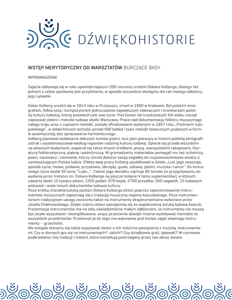 WSTĘP MERYTORYCZNY DO WARSZTATÓW BURCZĄCE BASY WPROWADZENIE Zajęcia odbywają się w roku upamiętniającym 200 rocznicę urodzin Oskara Kolberga, dlatego też jednym z celów spotkania jest przybliżenie, w sposób oczywiście dostępny dla tak małego odbiorcy, jego sylwetki. Oskar Kolberg urodził się w 1814 roku w Przysuszu, zmarł w 1890 w Krakowie. Był polskim etnografem, folklorystą i kompozytorem jednocześnie największym zbieraczem i kronikarzem polskiej kultury ludowej, której poświęcił całe swe życie. Pod koniec lat trzydziestych XIX wieku zaczął zapisywać pieśni i melodie ludowe okolic Warszawy. Prace nad dokumentacją folkloru muzycznego całego kraju wraz z zapisami melodii, zostały sfinalizowane wydanymi w 1857 roku „Pieśniami ludu polskiego”, w skład których wchodzi ponad 400 ballad i tyleż melodii tanecznych podanych w formie autentycznej, bez opracowania harmonicznego. Kolberg planował wydawanie dalszych tomów pieśni, lecz jako pierwszy w historii polskiej etnografii zebrał i usystematyzował według regionów rodzimą kulturę ludową. Opierał się przede wszystkim na własnych badaniach, wspierał się także innymi źródłami: prasą, staropolskimi rękopisami, literaturą folklorystyczną, piękną i podróżniczą. W gromadzeniu materiałów pomagali mu też ochotnicy, poeci, naukowcy i ziemianie, którzy chcieli dołożyć swoją cegiełkę do rozpowszechniania wiedzy o zamieszkującym Polskę ludzie. Efekty swej pracy Kolberg opublikował w dziele „Lud, jego zwyczaje, sposób życia, mowa, podania, przysłowia, obrzędy, gusła, zabawy, pieśni, muzyka i tańce”. Do końca swego życia wydał 33 tomy “Ludu...”. Całość jego dorobku zajmuje 85 tomów (w przygotowaniu do wydania przez Instytut im. Oskara Kolberga są jeszcze kolejne 4 tomy suplementów), w których zawarto około 12 tysięcy pieśni, 1250 podań, 670 bajek, 2700 przysłów, 350 zagadek, 15 ludowych widowisk i wiele innych dokumentów ludowej kultury. Poza krótką charakterystyką postaci Oskara Kolberga dzieci poprzez zaprezentowanie instrumentów muzycznych zapoznają się z tradycją muzyczną regionu kaszubskiego. Poza instrumentarium tradycyjnym uwagę zwrócimy także na instrumenty eksperymentalne wykonane przez Józefa Chełmowskiego. Dzięki czemu dzieci zaznajomią się ze współczesną sztuką ludową Kaszub. Prezentacja instrumentów ma na celu uświadomienie małym odbiorcom, że instrumenty nie muszą być wcale wyszukane i skomplikowane, wręcz przeciwnie dźwięki można wydobywać niemalże ze wszystkich przedmiotów. Przekonać je do tego ma wykonanie pod koniec zajęć własnego instrumentu – grzechotki. We wstępie staramy się także wypytywać dzieci o ich rodzinne powiązania z muzyką, instrumentami. Czy w domach gra się na instrumentach? Jakich? Czy dziadkowie grali, śpiewali? W rozmowie podkreślamy rolę tradycji i historii, które kształtują postrzegany przez nas obraz świata. PREZENTACJA INSTRUMENTÓW Po wprowadzeniu, przystępujemy do prezentacji instrumentów muzycznych. Te pochodzą ze zbiorów Muzeum Zachodniokaszubskiego w Bytowie i są instrumentami ludowymi związanymi z Kaszubszczyzną, które podzielić należy na dwie grupy: instrumenty tradycyjnie kaszubskie, współcześnie wchodzące w skład kapel i zespołów folklorystycznych (Diabelskie Skrzypce, Burczybas, Bazuna i Brzękadło-Parłaczka) oraz te eksperymentalne wykonane przez kaszubskiego artystę ludowego Józefa Chełmowskiego (Trepy, Trep-muzyk, Werbotrepy, Muzyknos, Oma, Brzozoliść, Sztymowy Instrument, Brzękadło, Anielski Instrument, Lajerkasta). a. Instrumenty dawne, tradycyjnie występujące na Kaszubach DIABELSKIE SKRZYPCE – szkieletem diabelskich skrzypiec jest profilowany kij, na którego szczycie osadzono głowę diabła czy chochoła w kapeluszu z przymocowanymi doń blaszkami oraz tasiemkami i wstążkami. Poniżej połowy kija umieszczono deskę mającą kształt skrzypiec, na niej znajduje się pudło rezonansowe, które ze szczytem instrumentu łączą dwie lub trzy struny z drutu. Kaszubskie diabelskie skrzypce mierzące nawet do dwóch metrów wysokości, są instrumentem perkusyjnym bez możliwości wydawania dźwięków różnej wysokości, pomimo to mogą zastępować całą orkiestrę, ponieważ brzęczą, dzwonią, grzechoczą. Dźwięki te wydaje się poprzez uderzanie dłonią lub smyczkiem w pudło rezonansowe oraz struny, a także stopą o ziemię. Dziś diabelskie skrzypce towarzyszą kapelom zespołów ludowych, dawniej tworząc wielki hałas wykorzystywane były przez kolędników i przebierańców w trakcie barwnych pochodów bożonarodzeniowych i noworocznych. BURCZYBAS – to rodzaj bębna tzw. pocieranego o beczułkowatym korpusie wykonanym z drewnianych klepek lub w innej odmianie z kawałka wydrążonego pnia. Taki drewniany korpus wzmacnia się dodatkowo poprzez „warkoczowe” wiklinowe obręcze. W jednym z denek znajduje się okrągły otwór w którym umieszcza się wiązkę końskiego włosia. Burczybas wydaje niskie i buczące dźwięki wydobywane przez pocieranie wiązki włosia energicznymi ruchami mokrymi palcami. Współcześnie burczybas akompaniuje zespołom folklorystycznym w trakcie występów. Dawniej instrument ten był wykorzystywany w trakcie obrzędów noworocznych. BAZUNA – jest mierzącym około 180 cm długości instrumentem o stożkowatym kształcie, wykonanym z wydrążonego pnia drzewa, który wzmocniono wiklinowymi „warkoczowymi” pierścieniami. Na węższym końcu umieszczono ustnik, który pozwala na muzykowanie w szerokim zakresie tonów. Trąby tego typu były znane w całej Polsce jako instrumenty sygnałowe używane przez pasterzy. Na Kaszubach nadmorskich używane przez rybaków, ostrzegały przed mgłą i niebezpieczeństwem. Współcześnie bazuna pełni funkcje pokazowe podczas różnego rodzaju świąt i uroczystości. Jest także podobnie jak burczybas i diabelskie 