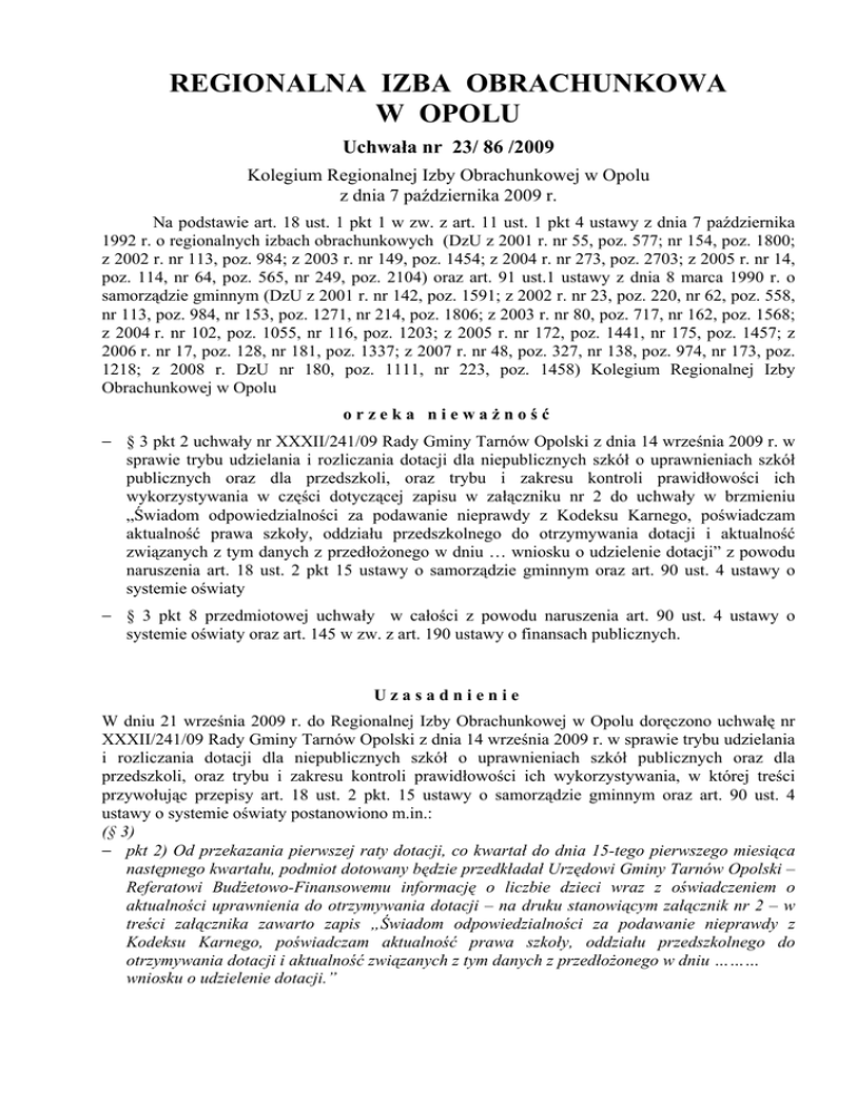 REGIONALNA IZBA OBRACHUNKOWA W OPOLU Uchwała nr 23/ 86 /2009 Kolegium Regionalnej Izby Obrachunkowej w Opolu z dnia 7 października 2009 r. Na podstawie art. 18 ust. 1 pkt 1 w zw. z art. 11 ust. 1 pkt 4 ustawy z dnia 7 października 1992 r. o regionalnych izbach obrachunkowych (DzU z 2001 r. nr 55, poz. 577; nr 154, poz. 1800; z 2002 r. nr 113, poz. 984; z 2003 r. nr 149, poz. 1454; z 2004 r. nr 273, poz. 2703; z 2005 r. nr 14, poz. 114, nr 64, poz. 565, nr 249, poz. 2104) oraz art. 91 ust.1 ustawy z dnia 8 marca 1990 r. o samorządzie gminnym (DzU z 2001 r. nr 142, poz. 1591; z 2002 r. nr 23, poz. 220, nr 62, poz. 558, nr 113, poz. 984, nr 153, poz. 1271, nr 214, poz. 1806; z 2003 r. nr 80, poz. 717, nr 162, poz. 1568; z 2004 r. nr 102, poz. 1055, nr 116, poz. 1203; z 2005 r. nr 172, poz. 1441, nr 175, poz. 1457; z 2006 r. nr 17, poz. 128, nr 181, poz. 1337; z 2007 r. nr 48, poz. 327, nr 138, poz. 974, nr 173, poz. 1218; z 2008 r. DzU nr 180, poz. 1111, nr 223, poz. 1458) Kolegium Regionalnej Izby Obrachunkowej w Opolu orzeka niewaŜność − § 3 pkt 2 uchwały nr XXXII/241/09 Rady Gminy Tarnów Opolski z dnia 14 września 2009 r. w sprawie trybu udzielania i rozliczania dotacji dla niepublicznych szkół o uprawnieniach szkół publicznych oraz dla przedszkoli, oraz trybu i zakresu kontroli prawidłowości ich wykorzystywania w części dotyczącej zapisu w załączniku nr 2 do uchwały w brzmieniu „Świadom odpowiedzialności za podawanie nieprawdy z Kodeksu Karnego, poświadczam aktualność prawa szkoły, oddziału przedszkolnego do otrzymywania dotacji i aktualność związanych z tym danych z przedłoŜonego w dniu … wniosku o udzielenie dotacji” z powodu naruszenia art. 18 ust. 2 pkt 15 ustawy o samorządzie gminnym oraz art. 90 ust. 4 ustawy o systemie oświaty − § 3 pkt 8 przedmiotowej uchwały w całości z powodu naruszenia art. 90 ust. 4 ustawy o systemie oświaty oraz art. 145 w zw. z art. 190 ustawy o finansach publicznych. Uzasadnienie W dniu 21 września 2009 r. do Regionalnej Izby Obrachunkowej w Opolu doręczono uchwałę nr XXXII/241/09 Rady Gminy Tarnów Opolski z dnia 14 września 2009 r. w sprawie trybu udzielania i rozliczania dotacji dla niepublicznych szkół o uprawnieniach szkół publicznych oraz dla przedszkoli, oraz trybu i zakresu kontroli prawidłowości ich wykorzystywania, w której treści przywołując przepisy art. 18 ust. 2 pkt. 15 ustawy o samorządzie gminnym oraz art. 90 ust. 4 ustawy o systemie oświaty postanowiono m.in.: (§ 3) − pkt 2) Od przekazania pierwszej raty dotacji, co kwartał do dnia 15-tego pierwszego miesiąca następnego kwartału, podmiot dotowany będzie przedkładał Urzędowi Gminy Tarnów Opolski – Referatowi BudŜetowo-Finansowemu informację o liczbie dzieci wraz z oświadczeniem o aktualności uprawnienia do otrzymywania dotacji – na druku stanowiącym załącznik nr 2 – w treści załącznika zawarto zapis „Świadom odpowiedzialności za podawanie nieprawdy z Kodeksu Karnego, poświadczam aktualność prawa szkoły, oddziału przedszkolnego do otrzymywania dotacji i aktualność związanych z tym danych z przedłoŜonego w dniu ……… wniosku o udzielenie dotacji.” 2 − pkt 8) W przypadku likwidacji szkoły lub przedszkola i występującej nadpłaty dotacji podmiot prowadzący szkołę lub przedszkole zobowiązany jest w terminie do 31 marca do zwrotu kwoty dotacji nadpłaconej za rok poprzedni. W sprawie wyŜej wymienionych postanowień przedmiotowej uchwały Wójt Gminy złoŜył wyjaśnienie (pismo z dnia 01.10.2009 r.) w treści którego zawarto m.in.: − Pouczenie zawarte w jednym z załączników do uchwały, wskazujące, iŜ składanie nieprawdziwych oświadczeń podlega odpowiedzialności karnej stanowi jedynie przytoczenie zasad wynikających z prawa karnego i ma znaczenie jedynie informacyjne (stanowi element pouczenia); ponadto mieści się w dyspozycji normy art. 90 ust. 4 ustawy o systemie oświaty. − Ustalenie terminu zwrotu dotacji mieści się w zasadach rozliczenia dotacji. Podmiot który uzyskuje dotację ma prawo a zarazem obowiązek znać datę, do której następuje zwrot („nadwyŜki”) dotacji. Ustalenie tego terminu przez radę gminy stanowi regulację szczególną (lex specialis) wobec przepisów o finansach publicznych, poniewaŜ art. 90 ww. ustawy stanowi przepis szczególny wobec ustawy o finansach publicznych. Na posiedzenie Kolegium wyznaczone na dzień 7 października 2009 r. przedstawiciel Gminy zawiadomionej prawidłowo nie stawił się. W tym stanie Kolegium stwierdza, co następuje: Zgodnie z treścią art. 7 ust. 1 pkt. 8 ustawy o samorządzie gminnym do zadań własnych gminy naleŜą m.in. sprawy obejmujące edukację publiczną. Jedną z form realizacji tego zadania jest udzielanie dotacji dla niepublicznych szkół o uprawnieniach szkół publicznych oraz dla przedszkoli na zasadach określonych w treści Rozdziału 8 „Szkoły i placówki niepubliczne” ustawy z dnia 7 września 1991r. o systemie oświaty. Zgodnie z ukształtowaną linią orzeczniczą Naczelnego Sądu Administracyjnego przyjąć naleŜy, iŜ do rodzajów naruszeń przepisów skutkujących niewaŜnością uchwały organów jednostek samorządu terytorialnego zaliczyć naleŜy naruszenia: przepisów wyznaczających kompetencje do podejmowania uchwał, podstawy prawnej podejmowania uchwał, przepisów Prawa ustrojowego, przepisów Prawa materialnego – przez wadliwą ich wykładnię – oraz przepisów regulujących procedurę podejmowania uchwał (np. wyrok NSA z 3 grudnia 1996 r. sygn. SA/Wr 949/96; wyrok NSA z 11 lutego 1998 r. sygn. IISA/Wr 1459/97). W powołanych ramach ustrojowych sytuować naleŜy dyspozycję art. 90 ust. 4 ustawy o systemie oświaty, zgodnie z którą „organ stanowiący jednostki samorządy terytorialnego ustala tryb udzielania i rozliczania dotacji związanych z realizacją zadania własnego w zakresie edukacji publicznej. Jak wynika z brzmienia przywoł