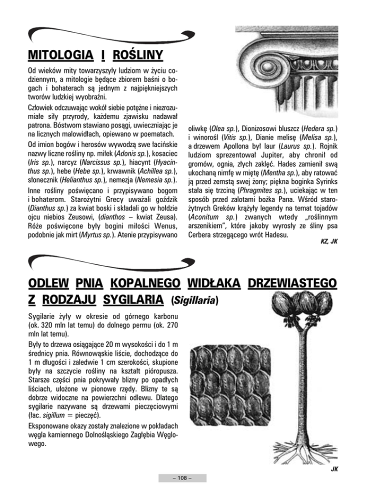 MITOLOGIA I ROŚLINY Od wieków mity towarzyszyły ludziom w życiu codziennym, a mitologie będące zbiorem baśni o bogach i bohaterach są jednym z najpiękniejszych tworów ludzkiej wyobraźni. Człowiek odczuwając wokół siebie potężne i niezrozumiałe siły przyrody, każdemu zjawisku nadawał patrona. Bóstwom stawiano posągi, uwieczniając je na licznych malowidłach, opiewano w poematach. Od imion bogów i herosów wywodzą swe łacińskie nazwy liczne rośliny np. miłek (Adonis sp.), kosaciec (Iris sp.), narcyz (Narcissus sp.), hiacynt (Hyacinthus sp.), hebe (Hebe sp.), krwawnik (Achillea sp.), słonecznik (Helianthus sp.), nemezja (Nemesia sp.). Inne rośliny poświęcano i przypisywano bogom i bohaterom. Starożytni Grecy uważali goździk (Dianthus sp.) za kwiat boski i składali go w hołdzie ojcu niebios Zeusowi, (dianthos – kwiat Zeusa). Róże poświęcone były bogini miłości Wenus, podobnie jak mirt (Myrtus sp.). Atenie przypisywano oliwkę (Olea sp.), Dionizosowi bluszcz (Hedera sp.) i winorośl (Vitis sp.), Dianie melisę (Melisa sp.), a drzewem Apollona był laur (Laurus sp.). Rojnik ludziom sprezentował Jupiter, aby chronił od gromów, ognia, złych zaklęć. Hades zamienił swą ukochaną nimfę w miętę (Mentha sp.), aby ratować ją przed zemstą swej żony; piękna boginka Syrinks stała się trzciną (Phragmites sp.), uciekając w ten sposób przed zalotami bożka Pana. Wśród starożytnych Greków krążyły legendy na temat tojadów (Aconitum sp.) zwanych wtedy „roślinnym arszenikiem”, które jakoby wyrosły ze śliny psa Cerbera strzegącego wrót Hadesu. KZ, JK ODLEW PNIA KOPALNEGO WIDŁAKA DRZEWIASTEGO Z RODZAJU SYGILARIA (Sigillaria) Sygilarie żyły w okresie od górnego karbonu (ok. 320 mln lat temu) do dolnego permu (ok. 270 mln lat temu). Były to drzewa osiągające 20 m wysokości i do 1 m średnicy pnia. Równowąskie liście, dochodzące do 1 m długości i zaledwie 1 cm szerokości, skupione były na szczycie rośliny na kształt pióropusza. Starsze części pnia pokrywały blizny po opadłych liściach, ułożone w pionowe rzędy. Blizny te są dobrze widoczne na powierzchni odlewu. Dlatego sygilarie nazywane są drzewami pieczęciowymi (łac. sigillum = pieczęć). Eksponowane okazy zostały znalezione w pokładach węgla kamiennego Dolnośląskiego Zagłębia Węglowego. JK – 108 –