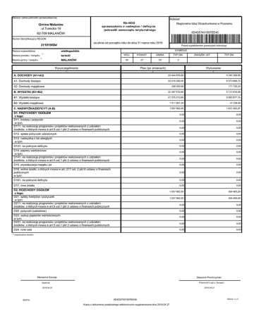 Nazwa i adres jednostki sprawozdawczej Gmina Malanów ul.Turecka 16 62-709 MALANÓW Numer identyfikacyjny REGON 311019504 Nazwa województwa Nazwa powiatu / związku Nazwa gminy / związku wielkopolskie WOJ. MALANÓW 1) 30 Wyszczególnienie A. DOCHODY (A1+A2) Regionalna Izba Obrachunkowa w Poznaniu 6D4D57401597EE46 za okres od początku roku do dnia 31 marca roku 2016 turecki 1) Adresat: Rb-NDS sprawozdanie o nadwyżce / deficycie jednostki samorządu terytorialnego POWIAT Przed wypełnieniem przeczytać instrukcję SYMBOLE GMINA 27 TYP GM. 05 2 Plan (po zmianach) 1 2 A1. Dochody bieżące TYP ZW. Wykonanie 23 444 878,90 3 23 218 326,05 A2. Dochody majątkowe 6 745 398,95 6 573 668,73 B. WYDATKI (B1+B2) 226 552,85 171 730,22 22 387 016,90 5 113 916,08 B2. Wydatki majątkowe 21 375 215,60 5 082 677,16 1 011 801,30 31 238,92 1 057 862,00 1 631 482,87 0,00 0,00 0,00 0,00 0,00 0,00 0,00 0,00 0,00 0,00 0,00 0,00 0,00 0,00 0,00 0,00 0,00 0,00 0,00 0,00 0,00 0,00 0,00 0,00 1 057 862,00 264 465,00 1 057 862,00 264 465,00 0,00 0,00 0,00 0,00 0,00 0,00 0,00 0,00 0,00 0,00 B1. Wydatki bieżące C. NADWYŻKA/DEFICYT (A-B) D1. PRZYCHODY OGÓŁEM z tego: D11. kredyty i pożyczki w tym: D111. na realizację programów i projektów realizowanych z udziałem środków, o których mowa w art.5 ust.1 pkt 2 ustawy o finansach publicznych D12. spłata pożyczek udzielonych D13. nadwyżka z lat ubiegłych w tym: D131. na pokrycie deficytu D14. papiery wartościowe w tym: D141. na realizację programów i projektów realizowanych z udziałem środków, o których mowa w art.5 ust.1 pkt 2 ustawy o finansach publicznych D15. prywatyzacja majątku jst D16. wolne środki, o których mowa w art. 217 ust. 2 pkt 6 ustawy o finansach publicznych w tym: D161. na pokrycie deficytu D17. inne źródła D2. ROZCHODY OGÓŁEM z tego: D21. spłaty kredytów i pożyczek w tym: D211. na realizację programów i projektów realizowanych z udziałem środków, o których mowa w art.5 ust.1 pkt 2 ustawy o finansach publicznych D22. pożyczki (udzielone) D23. wykup papierów wartościowych w tym: D231. na realizację programów i projektów realizowanych z udziałem środków, o których mowa w art.5 ust.1 pkt 2 ustawy o finansach publicznych 1) ZWIĄZEK JST D24. inne cele niepotrzebne skreślić Marzanna Szczap Sławomir Prentczyński Przewodnic ząc y Zarządu Skarbnik 2016.04.21 BeSTia 2016.04.21 6D4D57401597EE46 Kopia z dokumentu podpisanego elektronicznie wygenerowana dnia 2016.04.27 Strona 1 z 3 Dane uzupełniające: E. Finansowanie deficytu, zgodnie z art. 217 ust. 2 ustawy o finansach publicznych Wyszczególnienie Plan (po zmianach) 1 2) 2 4) E. FINANSOWANIE DEFICYTU (E1+E2+E3+E4+E5) z tego: Wykonanie 0,00 3) 3 0,00 E1. sprzedaż papierów wartościowych wyemitowanych przez jednostkę samorządu terytorialnego 0,00 0,00 E2. kredyty i pożyczki 0,00 0,00 E3. prywatyzacja majątku jednostki samorządu terytorialnego 0,00 0,00 E4. nadwyżka budżetu jednostki samorządu terytorialnego z lat ubiegłych E5. wolne środki jako nadwyżka środków pieniężnych na rachunku bieżącym budżetu jednostki samorządu terytorialnego, wynikających z rozliczeń wyemitowanych papierów wartościowych, kredytów i pożyczek z lat ubiegłych 0,00 0,00 0,00 0,00 2) jednostki wypełniają za I, II, III i IV kwartał 4) wypełniają jednostki, w których planowana lub wykonana różnica między dochodami a wydatkami jest ujemna 3) jednostki wypełniają tylko za IV kwartał F. Dane uzupełniające do wyliczenia relacji, o których mowa w art. 242 i 243 ustawy o finansach publicznych Wyszczególnienie Plan (po zmianach) 1 F1. Łączna kwota wyłączeń z relacji, o której mowa w art. 243 ust. 1 ustawy o finansach publicznych w okresie sprawozdawczym w tym: F11. kwota wyłączeń, o których mowa w art. 243 ust. 3 ustawy o finansach publicznych F12. kwota wyłączeń, o których mowa w art. 243 ust. 3a ustawy o finansach publicznych F13. wykup papierów wartościowych, spłata kredytów i pożyczek zaciągniętych na spłatę przejętych zobowiązań samodzielnego publicznego zakładu opieki zdrowotnej F14. wykup obligacji nominowanych w walutach obcych wyemitowanych na zagraniczne rynki przed 1 stycznia 2010 r. F2. Zobowiązania związku współtworzonego przez jednostkę samorządu terytorialnego przypadające do spłaty w roku budżetowym F3. Kwota związana z realizacją wydatków bieżących, o których mowa w art. 242 ustawy o 5) finansach publicznych 3 0,00 0,00 0,00 0,00 0,00 0,00 0,00 0,00 0,00 0,00 0,00 0,00 X F4. Kwota wydatków bieżących ponoszonych na spłatę przejętych zobowiązań samodzielnego publicznego zakładu opieki zdrowotnej przekształconego na zasadach określonych w ustawie o działalności leczniczej 5) Wykonanie 2 0,00 0,00 0,00 wypełniają jednostki tylko za IV kwartały Marzanna Szczap Sławomir Prentczyński Przewodnic ząc y Zarządu Skarbnik 2016.04.21 BeSTia 2016.04.21 6D4D57401597EE46 Kopia z dokumentu podpisanego elektronicznie wygenerowana dnia 2016.04.27 Strona 2 z 3 Wyjaśnienia do sprawozdania Rb-NDS Marzanna Szczap Sławomir Prentczyński Przewodnic ząc y Zarządu Skarbnik 2016.04.21 BeSTia 2016.04.21 6D4D57401597EE46 Kopia z dokumentu podpisanego elektronicznie wygenerowana dnia 2016.04.27 Strona 3 z 3