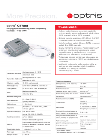 More Precision. ® optris CTfast WŁAŚCIWOŚCI Precyzyjny bezkontaktowy pomiar temperatury w zakresie -40 do 600°C - Jeden z najmniejszych na świecie czujników podczerwieni z czasem ekspozycji między 3ms (50% sygnału) a 9ms (90% sygnału) - Szybkie wyjście analogowe (0/4-20mA, 0-5/10V) z przetwarzaniem w czasie rzeczywistym - Natychmiastowe wyście binarne 0/10V z czasem reakcji 4ms (50% sygnału) - Ciągły monitoring procesu z "bezchopperowym" systemem czujnika (konwencjonalne układy piroelektryczne z mechanicznym chopperem widzą proces tylko przez część czasu) - Wytrzymała głowica pomiarowa, stosowalna do temperatury otoczenia 180°C bez dodatkowego chłodzenia - Możliwość połączenia wielu przetworników w matrycę do skanowania małych i szybkich obiektów przy pomocy interfejsu komunikacyjnego RS485 Temperatura otoczzenia głow ica pomiarow a: -20 - 130°C elektronika: 0 - 65°C Temperatura składow ania głow ica pomiarow a: -40 - 130°C elektronika: -40 - 85°C Parametry metrologiczne Wilgotność w zględna 10 - 95 %, bez kondensacji Zakres pomiarow y (sw ob. skalow any ) -40 - 600°C Wibracje (głow ica) IEC 68-2-6: 3 G, 11-200 Hz, w dow olnej osi Zakres spektralny 8 - 14 µm Udary (głow ica) IEC 68-2-27: 50 G, 11 ms, w dow olnej osi Rozdzielczość opty czna 10:1 głow ica pomiarow a: 40 g Dokładność (w temp. otocz. 23 ±5°C) ±1 % lub ±1°C elektronika: 420 g Pow tarzalność (w temp. otocz. 23 ±5°C) ±0.5 % lub ±0.5°C Dry ft termiczny 0.05 % lub 0.05°C/K Rozdzielczość termiczna (NETD) 0.5°C Masa Parametry elektryczne Wy jścia analogow e Wy jście binarne Opcjonalnie Wy jścia cy frow e (opcja) Impedancje obciążenia 0/4 - 20 mA, 0 - 5/10 V, sy mualcja termopar J, K przekaźnik: 2 x 60 V DC/42 V ACeff ; 0.4 A; Stała czasow a USB, RS232, RS485 Emisy jność/Wzmocnienie (ustalane za mA max . 500 ? (dla 15 - 36 V DC) pomocą klaw iatury lub oprogramow ania) programow ane w ejścia funkcy jne do zadaw ania emisy jności, kompensacji temperatury otoczenia, Emisy jność/Wzmocnienie (ustalane za pomocą klaw iatury lub oprogramow ania) Przetw arzanie sy gnału (parametr ustalany za pomocą klaw iatury lub oprogramow ania) w y zw alania funkcji Długość kabla głow icy 1 m (standard), 3 m, 8 m, 15 m Pobór prądu max . 100 mA Napięcie zasilania 8 - 36 V DC 1, 2 3 ms (50 %) 17 ms (90 %) na w y . analog. 4 ms (50 %) na w y . binarny m izolow any opty cznie mV min. 100 k?? 1 9 ms (90 %) 0 - 10 V (10mA) termopara 20 ? (imped. w y jściow a) Wejścia Czas ekspozy cji 1 Certy fikat kalibracji 1 2 0.100 - 1.100 0.100 - 1.100 maksimum lokalne, minimum lokalne, średnia; rozszerzona funcja hold z progiem i histerezą opcjonalny przy jąć w artość w iększą przy temperaturze głow icy 0 - 180°C (130°C dla 2:1) optris® CTfast Charakterystyka optyki optyka 10:1 z soczewką CF optyka 10:1 D:S = 10:1 średnica celu S 7 10 20 30 40 50 60 70 80 (mm) średnica celu S 7 5 1.2 8 16 24 (mm) odległość 0 100 200 300 400 500 600 700 800(mm) odległość 0 5 10 15 20 25 (mm) D D Stałe czasowe dla skoku temperatury z 25°C do 180°C I 10ms I I 10ms I temperatura obiektu temperatura obiektu 90% wyjście analogowe wyjście binarne Czas ekspozycji przy 90% sygnału z funkcją maksimum lokalne (peak hold) Wyjście binarne dla progu 50% energii Oprogramowanie Compact Connect - Porogram do łatwego konfigurowania pirometru i zdalnego sterowania, wspomagający wielowątkowość - Graficzne wyświetlanie przebiegu temperatury i automatyczna rejestracja danych dla analizy i dokumentacji z czasem odpowiedzi 1 ms - Ustawianie funkcji przetwarzania sygnału i programowanie wyjść analogowych - Program Compact Connect pozwala na przystosowanie pirometru do wymagań danej aplikacji i potrzeb użytkownika Wymiary Głowica pomiarowa Elektronika TEST-THERM Sp. z o.o. ul. Friedleina 4-6 30-009 Kraków Tel.: 012 6321301, 012 6326188 Fax: 012 6321037 [email protected] http://test-therm.com.pl Parametry mogą ulec zmianie bez uprzedzenia. CTfast-DS-PL2005-06-A