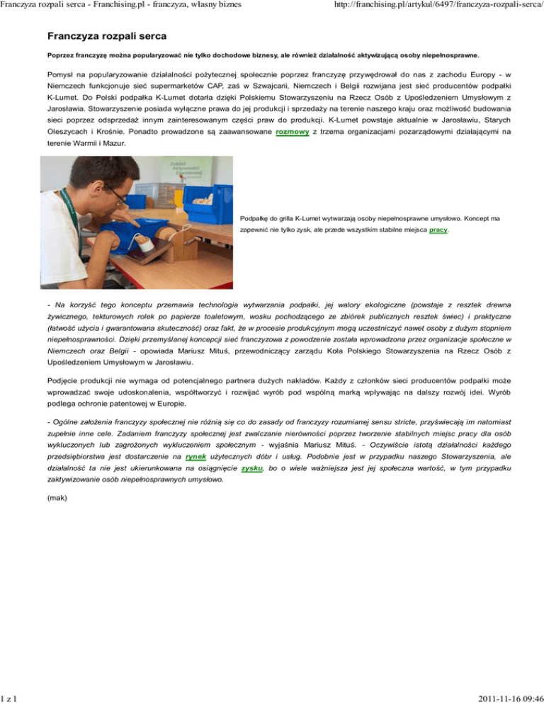 Franczyza rozpali serca - Franchising.pl - franczyza, własny biznes 1z1 http://franchising.pl/artykul/6497/franczyza-rozpali-serca/ Franczyza rozpali serca Poprzez franczyzę można popularyzować nie tylko dochodowe biznesy, ale również działalność aktywizującą osoby niepełnosprawne. Pomysł na popularyzowanie działalności pożytecznej społecznie poprzez franczyzę przywędrował do nas z zachodu Europy - w Niemczech funkcjonuje sieć supermarketów CAP, zaś w Szwajcarii, Niemczech i Belgii rozwijana jest sieć producentów podpałki K-Lumet. Do Polski podpałka K-Lumet dotarła dzięki Polskiemu Stowarzyszeniu na Rzecz Osób z Upośledzeniem Umysłowym z Jarosławia. Stowarzyszenie posiada wyłączne prawa do jej produkcji i sprzedaży na terenie naszego kraju oraz możliwość budowania sieci poprzez odsprzedaż innym zainteresowanym części praw do produkcji. K-Lumet powstaje aktualnie w Jarosławiu, Starych Oleszycach i Krośnie. Ponadto prowadzone są zaawansowane rozmowy z trzema organizacjami pozarządowymi działającymi na terenie Warmii i Mazur. Podpałkę do grilla K-Lumet wytwarzają osoby niepełnosprawne umysłowo. Koncept ma zapewnić nie tylko zysk, ale przede wszystkim stabilne miejsca pracy. - Na korzyść tego konceptu przemawia technologia wytwarzania podpałki, jej walory ekologiczne (powstaje z resztek drewna żywicznego, tekturowych rolek po papierze toaletowym, wosku pochodzącego ze zbiórek publicznych resztek świec) i praktyczne (łatwość użycia i gwarantowana skuteczność) oraz fakt, że w procesie produkcyjnym mogą uczestniczyć nawet osoby z dużym stopniem niepełnosprawności. Dzięki przemyślanej koncepcji sieć franczyzowa z powodzenie została wprowadzona przez organizacje społeczne w Niemczech oraz Belgii - opowiada Mariusz Mituś, przewodniczący zarządu Koła Polskiego Stowarzyszenia na Rzecz Osób z Upośledzeniem Umysłowym w Jarosławiu. Podjęcie produkcji nie wymaga od potencjalnego partnera dużych nakładów. Każdy z członków sieci producentów podpałki może wprowadzać swoje udoskonalenia, współtworzyć i rozwijać wyrób pod wspólną marką wpływając na dalszy rozwój idei. Wyrób podlega ochronie patentowej w Europie. - Ogólne założenia franczyzy społecznej nie różnią się co do zasady od franczyzy rozumianej sensu stricte, przyświecają im natomiast zupełnie inne cele. Zadaniem franczyzy społecznej jest zwalczanie nierówności poprzez tworzenie stabilnych miejsc pracy dla osób wykluczonych lub zagrożonych wykluczeniem społecznym - wyjaśnia Mariusz Mituś. - Oczywiście istotą działalności każdego przedsiębiorstwa jest dostarczenie na rynek użytecznych dóbr i usług. Podobnie jest w przypadku naszego Stowarzyszenia, ale działalność ta nie jest ukierunkowana na osiągnięcie zysku, bo o wiele ważniejsza jest jej społeczna wartość, w tym przypadku zaktywizowanie osób niepełnosprawnych umysłowo. (mak) 2011-11-16 09:46