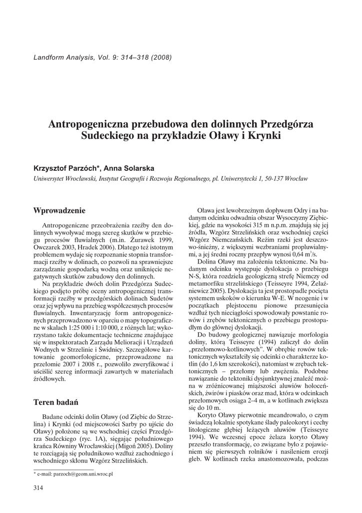 Landform Analysis, Vol. 9: 314–318 (2008) Antropogeniczna przebudowa den dolinnych Przedgórza Sudeckiego na przykładzie Oławy i Krynki Krzysztof Parzóch*, Anna Solarska Uniwersytet Wrocławski, Instytut Geografii i Rozwoju Regionalnego, pl. Uniwersytecki 1, 50-137 Wrocław Wprowadzenie Antropogeniczne przeobrażenia rzeźby den dolinnych wywoływać mogą szereg skutków w przebiegu procesów fluwialnych (m.in. Żurawek 1999, Owczarek 2003, Hradek 2006). Dlatego też istotnym problemem wydaje się rozpoznanie stopnia transformacji rzeźby w dolinach, co pozwoli na sprawniejsze zarządzanie gospodarką wodną oraz uniknięcie negatywnych skutków zabudowy den dolinnych. Na przykładzie dwóch dolin Przedgórza Sudeckiego podjęto próbę oceny antropogenicznej transformacji rzeźby w przedgórskich dolinach Sudetów oraz jej wpływu na przebieg współczesnych procesów fluwialnych. Inwentaryzację form antropogenicznych przeprowadzono w oparciu o mapy topograficzne w skalach 1:25 000 i 1:10 000, z różnych lat; wykorzystano także dokumentacje techniczne znajdujące się w inspektoratach Zarządu Melioracji i Urządzeń Wodnych w Strzelinie i Świdnicy. Szczegółowe kartowanie geomorfologiczne, przeprowadzone na przełomie 2007 i 2008 r., pozwoliło zweryfikować i uściślić szereg informacji zawartych w materiałach źródłowych. Teren badań Badane odcinki dolin Oławy (od Ziębic do Strzelina) i Krynki (od miejscowości Sarby po ujście do Oławy) położone są we wschodniej części Przedgórza Sudeckiego (ryc. 1A), sięgając południowego krańca Równiny Wrocławskiej (Migoń 2005). Doliny te rozciągają się południkowo wzdłuż zachodniego i wschodniego skłonu Wzgórz Strzelińskich. * e-mail: [email protected] 314 Oława jest lewobrzeżnym dopływem Odry i na badanym odcinku odwadnia obszar Wysoczyzny Ziębickiej, gdzie na wysokości 315 m n.p.m. znajdują się jej źródła, Wzgórz Strzelińskich oraz wschodniej części Wzgórz Niemczańskich. Reżim rzeki jest deszczowo-śnieżny, z większymi wezbraniami propluwialnymi, a jej średni roczny przepływ wynosi 0,64 m3/s. Dolina Oławy ma założenia tektoniczne. Na badanym odcinku występuje dyslokacja o przebiegu N-S, która rozdziela geologiczną strefę Niemczy od metamorfiku strzelińskiego (Teisseyre 1994, Żelaźniewicz 2005). Dyslokacja ta jest prostopadle pocięta systemem uskoków o kierunku W-E. W neogenie i w początkach plejstocenu pionowe przesunięcia wzdłuż tych nieciągłości spowodowały powstanie rowów i zrębów tektonicznych o przebiegu prostopadłym do głównej dyslokacji. Do budowy geologicznej nawiązuje morfologia doliny, którą Teisseyre (1994) zaliczył do dolin „przełomowo-kotlinowych”. W obrębie rowów tektonicznych wykształciły się odcinki o charakterze kotlin (do 1,6 km szerokości), natomiast w zrębach tektonicznych – przełomy lub zwężenia. Podobne nawiązanie do tektoniki dysjunktywnej znaleźć można w zróżnicowanej miąższości aluwiów holoceńskich, żwirów i piasków oraz mad, która w odcinkach przełomowych osiąga 2–4 m, a w kotlinach zwiększa się do 10 m. Koryto Oławy pierwotnie meandrowało, o czym świadczą lokalnie spotykane ślady paleokoryt i cechy litologiczne głębiej leżących aluwiów (Teisseyre 1994). We wczesnej epoce żelaza koryto Oławy przeszło transformację, co związane było z pojawieniem się pierwszych rolników i nasileniem erozji gleb. W kotlinach rzeka anastomozowała, podczas Antropogeniczna przebudowa den dolinnych Przedgórza Sudeckiego na przyk³adzie O³awy i Krynki gdy w przełomach była kręta lub meandrowała. Na podstawie przekrojów geologicznych stwierdzono brak migracji bocznej koryta na odcinkach anastomozujących od średniowiecza (Teisseyre 1992). Koryto Oławy wykazywało wówczas stabilność: było wąskie i głębokie, iłodenne, o brzegach porośniętych zaroślami wierzbowymi. Krynka jest prawobrzeżnym dopływem Oławy i uchodzi do niej w rejonie Strzelina, na wysokości 185 m n.p.m. Źródła Krynki znajdują się na wysokości 310 m n.p.m. Dolina jest płaskodenna i poszerza się wraz z biegiem rzeki, osiągając maksymalnie 1,5 km szerokości. Podobnie jak w przypadku Oławy, reżim rzeki jest deszczowo-śnieżny. Wezbrania zdarzają się najczęściej wiosną i latem, a średni przepływ roczny wynosi 0,5 m3/s. Dolina Krynki, prawdopodobnie również o założeniach tektonicznych (Berezowska i in. 1994), wypełniona jest osadami preplejstoceńskich piasków i żwirów kwarcowych, plejstoceńskich żwirów i piasków wodnolodowcowych oraz glin zwałowych, holoceńskich piasków i żwirów z pokrywą namułów. W dnie koryta Krynki, ale również w obrębie doliny odsłaniają się iły mioceńskie, co jest zjawiskiem nietypowym dla rzek Przedgórza Sudeckiego, które z reguły zasypane są aluwiami o miąższości około 20 m (Wroński 1971). Podobnie jak Oława, Krynka mogła w przeszłości wykształcić system anastomozujący. W północnej części doliny Krynki przepływ odbywa się dwoma korytami: właściwym korytem oraz kanałem młynówki. Wydaje się, że kanał poprowadzony został jednym z dawnych koryt anastomozującej Krynki. Przemawia za tym obecność starorzeczy wzdłuż biegu kanału, często spotykane silnie meandrujące odcinki młynówki oraz liczne paleokoryta w dnie doliny. Zmiany antropogeniczne w dolinie Oławy Antropogeniczna transformacja doliny Oławy rozpoczęła się w XIII w., kiedy w tym rejonie pojawili się cystersi, zakładając klasztor w Starym Henrykowie, a następnie przenosząc swoją siedzibę do Henrykowa (Grüger 1978). Szczególnie spektakularne zmiany hydrograficzne zaszły w dolinie Oławy w XIV w. Rozwój hodowli ryb, stymulowany przez cystersów, doprowadził do powstania stawów rybnych w dolinach Oławy i jej dopływów. Od połowy XIV do połowy XIX w. istniał w dnie doliny na południe od Henrykowa tzw. Wielki Staw (Grüger 1978) o pow