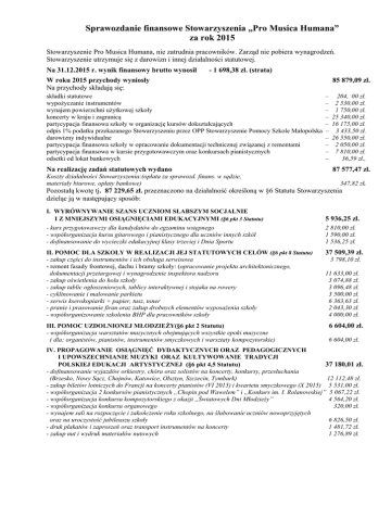 Sprawozdanie finansowe Stowarzyszenia „Pro Musica Humana” za rok 2015 Stowarzyszenie Pro Musica Humana, nie zatrudnia pracowników. Zarząd nie pobiera wynagrodzeń. Stowarzyszenie utrzymuje się z darowizn i innej działalności statutowej. Na 31.12.2015 r. wynik finansowy brutto wynosił - 1 698,38 zł. (strata) W roku 2015 przychody wyniosły Na przychody składają się: składki statutowe wypożyczanie instrumentów wynajem powierzchni użytkowej szkoły koncerty w kraju i zagranicą partycypacja finansowa szkoły w organizację kursów dokształcających odpis 1% podatku przekazanego Stowarzyszeniu przez OPP Stowarzyszenie Pomocy Szkole Małopolska darowizny indywidualne partycypacja finansowa szkoły w opracowanie dokumentacji technicznej związanej z remontami partycypacja finansowa w kursie przygotowawczym oraz konkursach pianistycznych odsetki od lokat bankowych Na realizację zadań statutowych wydano Koszty działalności Stowarzyszenia:(opłata za sprawozd. finans. w sądzie, materiały biurowe, opłaty bankowe) 85 879,09 zł. – – – – – – – – – – 204, 00 zł. 2 530,00 zł. 1 750,00 zł. 25 340,00 zł. 16 175,00 zł. 3 433,50 zł. 26 550,00 zł. 2 050,00 zł. 7 810,00 zł. 36,59 zł., 87 577,47 zł. 347,82 zł. Pozostałą kwotę tj. 87 229,65 zł. przeznaczono na działalność określoną w §6 Statutu Stowarzyszenia dzieląc ją w następujący sposób: I. WYRÓWNYWANIE SZANS UCZNIOM SŁABSZYM SOCJALNIE I Z MNIEJSZYMI OSIĄGNIĘCIAMI EDUKACYJNYMI (§6 pkt 3 Statutu) - kurs przygotowawczy dla kandydatów do egzaminu wstępnego - współorganizacja kursu gitarowego i pianistycznego dla uczniów innych szkół - dofinansowanie do wycieczki edukacyjnej klasy trzeciej i Dnia Sportu II. POMOC DLA SZKOŁY W REALIZACJI JEJ STATUTOWYCH CELÓW (§6 pkt 8 Statutu) - zakup części do instrumentów i ich obsługa serwisowa - remont fasady frontowej, dachu i bramy szkoły: (opracowanie projektu architektonicznego, dokumentacji przetargowej i wynagrodzenie inspektora nadzoru - zakup oświetlenia do holu szkoły - zakup tablic ogłoszeniowych, tablicy interaktywnej i stojaka na rowery - cyklinowanie i malowanie parkietu - serwis kserokopiarki + papier, tusz, toner - pranie i prasowanie firan oraz zakup drobnych elementów wyposażenia szkoły - współorganizowanie szkolenia BHP dla pracowników szkoły III. POMOC UZDOLNIONEJ MŁODZIEŻY(§6 pkt 2 Statutu) - współorganizacja warsztatów muzycznych obejmujących wszystkie epoki muzyczne ( dla: organistów, pianistów, instrumentów smyczkowych i warsztaty kompozytorskie) 5 936,25 zł. 2 810,00 zł. 1 590,00 zł. 1 536,25 zł. 37 509,39 zł. 3 798,10 zł. 11 633,00 zł. 3 074,88 zł. 3 096,48 zł. 3 500,00 zł. 6 363,63 zł. 2 043,30 zł. 4 000,00 zł. 6 604,00 zł. 6 604,00 zł. IV. PROPAGOWANIE OSIĄGNIĘĆ DYDAKTYCZNYCH ORAZ PEDAGOGICZNYCH I UPOWSZECHNIANIE MUZYKI ORAZ KULTYWOWANIE TRADYCJI POLSKIEJ EDUKACJI ARTYSTYCZNEJ (§6 pkt 4,5 Statutu) 37 180,01 zł. - dofinansowanie wyjazdów orkiestry, chóru oraz solistów na koncerty, konkursy, przesłuchania (Brzesko, Nowy Sącz, Chojnów, Katowice, Olsztyn, Szczecin, Tymbark) 12 112,48 zł. - zakup biletów lotniczych do Francji na koncerty pianistów (VI 2015) i kwartetu smyczkowego (X 2015) 5 531,00 zł. - współorganizacja 2 konkursów pianistycznych „Chopin pod Wawelem” i „Konkurs im. I. Rolanowskiej” 5 067,22 zł. - współorganizacja konkursu kompozytorskiego z okazji „Światowych Dni Młodzieży” 4 564,20 zł. - współorganizacja konkursu organowego 320,00 zł. - wynajem sali na rozpoczęcie i zakończenie roku szkolnego, na ślubowanie uczniów nowoprzyjętych oraz na uroczystość jubileuszu szkoły 6 826,50 zł. - druk plakatów i zaproszeń oraz transport instrumentów na koncerty 1 481,72 zł. - zakup nut i wydruk materiałów nutowych 1 276,89 zł.