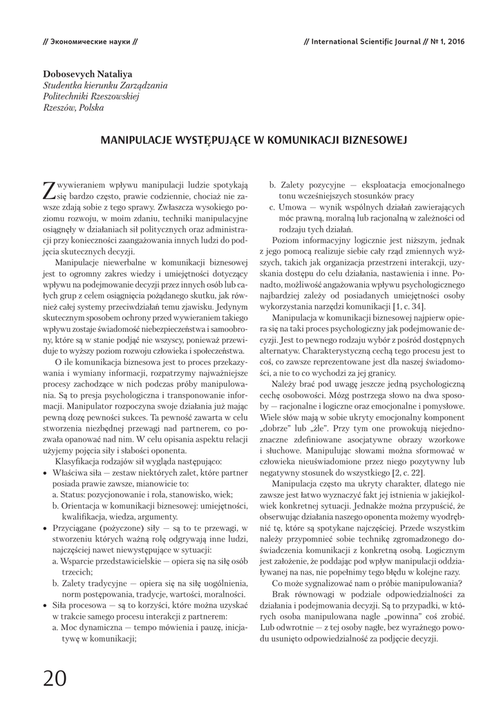 // Экономические науки // // International Scientific Journal // № 1, 2016 Dobosevych Nataliya Studentka kierunku Zarządzania Politechniki Rzeszowskiej Rzeszów, Polska MANIPULACJE WYSTĘPUJĄCE W KOMUNIKACJI BIZNESOWEJ Z wywieraniem wpływu manipulacji ludzie spotykają się bardzo często, prawie codziennie, chociaż nie za‑ wsze zdają sobie z tego sprawy. Zwłaszcza wysokiego po‑ ziomu rozwoju, w moim zdaniu, techniki manipulacyjne osiągnęły w działaniach sił politycznych oraz administra‑ cji przy konieczności zaangażowania innych ludzi do pod‑ jęcia skutecznych decyzji. Manipulacje niewerbalne w komunikacji biznesowej jest to ogromny zakres wiedzy i umiejętności dotyczący wpływu na podejmowanie decyzji przez innych osób lub ca‑ łych grup z celem osiągnięcia pożądanego skutku, jak rów‑ nież całej systemy przeciwdziałań temu zjawisku. Jedynym skutecznym sposobem ochrony przed wywieraniem takiego wpływu zostaje świadomość niebezpieczeństwa i samoobro‑ ny, które są w stanie podjąć nie wszyscy, ponieważ przewi‑ duje to wyższy poziom rozwoju człowieka i społeczeństwa. O ile komunikacja biznesowa jest to proces przekazy‑ wania i wymiany informacji, rozpatrzymy najważniejsze procesy zachodzące w nich podczas próby manipulowa‑ nia. Są to presja psychologiczna i transponowanie infor‑ macji. Manipulator rozpoczyna swoje działania już mając pewną dozę pewności sukces. Ta pewność zawarta w celu stworzenia niezbędnej przewagi nad partnerem, co po‑ zwała opanować nad nim. W celu opisania aspektu relacji użyjemy pojęcia siły i słabości oponenta. Klasyfikacja rodzajów sił wygląda następująco: •• Właściwa siła — zestaw niektórych zalet, które partner posiada prawie zawsze, mianowicie to: a. Status: pozycjonowanie i rola, stanowisko, wiek; b. Orientacja w komunikacji biznesowej: umiejętności, kwalifikacja, wiedza, argumenty. •• Przyciągane (pożyczone) siły — są to te przewagi, w stworzeniu których ważną rolę odgrywają inne ludzi, najczęściej nawet niewystępujące w sytuacji: a. Wsparcie przedstawicielskie — opiera się na siłę osób trzecich; b. Zalety tradycyjne — opiera się na siłę uogólnienia, norm postępowania, tradycje, wartości, moralności. •• Siła procesowa — są to korzyści, które można uzyskać w trakcie samego procesu interakcji z partnerem: a. Moc dynamiczna — tempo mówienia i pauzę, inicja‑ tywę w komunikacji; 20 b. Zalety pozycyjne — eksploatacja emocjonalnego tonu wcześniejszych stosunków pracy c. Umowa — wynik wspólnych działań zawierających móc prawną, moralną lub racjonalną w zależności od rodzaju tych działań. Poziom informacyjny logicznie jest niższym, jednak z jego pomocą realizuje siebie cały rząd zmiennych wyższych, takich jak organizacja przestrzeni interakcji, uzy‑ skania dostępu do celu działania, nastawienia i inne. Po‑ nadto, możliwość angażowania wpływu psychologicznego najbardziej zależy od posiadanych umiejętności osoby wykorzystania narzędzi komunikacji [1, c. 34]. Manipulacja w komunikacji biznesowej najpierw opie‑ ra się na taki proces psychologiczny jak podejmowanie de‑ cyzji. Jest to pewnego rodzaju wybór z pośród dostępnych alternatyw. Charakterystyczną cechą tego procesu jest to coś, co zawsze reprezentowane jest dla naszej świadomo‑ ści, a nie to co wychodzi za jej granicy. Należy brać pod uwagę jeszcze jedną psychologiczną cechę osobowości. Mózg postrzega słowo na dwa sposo‑ by — racjonalne i logiczne oraz emocjonalne i pomysłowe. Wiele słów mają w sobie ukryty emocjonalny komponent „dobrze” lub „żle”. Przy tym one prowokują niejedno‑ znaczne zdefiniowane asocjatywne obrazy wzorkowe i słuchowe. Manipulując słowami można sformować w człowieka nieuświadomione przez niego pozytywny lub negatywny stosunek do wszystkiego [2, c. 22]. Manipulacja często ma ukryty charakter, dlatego nie zawsze jest łatwo wyznaczyć fakt jej istnienia w jakiejkol‑ wiek konkretnej sytuacji. Jednakże można przypuścić, że obserwując działania naszego oponenta możemy wyodręb‑ nić tę, które są spotykane najczęściej. Przede wszystkim należy przypomnieć sobie technikę zgromadzonego do‑ świadczenia komunikacji z konkretną osobą. Logicznym jest założenie, że poddając pod wpływ manipulacji oddzia‑ ływanej na nas, nie popełnimy tego błędu w kolejne razy. Co może sygnalizować nam o próbie manipulowania? Brak równowagi w podziale odpowiedzialności za działania i podejmowania decyzji. Są to przypadki, w których osoba manipulowana nagle „powinna” coś zrobić. Lub odwrotnie — z tej osoby nagłe, bez wyraźnego powo‑ du usunięto odpowiedzialność za podjęcie decyzji. // Международный научный журнал // № 1, 2016 // Экономические науки // Deformacja elementów zrównoważonych sytuacji. Należy zwrócić uwagę na niezwykłą formę i prezentację informacji oraz drobne szczegóły [3, c. 42]. Na przykład osoba jest zobowiązana do podpisania ważnego dokumen‑ tu i przy próbie skupić się na jego treści oponent może spytać: „Jakim piórem Pan woli podpisywać dokumen‑ ty — granatowym czy czarnym?”. Załóżmy że ta osoba odpowie — „Granatowym”. Ten wybór będzie iluzją lub fałszywym uczuciem alternatywy. Oprócz tego, że uwagę tego człowieka próbują przynieść na coś, co nie dotyczy sprawy, tak jeszcze proponują wybór bez wyboru. W nie‑ których ludzi dodatkowo wynika nieuświadomione uczu‑ cie wdzięczności za przejawiony interes do jej osoby, a od‑ powiadając na pytania podobnie sama zgadza się z tym, że podpisywać ten dokument będzie ulubionym piórem. Psychologowie często korzystają też z techniki „ne‑ gatywnego polecenia”. Metoda ta może być stosowana podczas rozmowy biznesowej, jeżeli w