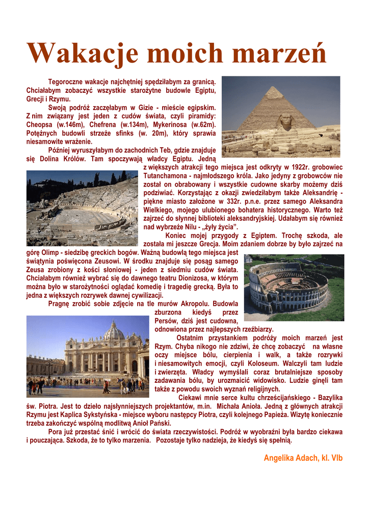 Wakacje moich marzeń Tegoroczne wakacje najchętniej spędziłabym za granicą. Chciałabym zobaczyć wszystkie staroŜytne budowle Egiptu, Grecji i Rzymu. Swoją podróŜ zaczęłabym w Gizie - mieście egipskim. Z nim związany jest jeden z cudów świata, czyli piramidy: Cheopsa (w.146m), Chefrena (w.134m), Mykerinosa (w.62m). PotęŜnych budowli strzeŜe sfinks (w. 20m), który sprawia niesamowite wraŜenie. Później wyruszyłabym do zachodnich Teb, gdzie znajduje się Dolina Królów. Tam spoczywają władcy Egiptu. Jedną z większych atrakcji tego miejsca jest odkryty w 1922r. grobowiec Tutanchamona - najmłodszego króla. Jako jedyny z grobowców nie został on obrabowany i wszystkie cudowne skarby moŜemy dziś podziwiać. Korzystając z okazji zwiedziłabym takŜe Aleksandrię piękne miasto załoŜone w 332r. p.n.e. przez samego Aleksandra Wielkiego, mojego ulubionego bohatera historycznego. Warto teŜ zajrzeć do słynnej biblioteki aleksandryjskiej. Udałabym się równieŜ nad wybrzeŜe Nilu - „Ŝyły Ŝycia”. Koniec mojej przygody z Egiptem. Trochę szkoda, ale została mi jeszcze Grecja. Moim zdaniem dobrze by było zajrzeć na górę Olimp - siedzibę greckich bogów. WaŜną budowlą tego miejsca jest świątynia poświęcona Zeusowi. W środku znajduje się posąg samego Zeusa zrobiony z kości słoniowej - jeden z siedmiu cudów świata. Chciałabym równieŜ wybrać się do dawnego teatru Dionizosa, w którym moŜna było w staroŜytności oglądać komedię i tragedię grecką. Była to jedna z większych rozrywek dawnej cywilizacji. Pragnę zrobić sobie zdjęcie na tle murów Akropolu. Budowla zburzona kiedyś przez Persów, dziś jest cudowna, odnowiona przez najlepszych rzeźbiarzy. Ostatnim przystankiem podróŜy moich marzeń jest Rzym. Chyba nikogo nie zdziwi, Ŝe chcę zobaczyć na własne oczy miejsce bólu, cierpienia i walk, a takŜe rozrywki i niesamowitych emocji, czyli Koloseum. Walczyli tam ludzie i zwierzęta. Władcy wymyślali coraz brutalniejsze sposoby zadawania bólu, by urozmaicić widowisko. Ludzie ginęli tam takŜe z powodu swoich wyznań religijnych. Ciekawi mnie serce kultu chrześcijańskiego - Bazylika św. Piotra. Jest to dzieło najsłynniejszych projektantów, m.in. Michała Anioła. Jedną z głównych atrakcji Rzymu jest Kaplica Sykstyńska - miejsce wyboru następcy Piotra, czyli kolejnego PapieŜa. Wizytę koniecznie trzeba zakończyć wspólną modlitwą Anioł Pański. Pora juŜ przestać śnić i wrócić do świata rzeczywistości. PodróŜ w wyobraźni była bardzo ciekawa i pouczająca. Szkoda, Ŝe to tylko marzenia. Pozostaje tylko nadzieja, Ŝe kiedyś się spełnią. Angelika Adach, kl. VIb