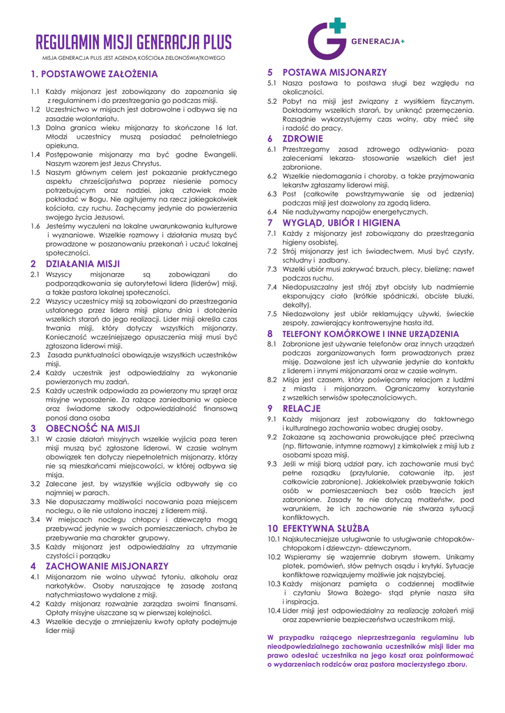 REGULAMIN MISJI GENERACJA PLUS MISJA GENERACJA PLUS JEST AGENDĄ KOŚCIOŁA ZIELONOŚWIĄTKOWEGO 1. PODSTAWOWE ZAŁOŻENIA 1.1 Każdy misjonarz jest zobowiązany do zapoznania się z regulaminem i do przestrzegania go podczas misji. 1.2 Uczestnictwo w misjach jest dobrowolne i odbywa się na zasadzie wolontariatu. 1.3 Dolna granica wieku misjonarzy to skończone 16 lat. Młodzi uczestnicy muszą posiadać pełnoletniego opiekuna. 1.4 Postępowanie misjonarzy ma być godne Ewangelii. Naszym wzorem jest Jezus Chrystus. 1.5 Naszym głównym celem jest pokazanie praktycznego aspektu chrześcijaństwa poprzez niesienie pomocy potrzebującym oraz nadziei, jaką człowiek może pokładać w Bogu. Nie agitujemy na rzecz jakiegokolwiek kościoła, czy ruchu. Zachęcamy jedynie do powierzenia swojego życia Jezusowi. 1.6 Jesteśmy wyczuleni na lokalne uwarunkowania kulturowe i wyznaniowe. Wszelkie rozmowy i działania muszą być prowadzone w poszanowaniu przekonań i uczuć lokalnej społeczności. 2 DZIAŁANIA MISJI 2.1 Wszyscy misjonarze są zobowiązani do podporządkowania się autorytetowi lidera (liderów) misji, a także pastora lokalnej społeczności. 2.2 Wszyscy uczestnicy misji są zobowiązani do przestrzegania ustalonego przez lidera misji planu dnia i dołożenia wszelkich starań do jego realizacji. Lider misji określa czas trwania misji, który dotyczy wszystkich misjonarzy. Konieczność wcześniejszego opuszczenia misji musi być zgłoszona liderowi misji. 2.3 Zasada punktualności obowiązuje wszystkich uczestników misji. 2.4 Każdy uczestnik jest odpowiedzialny za wykonanie powierzonych mu zadań. 2.5 Każdy uczestnik odpowiada za powierzony mu sprzęt oraz misyjne wyposażenie. Za rażące zaniedbania w opiece oraz świadome szkody odpowiedzialność finansową ponosi dana osoba 3 OBECNOŚĆ NA MISJI 3.1 W czasie działań misyjnych wszelkie wyjścia poza teren misji muszą być zgłoszone liderowi. W czasie wolnym obowiązek ten dotyczy niepełnoletnich misjonarzy, którzy nie są mieszkańcami miejscowości, w której odbywa się misja. 3.2 Zalecane jest, by wszystkie wyjścia odbywały się co najmniej w parach. 3.3 Nie dopuszczamy możliwości nocowania poza miejscem noclegu, o ile nie ustalono inaczej z liderem misji. 3.4 W miejscach noclegu chłopcy i dziewczęta mogą przebywać jedynie w swoich pomieszczeniach, chyba że przebywanie ma charakter grupowy. 3.5 Każdy misjonarz jest odpowiedzialny za utrzymanie czystości i porządku 4 ZACHOWANIE MISJONARZY 4.1 Misjonarzom nie wolno używać tytoniu, alkoholu oraz narkotyków. Osoby naruszające tę zasadę zostaną natychmiastowo wydalone z misji. 4.2 Każdy misjonarz rozważnie zarządza swoimi finansami. Opłaty misyjne uiszczane są w pierwszej kolejności. 4.3 Wszelkie decyzje o zmniejszeniu kwoty opłaty podejmuje lider misji 5 POSTAWA MISJONARZY 5.1 Nasza postawa to postawa sługi bez względu na okoliczności. 5.2 Pobyt na misji jest związany z wysiłkiem fizycznym. Dokładamy wszelkich starań, by uniknąć przemęczenia. Rozsądnie wykorzystujemy czas wolny, aby mieć siłę i radość do pracy. 6 ZDROWIE 6.1 Przestrzegamy zasad zdrowego odżywiania- poza zaleceniami lekarza- stosowanie wszelkich diet jest zabronione. 6.2 Wszelkie niedomagania i choroby, a także przyjmowania lekarstw zgłaszamy liderowi misji. 6.3 Post (całkowite powstrzymywanie się od jedzenia) podczas misji jest dozwolony za zgodą lidera. 6.4 Nie nadużywamy napojów energetycznych. 7 WYGLĄD, UBIÓR I HIGIENA 7.1 Każdy z misjonarzy jest zobowiązany do przestrzegania higieny osobistej. 7.2 Strój misjonarzy jest ich świadectwem. Musi być czysty, schludny i zadbany. 7.3 Wszelki ubiór musi zakrywać brzuch, plecy, bieliznę; nawet podczas ruchu. 7.4 Niedopuszczalny jest strój zbyt obcisły lub nadmiernie eksponujący ciało (krótkie spódniczki, obcisłe bluzki, dekolty). 7.5 Niedozwolony jest ubiór reklamujący używki, świeckie zespoły, zawierający kontrowersyjne hasła itd. 8 TELEFONY KOMÓRKOWE I INNE URZĄDZENIA 8.1 Zabronione jest używanie telefonów oraz innych urządzeń podczas zorganizowanych form prowadzonych przez misję. Dozwolone jest ich używanie jedynie do kontaktu z liderem i innymi misjonarzami oraz w czasie wolnym. 8.2 Misja jest czasem, który poświęcamy relacjom z ludźmi z miasta i misjonarzom. Ograniczamy korzystanie z wszelkich serwisów społecznościowych. 9 RELACJE 9.1 Każdy misjonarz jest zobowiązany do taktownego i kulturalnego zachowania wobec drugiej osoby. 9.2 Zakazane są zachowania prowokujące płeć przeciwną (np. flirtowanie, intymne rozmowy) z kimkolwiek z misji lub z osobami spoza misji. 9.3 Jeśli w misji biorą udział pary, ich zachowanie musi być pełne rozsądku (przytulanie, całowanie itp. jest całkowicie zabronione). Jakiekolwiek przebywanie takich osób w pomieszczeniach bez osób trzecich jest zabronione. Zasady te nie dotyczą małżeństw, pod warunkiem, że ich zachowanie nie stwarza sytuacji konfliktowych. 10 EFEKTYWNA SŁUŻBA 10.1 Najskuteczniejsze usługiwanie to usługiwanie chłopakówchłopakom i dziewczyn- dziewczynom. 10.2 Wspieramy się wzajemnie dobrym słowem. Unikamy plotek, pomówień, słów pełnych osądu i krytyki. Sytuacje konfliktowe rozwiązujemy możliwie jak najszybciej. 10.3 Każdy misjonarz pamięta o codziennej modlitwie i czytaniu Słowa Bożego- stąd płynie nasza siła i inspiracja. 10.4 Lider misji jest odpowiedzialny za realizację założeń misji oraz zapewnienie bezpieczeństwa uczestnikom misji. W przypadku rażącego nieprzestrzegania regulaminu lub nieodpowiedzialnego zachowania uczestników misji lider ma prawo odesłać uczestnika na jego koszt oraz poinformować o wydarzeniach rodziców oraz pastora macierzystego zboru.