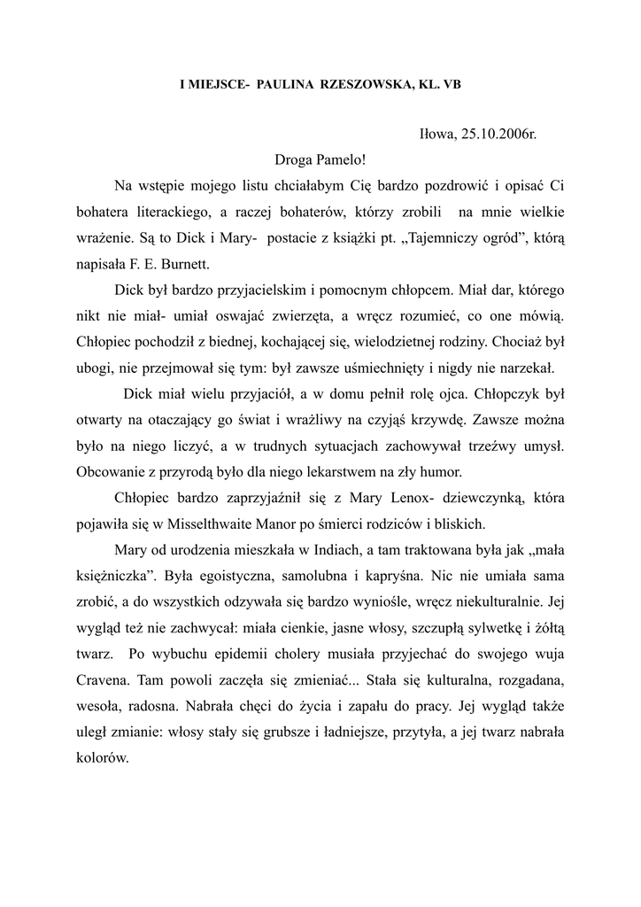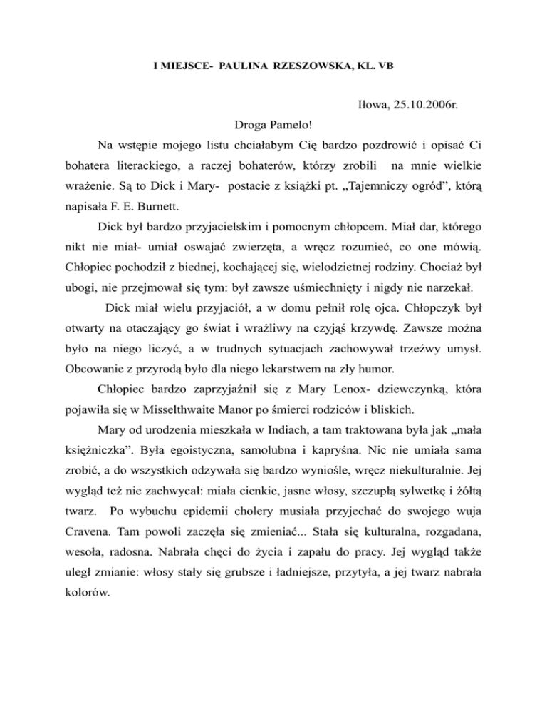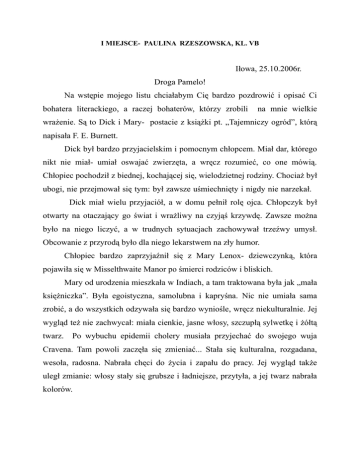 I MIEJSCE- PAULINA RZESZOWSKA, KL. VB Iłowa, 25.10.2006r. Droga Pamelo! Na wstępie mojego listu chciałabym Cię bardzo pozdrowić i opisać Ci bohatera literackiego, a raczej bohaterów, którzy zrobili na mnie wielkie wrażenie. Są to Dick i Mary- postacie z książki pt. „Tajemniczy ogród”, którą napisała F. E. Burnett. Dick był bardzo przyjacielskim i pomocnym chłopcem. Miał dar, którego nikt nie miał- umiał oswajać zwierzęta, a wręcz rozumieć, co one mówią. Chłopiec pochodził z biednej, kochającej się, wielodzietnej rodziny. Chociaż był ubogi, nie przejmował się tym: był zawsze uśmiechnięty i nigdy nie narzekał. Dick miał wielu przyjaciół, a w domu pełnił rolę ojca. Chłopczyk był otwarty na otaczający go świat i wrażliwy na czyjąś krzywdę. Zawsze można było na niego liczyć, a w trudnych sytuacjach zachowywał trzeźwy umysł. Obcowanie z przyrodą było dla niego lekarstwem na zły humor. Chłopiec bardzo zaprzyjaźnił się z Mary Lenox- dziewczynką, która pojawiła się w Misselthwaite Manor po śmierci rodziców i bliskich. Mary od urodzenia mieszkała w Indiach, a tam traktowana była jak „mała księżniczka”. Była egoistyczna, samolubna i kapryśna. Nic nie umiała sama zrobić, a do wszystkich odzywała się bardzo wyniośle, wręcz niekulturalnie. Jej wygląd też nie zachwycał: miała cienkie, jasne włosy, szczupłą sylwetkę i żółtą twarz. Po wybuchu epidemii cholery musiała przyjechać do swojego wuja Cravena. Tam powoli zaczęła się zmieniać... Stała się kulturalna, rozgadana, wesoła, radosna. Nabrała chęci do życia i zapału do pracy. Jej wygląd także uległ zmianie: włosy stały się grubsze i ładniejsze, przytyła, a jej twarz nabrała kolorów. Mary pokochała świat, wyzbyła się egoizmu, a wszystko dzięki pomocy Dicka, który pokazał jej, że każdy potrafi czarować, to znaczy pielęgnować i obserwować przyrodę i czerpać radość z pomocy drugiemu człowiekowi. W książce tej występuje jeszcze Colin, ale jego historię opiszę Ci w kolejnym liście. Zachęcam Cię do przeczytania tej książki- jestem pewna, że Ci się spodoba. Pozdrawiam Cię gorąco. Paulina