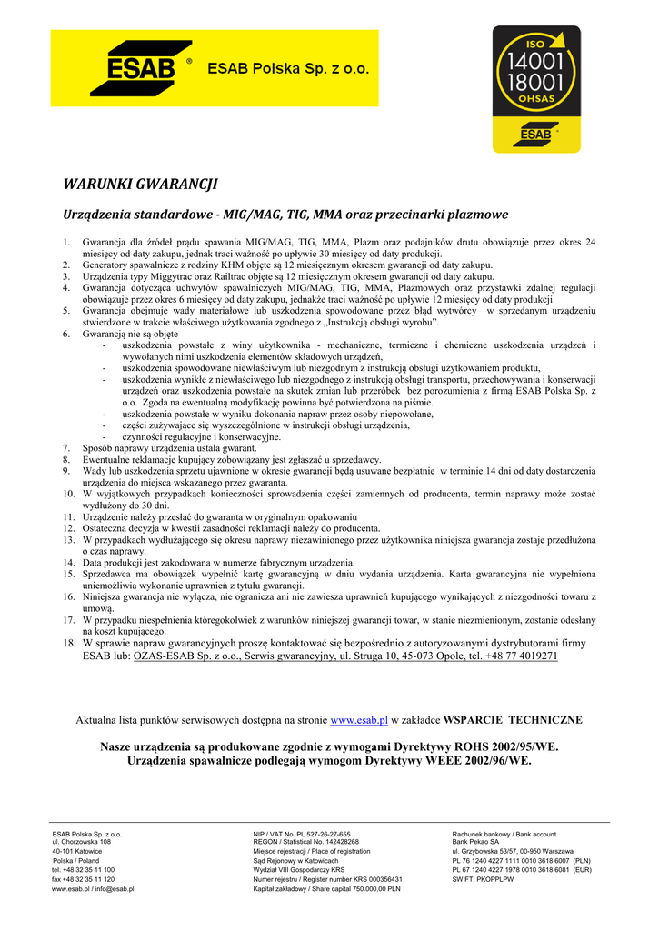 WARUNKI GWARANCJI Urządzenia standardowe - MIG/MAG, TIG, MMA oraz przecinarki plazmowe 1. 2. 3. 4. 5. 6. 7. 8. 9. 10. 11. 12. 13. 14. 15. 16. 17. Gwarancja dla źródeł prądu spawania MIG/MAG, TIG, MMA, Plazm oraz podajników drutu obowiązuje przez okres 24 miesięcy od daty zakupu, jednak traci ważność po upływie 30 miesięcy od daty produkcji. Generatory spawalnicze z rodziny KHM objęte są 12 miesięcznym okresem gwarancji od daty zakupu. Urządzenia typy Miggytrac oraz Railtrac objęte są 12 miesięcznym okresem gwarancji od daty zakupu. Gwarancja dotycząca uchwytów spawalniczych MIG/MAG, TIG, MMA, Plazmowych oraz przystawki zdalnej regulacji obowiązuje przez okres 6 miesięcy od daty zakupu, jednakże traci ważność po upływie 12 miesięcy od daty produkcji Gwarancja obejmuje wady materiałowe lub uszkodzenia spowodowane przez błąd wytwórcy w sprzedanym urządzeniu stwierdzone w trakcie właściwego użytkowania zgodnego z „Instrukcją obsługi wyrobu”. Gwarancją nie są objęte uszkodzenia powstałe z winy użytkownika - mechaniczne, termiczne i chemiczne uszkodzenia urządzeń i wywołanych nimi uszkodzenia elementów składowych urządzeń, uszkodzenia spowodowane niewłaściwym lub niezgodnym z instrukcją obsługi użytkowaniem produktu, uszkodzenia wynikłe z niewłaściwego lub niezgodnego z instrukcją obsługi transportu, przechowywania i konserwacji urządzeń oraz uszkodzenia powstałe na skutek zmian lub przeróbek bez porozumienia z firmą ESAB Polska Sp. z o.o. Zgoda na ewentualną modyfikację powinna być potwierdzona na piśmie. uszkodzenia powstałe w wyniku dokonania napraw przez osoby niepowołane, części zużywające się wyszczególnione w instrukcji obsługi urządzenia, czynności regulacyjne i konserwacyjne. Sposób naprawy urządzenia ustala gwarant. Ewentualne reklamacje kupujący zobowiązany jest zgłaszać u sprzedawcy. Wady lub uszkodzenia sprzętu ujawnione w okresie gwarancji będą usuwane bezpłatnie w terminie 14 dni od daty dostarczenia urządzenia do miejsca wskazanego przez gwaranta. W wyjątkowych przypadkach konieczności sprowadzenia części zamiennych od producenta, termin naprawy może zostać wydłużony do 30 dni. Urządzenie należy przesłać do gwaranta w oryginalnym opakowaniu Ostateczna decyzja w kwestii zasadności reklamacji należy do producenta. W przypadkach wydłużającego się okresu naprawy niezawinionego przez użytkownika niniejsza gwarancja zostaje przedłużona o czas naprawy. Data produkcji jest zakodowana w numerze fabrycznym urządzenia. Sprzedawca ma obowiązek wypełnić kartę gwarancyjną w dniu wydania urządzenia. Karta gwarancyjna nie wypełniona uniemożliwia wykonanie uprawnień z tytułu gwarancji. Niniejsza gwarancja nie wyłącza, nie ogranicza ani nie zawiesza uprawnień kupującego wynikających z niezgodności towaru z umową. W przypadku niespełnienia któregokolwiek z warunków niniejszej gwarancji towar, w stanie niezmienionym, zostanie odesłany na koszt kupującego. 18. W sprawie napraw gwarancyjnych proszę kontaktować się bezpośrednio z autoryzowanymi dystrybutorami firmy ESAB lub: OZAS-ESAB Sp. z o.o., Serwis gwarancyjny, ul. Struga 10, 45-073 Opole, tel. +48 77 4019271 Aktualna lista punktów serwisowych dostępna na stronie www.esab.pl w zakładce WSPARCIE TECHNICZNE Nasze urządzenia są produkowane zgodnie z wymogami Dyrektywy ROHS 2002/95/WE. Urządzenia spawalnicze podlegają wymogom Dyrektywy WEEE 2002/96/WE. ESAB Polska Sp. z o.o. ul. Chorzowska 108 40-101 Katowice Polska / Poland tel. +48 32 35 11 100 fax +48 32 35 11 120 www.esab.pl / [email protected] NIP / VAT No. PL 527-26-27-655 REGON / Statistical No. 142428268 Miejsce rejestracji / Place of registration Sąd Rejonowy w Katowicach Wydział VIII Gospodarczy KRS Numer rejestru / Register number KRS 000356431 Kapitał zakładowy / Share capital 750.000,00 PLN Rachunek bankowy / Bank account Bank Pekao SA ul. Grzybowska 53/57, 00-950 Warszawa PL 76 1240 4227 1111 0010 3618 6007 (PLN) PL 67 1240 4227 1978 0010 3618 6081 (EUR) SWIFT: PKOPPLPW