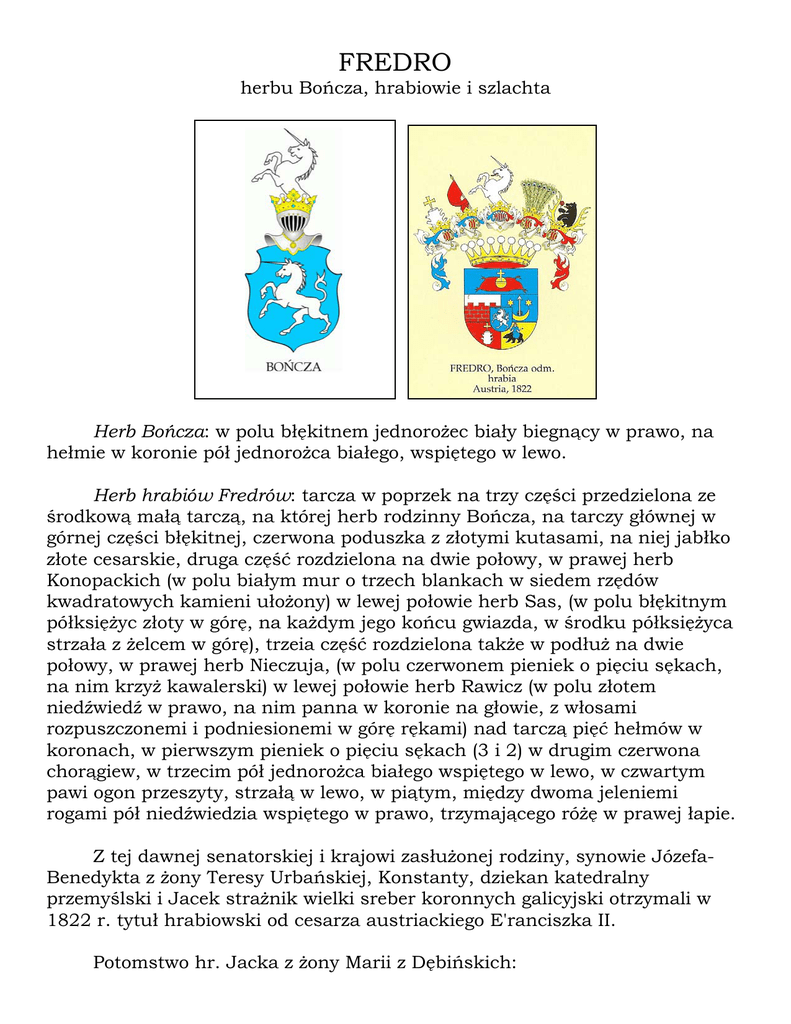 FREDRO herbu Bończa, hrabiowie i szlachta Herb Bończa: w polu błękitnem jednorożec biały biegnący w prawo, na hełmie w koronie pół jednorożca białego, wspiętego w lewo. Herb hrabiów Fredrów: tarcza w poprzek na trzy części przedzielona ze środkową małą tarczą, na której herb rodzinny Bończa, na tarczy głównej w górnej części błękitnej, czerwona poduszka z złotymi kutasami, na niej jabłko złote cesarskie, druga część rozdzielona na dwie połowy, w prawej herb Konopackich (w polu białym mur o trzech blankach w siedem rzędów kwadratowych kamieni ułożony) w lewej połowie herb Sas, (w polu błękitnym półksiężyc złoty w górę, na każdym jego końcu gwiazda, w środku półksiężyca strzała z żelcem w górę), trzeia część rozdzielona także w podłuż na dwie połowy, w prawej herb Nieczuja, (w polu czerwonem pieniek o pięciu sękach, na nim krzyż kawalerski) w lewej połowie herb Rawicz (w polu złotem niedźwiedź w prawo, na nim panna w koronie na głowie, z włosami rozpuszczonemi i podniesionemi w górę rękami) nad tarczą pięć hełmów w koronach, w pierwszym pieniek o pięciu sękach (3 i 2) w drugim czerwona chorągiew, w trzecim pół jednorożca białego wspiętego w lewo, w czwartym pawi ogon przeszyty, strzałą w lewo, w piątym, między dwoma jeleniemi rogami pół niedźwiedzia wspiętego w prawo, trzymającego różę w prawej łapie. Z tej dawnej senatorskiej i krajowi zasłużonej rodziny, synowie JózefaBenedykta z żony Teresy Urbańskiej, Konstanty, dziekan katedralny przemyślski i Jacek strażnik wielki sreber koronnych galicyjski otrzymali w 1822 r. tytuł hrabiowski od cesarza austriackiego E'ranciszka II. Potomstwo hr. Jacka z żony Marii z Dębińskich: l) hr. Maksymilian jenerał brygady i marszałek dworu polskiego, umarł 1847 r., z żony Praskowij hr. Gołowin syn Maksymilian ur. 1820 r., szambelan rosyjski, 2) hr. Aleksander ur. 1794 r., podpułkownik wojsk polskich, słynny autor dramatyczny, członek akademii krakowskiej i wielu towarzystw uczonych, † 1876 r., zaśl. 1828 Zofię hr. Jabłonowską (ur. 1798), z niej: a) hr. Aleksander-Jan ur. 1829, autor dramatyczny, zaślubił 1858 r. Maryę hr. Mier (urodz. 1839, † 1862) z niej: hr. Andrzej-Maksymilian ur. 1859. hr. Marya. ur. 1862, b) hr. Zofia ur. 1837, zaśl. 1861 r. Janowi hr. Szeptyckiemu, 3) hr. Henryk ur. 1800, um. 1867, oficer wojsk polskich, dziedzic dóbr Liszno i inne, zaśl. 1842 Marię hr. Jabłonowską z niej: a) hr. Henryka ur. 1844, zaśl. 1864 r. Mikołaja hr. Palfy von Erdödy, b) hr. Kazimiera nr. 18,15, zaśl. 1862 Witoldowi hr. Dunin Borkowskiemu, e) hr. Stefan ur. 1847, d) hr. Marya ur. 1852, 4) hr. Edward ur. 1803, oficer wojsk polskich, szambelan austriacki, zaśl. 1827 Marię Rzeczycką wdowę po Kickim, ostatnią z swojej familii, z niej: a) hr. Edward-Ksawery ur. 1829, 5) † hr. Seweryn podpułkownik gwardii cesarza Napoleona l, dziedzic dóbr Nowosiołek w Galicii, ożen. z Domicellą hr. Konarską, 6) † hr. Julian ożen. z Kordulą hr. Krasińską, wdową po Kajetanie Horodyski, - bezpotomny.