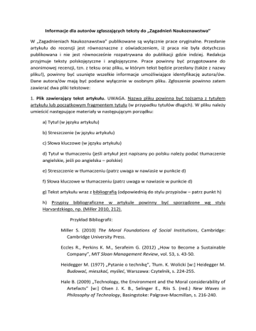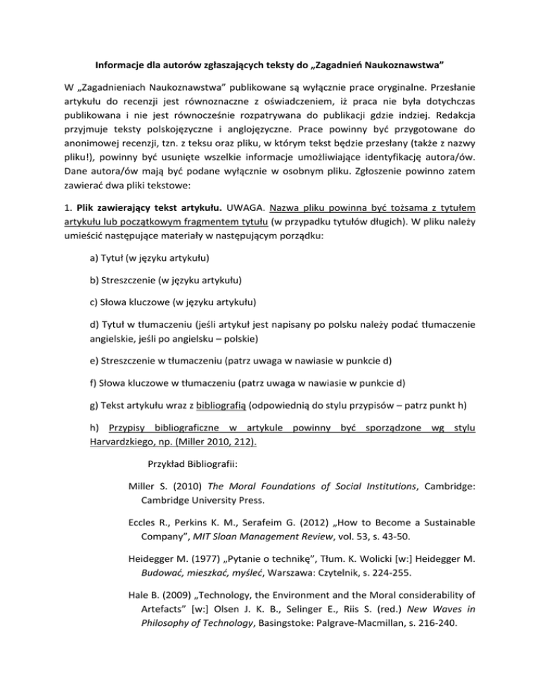 Informacje dla autorów zgłaszających teksty do „Zagadnień Naukoznawstwa” W „Zagadnieniach Naukoznawstwa” publikowane są wyłącznie prace oryginalne. Przesłanie artykułu do recenzji jest równoznaczne z oświadczeniem, iż praca nie była dotychczas publikowana i nie jest równocześnie rozpatrywana do publikacji gdzie indziej. Redakcja przyjmuje teksty polskojęzyczne i anglojęzyczne. Prace powinny być przygotowane do anonimowej recenzji, tzn. z teksu oraz pliku, w którym tekst będzie przesłany (także z nazwy pliku!), powinny być usunięte wszelkie informacje umożliwiające identyfikację autora/ów. Dane autora/ów mają być podane wyłącznie w osobnym pliku. Zgłoszenie powinno zatem zawierać dwa pliki tekstowe: 1. Plik zawierający tekst artykułu. UWAGA. Nazwa pliku powinna być tożsama z tytułem artykułu lub początkowym fragmentem tytułu (w przypadku tytułów długich). W pliku należy umieścić następujące materiały w następującym porządku: a) Tytuł (w języku artykułu) b) Streszczenie (w języku artykułu) c) Słowa kluczowe (w języku artykułu) d) Tytuł w tłumaczeniu (jeśli artykuł jest napisany po polsku należy podać tłumaczenie angielskie, jeśli po angielsku – polskie) e) Streszczenie w tłumaczeniu (patrz uwaga w nawiasie w punkcie d) f) Słowa kluczowe w tłumaczeniu (patrz uwaga w nawiasie w punkcie d) g) Tekst artykułu wraz z bibliografią (odpowiednią do stylu przypisów – patrz punkt h) h) Przypisy bibliograficzne w artykule powinny być sporządzone wg stylu Harvardzkiego, np. (Miller 2010, 212). Przykład Bibliografii: Miller S. (2010) The Moral Foundations of Social Institutions, Cambridge: Cambridge University Press. Eccles R., Perkins K. M., Serafeim G. (2012) „How to Become a Sustainable Company”, MIT Sloan Management Review, vol. 53, s. 43-50. Heidegger M. (1977) „Pytanie o technikę”, Tłum. K. Wolicki [w:] Heidegger M. Budować, mieszkać, myśleć, Warszawa: Czytelnik, s. 224-255. Hale B. (2009) „Technology, the Environment and the Moral considerability of Artefacts” [w:] Olsen J. K. B., Selinger E., Riis S. (red.) New Waves in Philosophy of Technology, Basingstoke: Palgrave-Macmillan, s. 216-240. ONZ (2012) The Future We Want, Dokument internetowy: http://www.un.org/ga/search/view_doc.asp?symbol=A/RES/66/288&Lang =E. [Dostęp: 14 lipca 2014]. Teksty nie posiadające ww. elementów będą odsyłane do autorów. 2. Plik z danymi autora/ów [wg formularza znajdującego się na stronie]. Należy podać imiona i nazwiska autorów oraz ich afiliacje, a także wskazać autora do korespondencji (z podaniem pełnego adresu korespondencyjnego, numeru telefonu i adresu e-mail). W przypadku zgłoszeń tekstów innych, niż artykuły (np. recenzji, sprawozdań itp.) nie należy zamieszczać streszczeń oraz słów kluczowych. Pliki tekstowe należy przygotować w formacie Word (doc lub docx). Jeżeli w tekście znajdują się elementy graficzne (zdjęcia, rysunki, wykresy itp.) należy je przesłać w osobnych plikach graficznych. Pliki te należy nazwać zgodnie z ich podpisem w tekście (np.: „rys 1.tiff”, „wykres 2.tiff” itp.). W samym tekście należy wyraźnie wskazać miejsce, w którym dana grafika ma się znaleźć (przykładowo poprzez umieszczenie w kwadratowych nawiasach napisu typu „Tutaj należy umieścić grafikę z pliku …”). UWAGA. Grafiki mogą być wklejone do pliku tekstowego, ale nawet w takich przypadkach należy je ponadto przesłać w oddzielnych plikach graficznych. Pliki należy nadsyłać wyłącznie drogą elektroniczną na adres: [email protected] Inne formy zgłoszenia (w tym zgłoszenia dokonane tradycyjną pocztą) nie będą przyjmowane. Zakwalifikowanie tekstu do druku następuje w oparciu o recenzje z zachowaniem zasady dwustronnej anonimowości (autorzy tekstów i recenzenci nie znają wzajemnie swoich nazwisk). W przypadku uwag zgłoszonych przez recenzentów są one przesyłane do autora, który jest proszony o przesłanie poprawionej wersji tekstu. Redakcja zastrzega sobie prawo dokonywania drobnych poprawek stylistycznych i terminologicznych w nadesłanych tekstach bez uzgodnienia z autorem. Redakcja zastrzega sobie także prawo odmowy przyjęcia tekstu bez skierowania go do recenzji, jeżeli jego treść nie koresponduje z problematyką czasopisma lub nie spełnia wytycznych czasopisma, dotyczących przygotowania tekstu do publikacji. Za prawa cytowania fragmentów innych publikacji (tekstów, tabel, rycin oraz ilustracji) odpowiedzialni są autorzy artykułu. Redakcja nie płaci honorarium za opublikowane teksty. Prawa wydawnicze wydrukowanych prac przechodzą na Wydawcę.