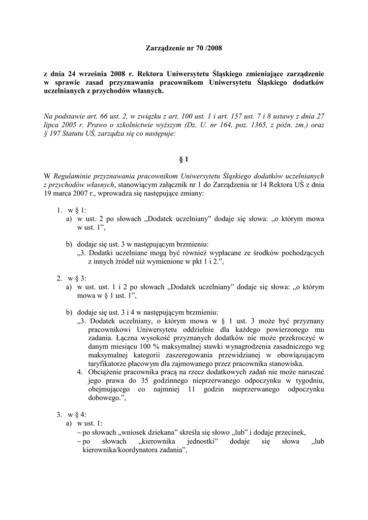Zarządzenie nr 70 /2008 z dnia 24 września 2008 r. Rektora Uniwersytetu Śląskiego zmieniające zarządzenie w sprawie zasad przyznawania pracownikom Uniwersytetu Śląskiego dodatków uczelnianych z przychodów własnych. Na podstawie art. 66 ust. 2, w związku z art. 100 ust. 1 i art. 157 ust. 7 i 8 ustawy z dnia 27 lipca 2005 r. Prawo o szkolnictwie wyższym (Dz. U. nr 164, poz. 1365, z późn. zm.) oraz § 197 Statutu UŚ, zarządza się co następuje: §1 W Regulaminie przyznawania pracownikom Uniwersytetu Śląskiego dodatków uczelnianych z przychodów własnych, stanowiącym załącznik nr 1 do Zarządzenia nr 14 Rektora UŚ z dnia 19 marca 2007 r., wprowadza się następujące zmiany: 1. w § 1: a) w ust. 2 po słowach „Dodatek uczelniany” dodaje się słowa: „o którym mowa w ust. 1”, b) dodaje się ust. 3 w następującym brzmieniu: „3. Dodatki uczelniane mogą być również wypłacane ze środków pochodzących z innych źródeł niż wymienione w pkt 1 i 2.”, 2. w § 3: a) w ust. ust. 1 i 2 po słowach „Dodatek uczelniany” dodaje się słowa: „o którym mowa w § 1 ust. 1”, b) dodaje się ust. 3 i 4 w następującym brzmieniu: „3. Dodatek uczelniany, o którym mowa w § 1 ust. 3 może być przyznany pracownikowi Uniwersytetu oddzielnie dla każdego powierzonego mu zadania. Łączna wysokość przyznanych dodatków nie może przekroczyć w danym miesiącu 100 % maksymalnej stawki wynagrodzenia zasadniczego wg maksymalnej kategorii zaszeregowania przewidzianej w obowiązującym taryfikatorze płacowym dla zajmowanego przez pracownika stanowiska. 4. Obciążenie pracownika pracą na rzecz dodatkowych zadań nie może naruszać jego prawa do 35 godzinnego nieprzerwanego odpoczynku w tygodniu, obejmującego co najmniej 11 godzin nieprzerwanego odpoczynku dobowego.”, 3. w § 4: a) w ust. 1: − po słowach „wniosek dziekana” skreśla się słowo „lub” i dodaje przecinek, − po słowach „kierownika jednostki” dodaje się słowa „lub kierownika/koordynatora zadania”, b) ust. 2 otrzymuje następujące brzmienie: „2. Dodatki uczelniane przyznaje na czas określony Rektor z własnej inicjatywy lub na umotywowane wnioski dziekanów, kierowników jednostek organizacyjnych niebędących wydziałami lub kierownika/koordynatora zadania, jednak nie dłużej niż na 12 miesięcy z wyjątkiem dodatków określonych w § 1 ust. 3, które mogą być przyznane na czas realizacji zadania. Dziekanom lub kierownikom jednostek organizacyjnych niebędących wydziałami oraz podporządkowanym bezpośrednio Rektorowi pracownikom samodzielnym dodatki uczelniane przyznaje Rektor z własnej inicjatywy.”, c) w ust. 4: − po słowach „wniosek dziekana” skreśla się słowo „lub” i dodaje przecinek, − po słowach „niebędącej wydziałem” dodaje się słowa „lub kierownika/koordynatora zadania”, − w miejsce słów: „z odpłatności za usługi edukacyjne” wpisuje się słowo „finansowych”, 4. § 5 otrzymuje następujące brzmienie: „§ 5 1. Dodatek uczelniany płatny miesięcznie z dołu jest częścią wynagrodzenia za pracę. 2. Dodatek uczelniany, o którym mowa w § 3 ust. 1 i 3 pomniejszany jest proporcjonalnie za okres pobierania przez pracownika: − wynagrodzenia za czas choroby, − zasiłku chorobowego z ubezpieczenia społecznego, − zasiłku opiekuńczego, − zasiłku macierzyńskiego, − świadczenia rehabilitacyjnego.”. §2 Tekst jednolity Regulaminu przyznawania pracownikom Uniwersytetu Śląskiego dodatków uczelnianych z przychodów własnych stanowi załącznik nr 1 do niniejszego zarządzenia. §3 Zarządzenie wchodzi w życie z dniem 24 września 2008 r. REKTOR Prof. zw. dr hab. Wiesław Banyś 2