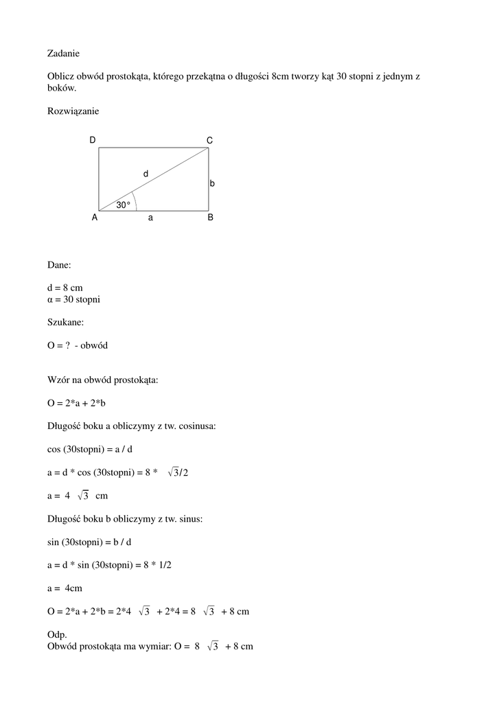Zadanie Oblicz obwód prostokąta, którego przekątna o długości 8cm tworzy kąt 30 stopni z jednym z boków. Rozwiązanie D C d b 30° A a B Dane: d = 8 cm α = 30 stopni Szukane: O = ? - obwód Wzór na obwód prostokąta: O = 2*a + 2*b Długość boku a obliczymy z tw. cosinusa: cos (30stopni) = a / d a = d * cos (30stopni) = 8 * a= 4 3/2 3 cm Długość boku b obliczymy z tw. sinus: sin (30stopni) = b / d a = d * sin (30stopni) = 8 * 1/2 a = 4cm O = 2*a + 2*b = 2*4 3 + 2*4 = 8 3 + 8 cm Odp. Obwód prostokąta ma wymiar: O = 8 3 + 8 cm