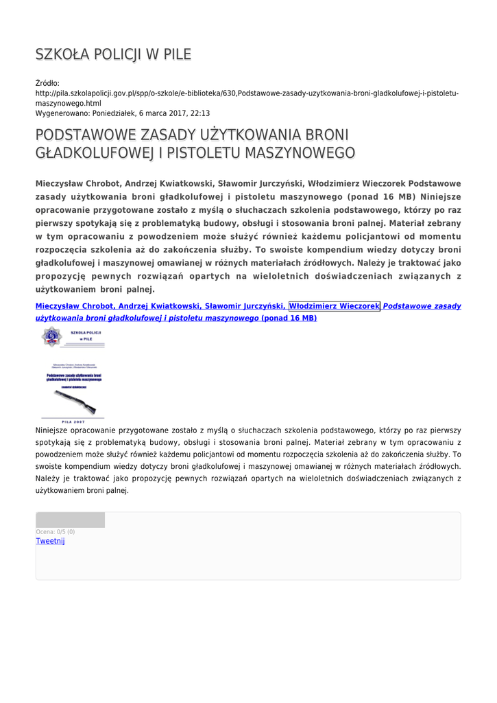 SZKOŁA POLICJI W PILE Źródło: http://pila.szkolapolicji.gov.pl/spp/o-szkole/e-biblioteka/630,Podstawowe-zasady-uzytkowania-broni-gladkolufowej-i-pistoletumaszynowego.html Wygenerowano: Poniedziałek, 6 marca 2017, 22:13 PODSTAWOWE ZASADY UŻYTKOWANIA BRONI GŁADKOLUFOWEJ I PISTOLETU MASZYNOWEGO Mieczysław Chrobot, Andrzej Kwiatkowski, Sławomir Jurczyński, Włodzimierz Wieczorek Podstawowe zasady użytkowania broni gładkolufowej i pistoletu maszynowego (ponad 16 MB) Niniejsze opracowanie przygotowane zostało z myślą o słuchaczach szkolenia podstawowego, którzy po raz pierwszy spotykają się z problematyką budowy, obsługi i stosowania broni palnej. Materiał zebrany w tym opracowaniu z powodzeniem może służyć również każdemu policjantowi od momentu rozpoczęcia szkolenia aż do zakończenia służby. To swoiste kompendium wiedzy dotyczy broni gładkolufowej i maszynowej omawianej w różnych materiałach źródłowych. Należy je traktować jako propozycję pewnych rozwiązań opartych na wieloletnich doświadczeniach związanych z użytkowaniem broni palnej. Mieczysław Chrobot, Andrzej Kwiatkowski, Sławomir Jurczyński, Włodzimierz Wieczorek Podstawowe zasady użytkowania broni gładkolufowej i pistoletu maszynowego (ponad 16 MB) Niniejsze opracowanie przygotowane zostało z myślą o słuchaczach szkolenia podstawowego, którzy po raz pierwszy spotykają się z problematyką budowy, obsługi i stosowania broni palnej. Materiał zebrany w tym opracowaniu z powodzeniem może służyć również każdemu policjantowi od momentu rozpoczęcia szkolenia aż do zakończenia służby. To swoiste kompendium wiedzy dotyczy broni gładkolufowej i maszynowej omawianej w różnych materiałach źródłowych. Należy je traktować jako propozycję pewnych rozwiązań opartych na wieloletnich doświadczeniach związanych z użytkowaniem broni palnej. Ocena: 0/5 (0) Tweetnij