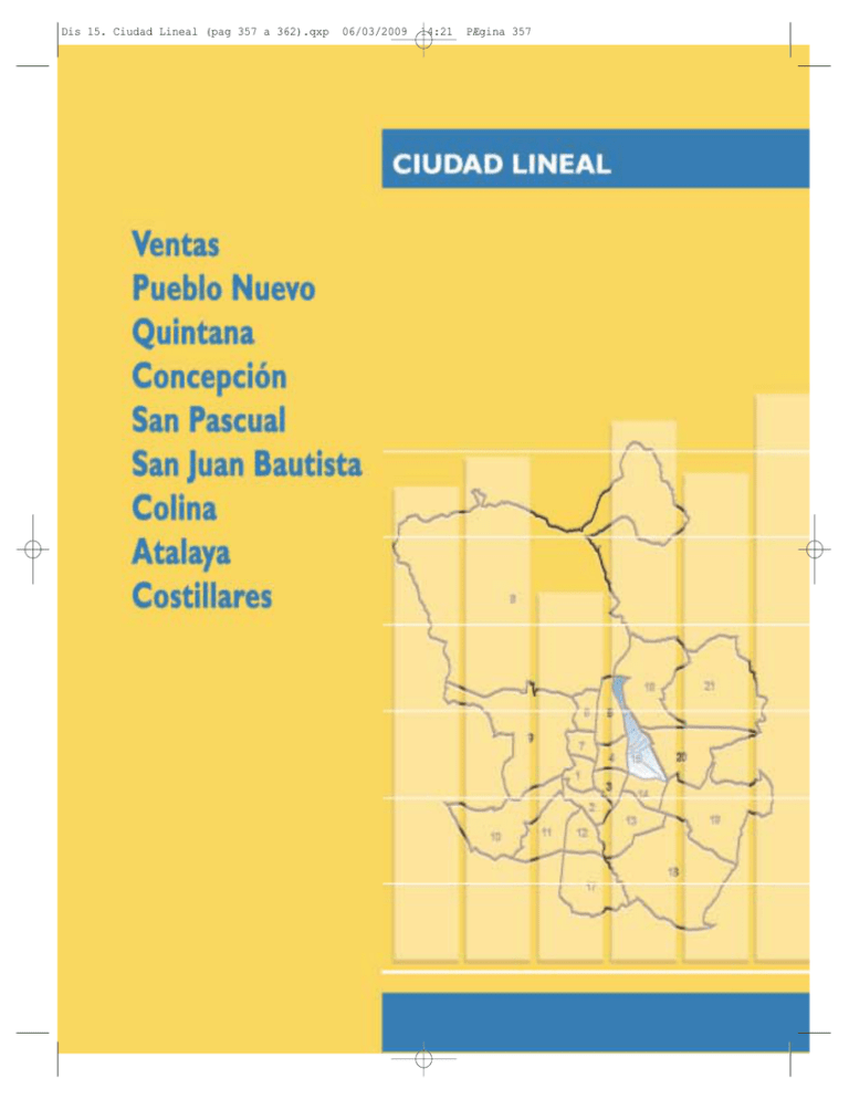 Dis 15. Ciudad Lineal (pag 357 a 362).qxp 06/03/2009 14:21 PÆgina 357 Dis 15. Ciudad Lineal (pag 357 a 362).qxp Ciudad Lineal 06/03/2009 14:21 ANUARIO ESTADÍSTICO 2008 15.1. Ventas 15.2. Pueblo Nuevo 15.3. Quintana 15.4. Concepción 15.5. San Pascual 15.6. San Juan Bautista 15.7. Colina 15.8. Atalaya 15.9. Costillares www.munimadrid.es/estadistica PÆgina 358 358 Dis 15. Ciudad Lineal (pag 357 a 362).qxp 06/03/2009 14:21 PÆgina 359 Ciudad Lineal ANUARIO ESTADÍSTICO 2008 D.15. CIUDAD LINEAL 1.1. Características generales Características Total 15.1. 15.2. 15.3. 15.4.Con- 15.5. San 15.6. S. J. 15.7. 15.8. 15.9.CosDistrito Ventas P. Nuevo Quintana cepción Pascual Bautista Colina Atalaya tillares Superficie (Ha.) 1.142,57 319,80 231,92 72,31 88,59 105,27 200 163 281 359 248 187 Población a 1-1-2008 Total De 0 a 14 años De 15 a 64 años De 65 a 74 años De 75 y más No consta 228.171 28.687 152.297 22.644 24.538 5 52.003 5.795 33.842 5.840 6.524 2 65.172 7.674 44.742 6.178 6.576 2 25.946 2.804 16.892 2.527 3.723 - 21.952 2.559 14.062 2.196 3.134 1 Hom bres De 0 a 14 años De 15 a 64 años De 65 a 74 años De 75 y más No consta 105.436 14.745 72.418 9.320 8.950 3 23.799 3.004 16.082 2.333 2.378 2 30.924 3.966 21.874 2.638 2.445 1 11.668 1.446 7.990 944 1.288 - Mujeres De 0 a 14 años De 15 a 64 años De 65 a 74 años De 75 y más No consta 122.735 13.942 79.879 13.324 15.588 2 28.204 2.791 17.760 3.507 4.146 - 34.248 3.708 22.868 3.540 4.131 1 Nacionalidad (Total) 228.171 Española 187.784 Extranjera 40.357 Unión Europea (15) 3.243 Unión Europea (ampliación a 25) 504 Otros países OCDE 663 Otros países de Europa 5.762 América Latina y Caribe 25.952 África 2.013 Otros países de Asia y Oceanía 2.214 Apátridas 6 No consta 30 % Extranjeros 17,7 52.003 41.239 10.758 491 171 83 1.658 7.549 448 355 3 6 20,7 Nacionalidad (Hom bres) 105.436 Española 85.966 Extranjera 19.451 Unión Europea (15) 1.745 Unión Europea (ampliación a 25) 220 Otros países OCDE 302 Otros países de Europa 2.809 América Latina y Caribe 11.946 África 1.263 Otros países de Asia y Oceanía 1.161 Apátridas 5 No consta 19 % Extranjeros 18,4 23.799 18.563 5.232 265 83 44 805 3.586 262 185 2 4 22,0 Densidad (hab./Ha.) 24,89 142,72 111 66 160 19.682 2.436 13.325 2.066 1.855 - 12.739 6.224 2.099 877 8.559 4.247 1.136 627 945 473 - 1.651 295 1.097 139 120 - 22.802 4.148 15.531 1.935 1.188 - 9.825 1.303 6.629 815 1.078 - 8.958 1.219 6.204 866 669 - 5.976 2.813 1.061 431 4.051 1.950 480 266 384 166 - 716 153 459 60 44 - 10.757 2.162 7.179 918 498 - 14.278 1.358 8.902 1.583 2.435 - 12.127 1.256 7.433 1.381 2.056 1 10.724 1.217 7.121 1.200 1.186 - 6.763 3.411 1.038 446 4.508 2.297 656 361 561 307 - 935 142 638 79 76 - 12.045 1.986 8.352 1.017 690 - 65.172 50.590 14.575 493 143 102 2.238 10.113 716 770 7 22,4 25.946 20.421 5.524 347 45 81 799 3.732 211 309 1 21,3 21.952 18.259 3.692 417 53 73 482 2.126 249 292 1 16,8 19.682 17.752 1.928 263 30 70 267 920 157 218 3 2 9,8 12.739 6.224 11.456 5.449 1.278 774 491 248 6 15 86 43 71 87 400 307 107 30 117 44 5 1 10,0 12,4 1.651 1.423 228 84 5 11 18 68 28 14 13,8 22.802 21.195 1.600 409 36 114 142 737 67 95 7 7,0 30.924 23.570 7.349 278 61 43 1.166 4.890 493 418 5 23,8 11.668 9.021 2.646 176 22 53 406 1.696 133 160 1 22,7 9.825 8.115 1.709 213 23 33 225 916 139 160 1 17,4 8.958 8.067 891 142 9 26 116 390 88 117 3 9,9 5.976 2.813 5.374 2.466 599 347 264 135 2 4 41 18 16 35 125 119 98 15 53 21 3 10,0 12,3 716 640 76 39 1 2 7 14 8 5 10,6 10.757 10.150 602 233 15 42 33 210 27 42 5 5,6 359 101,08 55,97 126 www.munimadrid.es/estadistica Dis 15. Ciudad Lineal (pag 357 a 362).qxp Ciudad Lineal 06/03/2009 14:21 PÆgina 360 ANUARIO ESTADÍSTICO 2008 1.1. Características generales Características Total 15.1. 15.2. 15.3. 15.4.Con- 15.5. San Distrito Ventas P. Nuevo Quintana cepción Pascual Nacionalidad (Mujeres) 122.735 28.204 Española 101.818 22.676 Extranjera 20.906 5.526 Unión Europea (15) 1.498 226 Unión Europea (ampliación a 25) 284 88 Otros países OCDE 361 39 Otros países de Europa 2.953 853 América Latina y Caribe 14.006 3.963 África 750 186 Otros países de Asia y Oceanía 1.053 170 Apátridas 1 1 No consta 11 2 % Extranjeros 17,0 19,6 34.248 27.020 7.226 215 82 59 1.072 5.223 223 352 2 21,1 14.278 11.400 2.878 171 23 28 393 2.036 78 149 20,2 12.127 10.144 1.983 204 30 40 257 1.210 110 132 16,4 10.724 9.685 1.037 121 21 44 151 530 69 101 2 9,7 -45 438 483 94 619 525 -75 192 267 -44 207 251 7 149 142 Hogares Núm ero de hogares 84.555 19.903 23.225 10.204 8.865 Tam año m edio del hogar 1 persona 2 personas 3 personas 4 personas 5 personas 6 personas 7 personas 8 personas y más 2,7 22.773 23.042 16.437 12.957 4.789 1.999 1.021 1.537 2,6 5.708 5.707 3.734 2.683 1.009 434 249 379 2,8 5.617 6.411 4.735 3.739 1.278 576 311 558 2,5 3.196 2.883 1.867 1.234 494 221 121 188 Hogares por nacionalidad Sólo españoles Sólo Extranjeros Españoles y extranjeros 71.335 16.656 5.408 1.357 7.812 1.890 19.253 1.721 2.251 3.568 3.568 - Crecim iento vegetativo (2006) Nacimientos Defunciones 156 2.074 1.918 Datos económ icos Precio m 2 vivienda de segunda m ano 31/12/2007 3.948 31/12/2006 4.083 Incremento anual -3,3 www.munimadrid.es/estadistica 3.691 3.712 -0,6 360 15.6. S. J. 15.7. 15.8. 15.9.CosBautista Colina Atalaya tillares 6.763 3.411 6.082 2.983 679 427 227 113 4 11 45 25 55 52 275 188 9 15 64 23 2 1 10,0 12,5 935 783 152 45 4 9 11 54 20 9 16,3 12.045 11.045 998 176 21 72 109 527 40 53 2 8,3 22 67 45 13 22 9 138 254 116 7.437 4.585 2.360 523 7.453 2,5 2.881 2.437 1.605 1.177 406 167 89 103 2,6 1.948 2.038 1.477 1.260 431 152 53 78 2,8 1.150 1.139 907 904 287 101 42 55 2,64 668 621 466 368 126 53 24 34 3,157 132 121 115 74 41 15 9 16 3,05944 1473 1685 1531 1518 717 280 123 126 8.408 732 1.064 7.497 585 783 6.659 308 470 3.984 1966 229 153 372 241 413 39 71 6499 284 670 3.861 4.033 -4,3 3.975 4.110 -3,3 4.397 4.295 2,4 4.526 4.612 4.762 4.605 -5,0 0,2 5.061 4.978 1,7 4.474 4.717 -