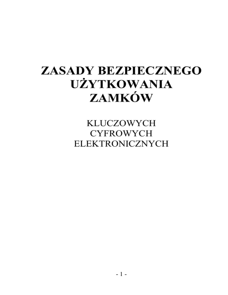 ZASADY BEZPIECZNEGO UŻYTKOWANIA ZAMKÓW KLUCZOWYCH CYFROWYCH ELEKTRONICZNYCH -1- ZAMKI KLUCZOWE ● upewnij się, że klucze znajdują się w dostarczonej wraz z urządzeniem kopercie lub woreczku foliowym. Otwórz kopertę osobiście i wypróbuj działanie kluczy na otwartych drzwiach, ● klucze zapasowe trzymaj w bezpiecznym miejscu, nigdy jednak wewnątrz szafy czy sejfu , które otwierają, ● nie pozostawiaj kluczy w miejscu do którego mają dostęp osoby niepowołane. Pozwoli to uniknąć sporządzenia nieautoryzowanych kopii, ● nie powierzaj kluczy, nawet na krótki okres czasu, osobom obcym, ● w wypadku podejrzenia, że dostęp do sejfu czy szafy mają osoby niepowołane, natychmiast podejmij działania zmierzające do wymiany zamka. W tym celu zwróć się do dostawcy urządzenia. -2- ZAMKI SZYFROWE ● niezwłocznie po rozpoczęciu użytkowania szafy lub sejfu, zmień fabryczne ustawienia kodu zamka szyfrowego, ● kilkakrotnie, osobiście, w celu nabrania wprawy dokonaj zmiany kodu zamka. Czynności te wykonuj przy otwartych drzwiach. ● jeżeli nie ufasz swojej pamięci, zapisz kod zamka i przechowuj go w miejscu zabezpieczonym przed dostępem osób niepowołanych ● nie ustawiaj kombinacji kodu w postaci ciągu kolejnych, malejących lub rosnących cyfr, ● nie ustawiaj cyfry 5( pięć) oraz 0 (zero) na końcu kombinacji cyfrowej otwierającej zamek, ponieważ kod taki jest łatwiejszy do złamania, ● unikaj powtarzania cyfr w ustawianiu kodu ( np. 331332), ● zmieniaj kombinację cyfr każdorazowo, gdy istnieje obawa, że ktoś niepowołany ją poznał, ● po zamknięciu drzwi, kilkakrotnie obróć tarcze zamka, zarówno w lewo jak i w prawo. -3- ZAMKI ELEKTRONICZNE ● niezwłocznie po rozpoczęciu użytkowania szafy lub sejfu, zmień fabryczne ustawienia kodu zamka szyfrowego, ● kilkakrotnie, osobiście, w celu nabrania wprawy dokonaj zmiany kodu zamka. Czynności te wykonuj przy otwartych drzwiach. ● jeżeli nie ufasz swojej pamięci, zapisz kod zamka i przechowuj go w miejscu zabezpieczonym przed dostępem osób niepowołanych ● staraj się jak najczęściej zmieniać kombinację kodu, aby uniknąć efektu zużywania klawiszy, ( może to w znaczący sposób ułatwić odgadnięcie szyfru przez osoby niepowołane) ● w wypadku konieczności wymiany baterii, używaj tylko tych wskazanych przez producenta zamka -4-