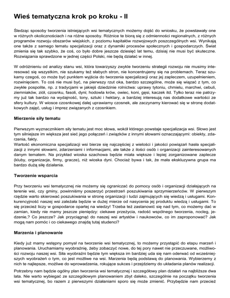 Wieś tematyczna krok po kroku - II Śledząc sposoby tworzenia istniejących wsi tematycznych możemy dojść do wniosku, że powstawały one w różnych okolicznościach i na różne sposoby. Różnice te biorą się z odmienności regionalnych, z różnych programów rozwoju obszarów wiejskich, z poziomu kapitałów rozwojowych poszczególnych wsi. Wynikają one także z samego tematu specjalizacji oraz z dynamiki procesów społecznych i gospodarczych. Świat zmienia się tak szybko, że coś, co było dobre jeszcze dziesięć lat temu, dzisiaj nie musi być skuteczne. Rozwiązania sprawdzone w jednej części Polski, nie będą działać w innej. W odróżnieniu od analizy stanu wsi, która towarzyszy zwykle tworzeniu strategii rozwoju nie musimy interesować się wszystkim, nie szukamy też słabych stron, nie koncentrujemy się na problemach. Teraz szukamy czegoś, co może być punktem wyjścia do tworzenia specjalizacji oraz jej zapleczem, uzupełnieniem, rozwinięciem. To coś nie musi być, na pierwszy rzut oka, bardzo szczególne, może się wiązać z tym, co zwykłe pospolite, np. z tradycjami w jakiejś dziedzinie rolnictwa: uprawy tytoniu, chmielu, marchwi, cebuli, ziemniaków, ziół, czosnku, fasoli, dyni; hodowla krów, owiec, koni, gęsi, kaczek itd. Tylko teraz nie patrzymy już tak bardzo na wydajność, tony, sztuki i hektary, a bardziej interesują nas dodatkowe wartości ze sfery kultury. W wiosce czosnkowej dalej uprawiamy czosnek, ale zaczynamy kierować się w stronę dodatkowych zajęć, usług i imprez związanych z czosnkiem. Mierzenie siły tematu Pierwszym wyznacznikiem siły tematu jest moc słowa, wokół którego powstaje specjalizacja wsi. Słowo jest tym silniejsze im większa jest sieć jego połączeń i związków z innymi słowami oznaczającymi: obiekty, zdarzenia, fakty. Wartość ekonomiczna specjalizacji wsi bierze się najczęściej z wielości i jakości powiązań hasła specjalizacji z innymi słowami, zdarzeniami i informacjami, ale także z ilości osób i organizacji zainteresowanych danym tematem. Na przykład wioska szachowa będzie miała większe i lepiej zorganizowane zaplecze (kluby, organizacje, firmy, gracze), niż wioska dyni. Chociaż bywa i tak, że mała ekskluzywna grupa ma bardzo dużą siłę działania. Tworzenie wsparcia Przy tworzeniu wsi tematycznej nie możemy się ograniczać do pomocy osób i organizacji działających na terenie wsi, czy gminy, powinniśmy poszerzyć przestrzeń poszukiwania sprzymierzeńców. W pierwszym rzędzie warto skierować poszukiwania w stronę organizacji i ludzi zajmujących się wiedzą i usługami. Konkurencyjność naszej wsi zależała będzie w dużej mierze od nasycenia jej produktu wiedzą i usługami. To się przecież liczy w gospodarce opartej na wiedzy! Trzeba też zastanowić się nad tym, co możemy dać w zamian, kiedy nie mamy jeszcze pieniędzy: ciekawe przeżycia, radość wspólnego tworzenia, nocleg, jedzenie,? Co jeszcze? Jak przyciągnąć do naszej wsi artystów i naukowców, co im zaproponować? Jak mogą nam pomóc i co ciekawego znajdą tutaj studenci? Marzenia i planowanie Kiedy już mamy wstępny pomysł na tworzenie wsi tematycznej, to możemy przystąpić do etapu marzeń i planowania. Uruchamiamy wyobraźnię, żeby zobaczyć nowe, do tej pory nawet nie przeczuwane, możliwości rozwoju naszej wsi. Siła wyobraźni będzie tym większa im bardziej uda się nam oderwać od wcześniejszych wyobrażeń o tym, co jest możliwe na wsi. Marzenia będą podstawą do planowania. Wybierzemy z nich te najlepsze, możliwe do wprowadzenia, rokujące sukces i przejdziemy do układania planów realizacji. Potrzebny nam będzie ogólny plan tworzenia wsi tematycznej i szczegółowy plan działań na najbliższe dwa lata. Nie warto wybiegać ze szczegółowym planowaniem zbyt daleko, szczególnie na początku tworzenia wsi tematycznej, bo razem z pierwszymi działaniami sporo się może zmienić. Przybędzie nam przecież kontaktów, wiedzy, doświadczeń pomysłów, rozszerzymy pole widzenia. To wszystko wpłynie na korektę naszych planów. W planach na najbliższy czas warto pomyśleć o organizacji jakiegoś większego wydarzenia, które posłuży promocji tematu specjalizacji i samej wsi. Trzeba przy tym założyć, że do tej imprezy nie powinniśmy dokładać, trzeba na niej zarobić. To ma być dowód, że tworzymy coś opłacalnego. Sukces tej imprezy przyciągnie nam sprzymierzeńców. Pierwsza próba możliwości Od marzeń i planowania przechodzimy do działań. Trzeba coś zrobić, żeby sprawdzić swoje siły i zdolności organizacyjne, przyciągnąć klientów i zarobić, ale także po to, żeby wieś przekonała się, że coś w tym jest. Do działania trzeba sił. Najważniejszą z nich są ludzie. Zanim zaczniecie myśleć o finansach, pomyślcie, z kim będziecie pracować? Szukajcie współpracowników w swojej wsi, w gminie, ale także dalej. Pomyślcie o studentach i uczniach szkół średnich. Czym ich przyciągnąć? Popatrzcie też inaczej na swoje zasoby: co mogą zrobić strażacy, co może zrobić szkoła? Kiedy chcecie wokół idei wsi tematycznej zgromadzić jej zwolenników należy zaproponować im coś ważnego do zrobienia. Najlepiej zapraszać do konkretnego działania a nie do działania w ogóle. Na początek może być coś, co już się robi (święto wsi, dożynki, odpust, itp.). Spróbujcie zrobić to inaczej, zakładając, że trzeba zarobić, a nie stracić. Impreza może być mała, ale z pomysłem, specjalizacja już go nam podpowiada: festiwal dyni, jarmark hobbitów, kongres urologiczny, maraton gier logicznych... Nasza impreza, choćby była mała, powinna być ciekawa, inna. Zależy nam przecież na ściągnięciu ludzi z zewnątrz, na promocji. Sprawdzianem popularności imprezy może być to, czy zechce ją pokazać telewizja, czy relacje o niej pokażą się w mediach? Impreza to okazja do spotkania z klientami, to prakt
