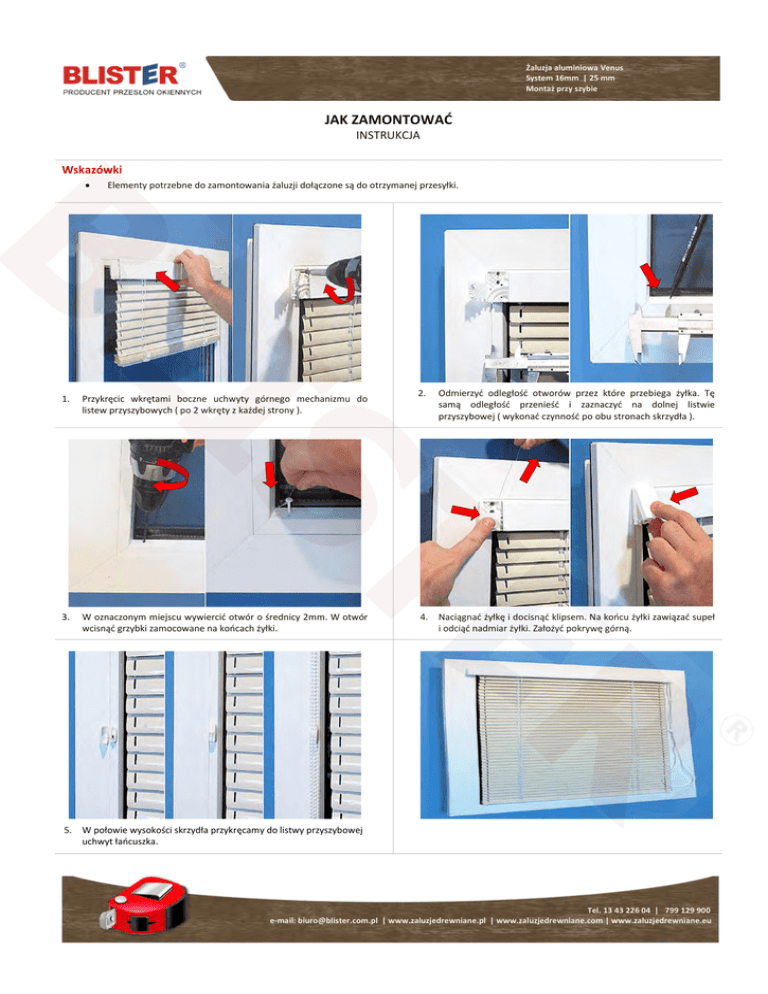 Żaluzja aluminiowa Venus System 16mm | 25 mm Montaż przy szybie JAK ZAMONTOWAĆ INSTRUKCJA Wskazówki • Elementy potrzebne do zamontowania żaluzji dołączone są do otrzymanej przesyłki. 1. Przykręcic wkrętami boczne uchwyty górnego mechanizmu do listew przyszybowych ( po 2 wkręty z każdej strony ). 3. W oznaczonym miejscu wywiercić otwór o średnicy 2mm. W otwór wcisnąć grzybki zamocowane na końcach żyłki. 5. W połowie wysokości skrzydła przykręcamy do listwy przyszybowej uchwyt łańcuszka. 2. Odmierzyć odległość otworów przez które przebiega żyłka. Tę samą odległość przenieść i zaznaczyć na dolnej listwie przyszybowej ( wykonać czynność po obu stronach skrzydła ). 4. Naciągnać żyłkę i docisnąć klipsem. Na końcu żyłki zawiązać supeł i odciąć nadmiar żyłki. Założyć pokrywę górną. Tel. 13 43 226 04 | 799 129 900 e-mail: [email protected] | www.zaluzjedrewniane.pl | www.zaluzjedrewniane.com | www.zaluzjedrewniane.eu