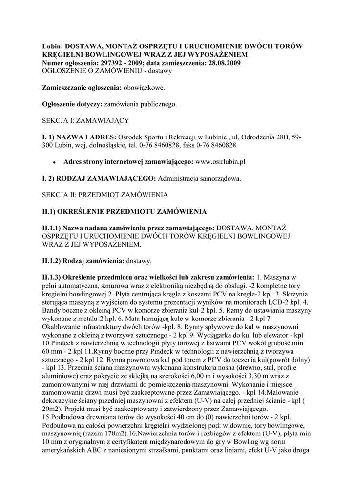 Lubin: DOSTAWA, MONTAŻ OSPRZĘTU I URUCHOMIENIE DWÓCH TORÓW KRĘGIELNI BOWLINGOWEJ WRAZ Z JEJ WYPOSAŻENIEM Numer ogłoszenia: 297392 - 2009; data zamieszczenia: 28.08.2009 OGŁOSZENIE O ZAMÓWIENIU - dostawy Zamieszczanie ogłoszenia: obowiązkowe. Ogłoszenie dotyczy: zamówienia publicznego. SEKCJA I: ZAMAWIAJĄCY I. 1) NAZWA I ADRES: Ośrodek Sportu i Rekreacji w Lubinie , ul. Odrodzenia 28B, 59300 Lubin, woj. dolnośląskie, tel. 0-76 8460828, faks 0-76 8460828. Adres strony internetowej zamawiającego: www.osirlubin.pl I. 2) RODZAJ ZAMAWIAJĄCEGO: Administracja samorządowa. SEKCJA II: PRZEDMIOT ZAMÓWIENIA II.1) OKREŚLENIE PRZEDMIOTU ZAMÓWIENIA II.1.1) Nazwa nadana zamówieniu przez zamawiającego: DOSTAWA, MONTAŻ OSPRZĘTU I URUCHOMIENIE DWÓCH TORÓW KRĘGIELNI BOWLINGOWEJ WRAZ Z JEJ WYPOSAŻENIEM. II.1.2) Rodzaj zamówienia: dostawy. II.1.3) Określenie przedmiotu oraz wielkości lub zakresu zamówienia: 1. Maszyna w pełni automatyczna, sznurowa wraz z elektroniką niezbędną do obsługi. -2 kompletne tory kręgielni bowlingowej 2. Płyta centrująca kręgle z koszami PCV na kręgle-2 kpl. 3. Skrzynia sterująca maszyną z wyjściem do systemu prezentacji wyników na monitorach LCD-2 kpl. 4. Bandy boczne z okleiną PCV w komorze zbierania kul-2 kpl. 5. Ramy do ustawiania maszyny wykonane z metalu-2 kpl. 6. Mata hamującą kule w komorze zbierania - 2 kpl 7. Okablowanie infrastruktury dwóch torów -kpl. 8. Rynny spływowe do kul w maszynowni wykonane z okleiną z tworzywa sztucznego - 2 kpl 9. Wyciągarka do kul lub elewator - kpl 10.Pindeck z nawierzchnią w technologii płyty torowej z listwami PCV wokół grubość min 60 mm - 2 kpl 11.Rynny boczne przy Pindeck w technologii z nawierzchnią z tworzywa sztucznego - 2 kpl 12. Rynna powrotowa kul pod torem z PCV do toczenia kul(powrót dolny) - kpl 13. Przednia ściana maszynowni wykonana konstrukcja nośna (drewno, stal, profile aluminiowe) oraz pokrycie ze sklejką na szerokości 6,00 m i wysokości 3,30 m wraz z zamontowanymi w niej drzwiami do pomieszczenia maszynowni. Wykonanie i miejsce zamontowania drzwi musi być zaakceptowane przez Zamawiającego. - kpl 14.Malowanie dekoracyjne ściany przedniej maszynowni z efektem (U-V) na całej przedniej ścianie - kpl ( 20m2). Projekt musi być zaakceptowany i zatwierdzony przez Zamawiającego. 15.Podbudowa drewniana torów do wysokości 40 cm do (0) nawierzchni torów - 2 kpl. Podbudowa na całości powierzchni kręgielni wydzielonej pod: widownię, tory bowlingowe, maszynownię (razem 178m2) 16.Nawierzchnia torów i rozbiegów z efektem (U-V), płyta min 10 mm z oryginalnym z certyfikatem międzynarodowym do gry w Bowling wg norm amerykańskich ABC z naniesionymi strzałkami, punktami oraz liniami, efekt U-V jako droga lub pas startowy 17.Rynny boczne na torach wykonane z tworzywa sztucznego - 2 kpl 18.Capipng na torach wykonany z tworzywa sztucznego efekt (GLOW) - 2 kpl 19.System spalonego na torach, fotokomórki + lusterka w obudowie - 2 kpl 20.Wyciągarka elektryczna kul na rozbiegu z podajnikiem na min 10 kul - kpl 21.Listwy ALU do obrobienia krawędzi rozbiegu - kpl 22.Monitory min LCD 40 cala do wyświetlania wyników gry - 2 kpl 23.Konsola do ustawiania parametrów gry przy torze jako monitor dotykowy LCD min: 15 cala - 2 kpl. Konsole powinny być ustawione na odpowiedniej wysokości oraz kącie pochylenia, który uniemożliwiałby ustawianie na nich przedmiotów, które mogłyby je uszkodzić lub zalać. Konsole mają być zamontowane osobno dla każdego z torów i obsługiwać indywidualnie każdy z torów. 24.System(program) prezentacji wyników i sterowania na monitorach torowych umożliwiający: - programowanie nazwisk i imion graczy -ustawianie min: 10 języków dla graczy w tym polski -ustawianie dźwięku na monitorach torowych do kolekcji filmów po każdym rzucie -szkoła gry tzn: propozycja rzutu w drugim rzucie jeśli pierwszy nie zbił 10 kręgli -prowadzenie gry wg zasad Bowling wg norm (ABC) możliwość wezwania barmana konsoli torowej LCD na centralny komputer -ustawianie korekcji rzutu przy błędzie gracza lub systemu sterowania z konsoli przy torach - kpl 25.Kręgle do gry z efektem (U-V) - 25 szt. 26.Kule do gry w rozmiarach od 8 do 15 lbs - 20 szt. 27.Buty specjalne do gry w Bowling - rozmiary według zamawiającego- 25 par. 28.Centralny system wraz z programem do uruchamiania torów z możliwością sprzedaży czasu gry lub gier na torach, drukowanie wyników gier, kodowanie pracowników obsługi, pełne rozliczenie kasy oraz raporty torowe, dzienne i miesięczne, sprzedaż butów złożony z PC + monitor LCD min 17 cala +drukarka, kasa fiskalna (VAT), myszka, klawiatura, UPS kpl 29.Dostawa kręgielni do Lubina + rozładunek - kpl 30.Przeszkolenie pracowników obsługi kręgielni z zasad obsługi kręgielni - kpl 31.Olej specjalistyczny do smarowania torów kręgielni Bowling 5 Gal - 1 kpl 32.Płyn specjalistyczny do mycia torów kręgielni 5 Gal - 1 kpl 33.Maszyna automatyczna do mycia i oliwienia torów o poniższych parametrach: automatyczne programowanie cyklów mycia i oliwienia -czas mycia i oliwienia Toru nie dłuższy niż 2 minuty -maszyna samojezdna na torze -możliwość ustawiania parametrów oliwienia z pozycji PC wg zadanych parametrów, -pamięć maszyny min. 4 programy automatyczne -maszyna posiadająca min: 6 padów do oliwienia torów - kpl 34.Podest drewniany wypełniający całą szerokość i długość powierzchni pomiędzy ścianami a torami kręgielni oraz na długości torów i rozbiegu do ściany przedniej maszynowni na wysokości 40 cm. Całość powierzchni obłożona wykładziną z efektem U-V - kpl 35.Podest drewniany o wysokości 40 cm pod siedliska ze stolikami dla graczy i widzów na szerokości i długości powierzchni dołączonej do rozbiegów torów. Całość powierzchni obłożona wykładziną z efektem (U-V) - kpl 36.Schody wejściowe umożliwiające wejście na na podest drewniany obłożone wykładzi