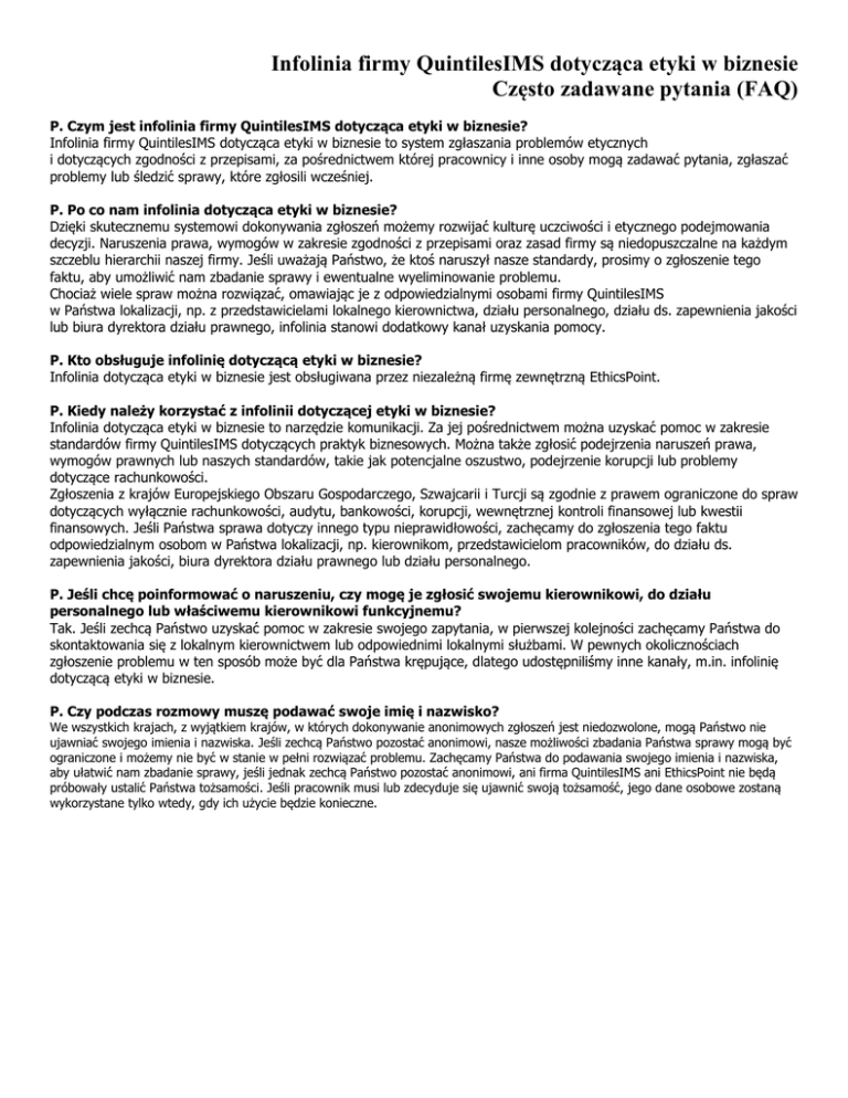 Infolinia firmy QuintilesIMS dotycząca etyki w biznesie Często zadawane pytania (FAQ) P. Czym jest infolinia firmy QuintilesIMS dotycząca etyki w biznesie? Infolinia firmy QuintilesIMS dotycząca etyki w biznesie to system zgłaszania problemów etycznych i dotyczących zgodności z przepisami, za pośrednictwem której pracownicy i inne osoby mogą zadawać pytania, zgłaszać problemy lub śledzić sprawy, które zgłosili wcześniej. P. Po co nam infolinia dotycząca etyki w biznesie? Dzięki skutecznemu systemowi dokonywania zgłoszeń możemy rozwijać kulturę uczciwości i etycznego podejmowania decyzji. Naruszenia prawa, wymogów w zakresie zgodności z przepisami oraz zasad firmy są niedopuszczalne na każdym szczeblu hierarchii naszej firmy. Jeśli uważają Państwo, że ktoś naruszył nasze standardy, prosimy o zgłoszenie tego faktu, aby umożliwić nam zbadanie sprawy i ewentualne wyeliminowanie problemu. Chociaż wiele spraw można rozwiązać, omawiając je z odpowiedzialnymi osobami firmy QuintilesIMS w Państwa lokalizacji, np. z przedstawicielami lokalnego kierownictwa, działu personalnego, działu ds. zapewnienia jakości lub biura dyrektora działu prawnego, infolinia stanowi dodatkowy kanał uzyskania pomocy. P. Kto obsługuje infolinię dotyczącą etyki w biznesie? Infolinia dotycząca etyki w biznesie jest obsługiwana przez niezależną firmę zewnętrzną EthicsPoint. P. Kiedy należy korzystać z infolinii dotyczącej etyki w biznesie? Infolinia dotycząca etyki w biznesie to narzędzie komunikacji. Za jej pośrednictwem można uzyskać pomoc w zakresie standardów firmy QuintilesIMS dotyczących praktyk biznesowych. Można także zgłosić podejrzenia naruszeń prawa, wymogów prawnych lub naszych standardów, takie jak potencjalne oszustwo, podejrzenie korupcji lub problemy dotyczące rachunkowości. Zgłoszenia z krajów Europejskiego Obszaru Gospodarczego, Szwajcarii i Turcji są zgodnie z prawem ograniczone do spraw dotyczących wyłącznie rachunkowości, audytu, bankowości, korupcji, wewnętrznej kontroli finansowej lub kwestii finansowych. Jeśli Państwa sprawa dotyczy innego typu nieprawidłowości, zachęcamy do zgłoszenia tego faktu odpowiedzialnym osobom w Państwa lokalizacji, np. kierownikom, przedstawicielom pracowników, do działu ds. zapewnienia jakości, biura dyrektora działu prawnego lub działu personalnego. P. Jeśli chcę poinformować o naruszeniu, czy mogę je zgłosić swojemu kierownikowi, do działu personalnego lub właściwemu kierownikowi funkcyjnemu? Tak. Jeśli zechcą Państwo uzyskać pomoc w zakresie swojego zapytania, w pierwszej kolejności zachęcamy Państwa do skontaktowania się z lokalnym kierownictwem lub odpowiednimi lokalnymi służbami. W pewnych okolicznościach zgłoszenie problemu w ten sposób może być dla Państwa krępujące, dlatego udostępniliśmy inne kanały, m.in. infolinię dotyczącą etyki w biznesie. P. Czy podczas rozmowy muszę podawać swoje imię i nazwisko? We wszystkich krajach, z wyjątkiem krajów, w których dokonywanie anonimowych zgłoszeń jest niedozwolone, mogą Państwo nie ujawniać swojego imienia i nazwiska. Jeśli zechcą Państwo pozostać anonimowi, nasze możliwości zbadania Państwa sprawy mogą być ograniczone i możemy nie być w stanie w pełni rozwiązać problemu. Zachęcamy Państwa do podawania swojego imienia i nazwiska, aby ułatwić nam zbadanie sprawy, jeśli jednak zechcą Państwo pozostać anonimowi, ani firma QuintilesIMS ani EthicsPoint nie będą próbowały ustalić Państwa tożsamości. Jeśli pracownik musi lub zdecyduje się ujawnić swoją tożsamość, jego dane osobowe zostaną wykorzystane tylko wtedy, gdy ich użycie będzie konieczne. Jak można korzystać z infolinii dotyczącej etyki w biznesie? Zgłoszeń na infolinię dotyczącą etyki w biznesie można dokonywać na dwa sposoby. 1) Telefonicznie: Bezpłatna linia telefoniczna jest obsługiwana 24 godziny na dobę, 7 dni w tygodniu, każdego dnia w roku. Po nawiązaniu połączenia przeszkolony specjalista firmy EthicsPoint ds. zgłoszeń zada Państwu kilka pytań w celu ustalenia relewantnych szczegółów dotyczących Państwa zapytania lub problemu. Jeśli ujawnią Państwo swoje imię i nazwisko oraz dane kontaktowe, specjalista ds. zgłoszeń zanotuje także i te informacje. Firma QuintilesIMS podejmie wszelkie niezbędne działania w celu zachowania poufności Państwa tożsamości w zakresie możliwym lub dozwolonym przez przepisy. Na zakończenie rozmowy specjalista ds. zgłoszeń podsumuje podane przez Państwa informacje oraz dokona wszelkich zmian, które uznają Państwo za konieczne. Bezpłatne linie telefoniczne są dostępne w każdym kraju, w którym posiadamy pracowników. Do Państwa dyspozycji są wielojęzyczni telefoniści, tak więc mogą Państwo dokonywać zgłoszeń lub zadawać pytania w swoim preferowanym języku. 2) Przez portal internetowy: Internetowy portal zgłoszeniowy jest dostępny 24 godziny na dobę, 7 dni w tygodniu, w każdym miejscu z dostępem do Internetu. Na portalu zostaną Państwo przeprowadzeni przez proces, w ramach którego należy odpowiedzieć na serię pytań. Zostaną Państwo poproszeni o podanie informacji na temat swojego zapytania lub problemu. O ile jest to zgodne z przepisami, mogą Państwo zachować anonimowość. Jeśli nie będą Państwo chcieli ujawnić swojej tożsamości, nie będziemy podejmować prób jej ustalenia. P. Czy mogę mieć kłopoty w związku ze zgłoszeniem problemu lub zapytania na infolinię? Nie. Infolinia została stworzona w celu dokonywania zgłoszeń i zapewnienia Państwu ochrony. Firma QuintilesIMS surowo zabrania dokonywania odwetu na jakiejkolwiek osobie, która w dobrej wierze zgłasza problem lub zadaje pytania dotyczące naszych standardów postępowania w biznesie za pośrednictwem infolinii dotyczącej etyki w biznesie. P. Co się stanie po dokonaniu zgłoszenia? Firma EthicsPoint s
