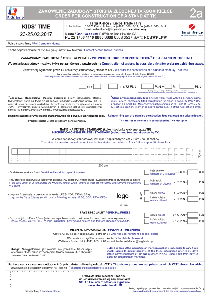 2a ZAMÓWIENIE ZABUDOWY STOISKA ZLECONEJ TARGOM KIELCE ORDER FOR CONSTRUCTION OF A STAND AT TK Targi Kielce / Kielce Trade Fairs KIDS’ TIME ul. Zak³adowa 1, 25-672 Kielce, Poland, tel.(+4841) 365-12-21, fax (+4841) 365-13-12 e-mail: [email protected], www.kidstime.pl 23-25.02.2017 Konto / Bank account: Raiffeisen Bank Polska SA PL 22 1750 1110 0000 0000 0568 3537 Swift: RCBWPLPW Pe³na nazwa firmy / Full Company Name: Osoba odpowiedzialna za stoisko (imiê i nazwisko, telefon) / Contact person (name, phone): ZAMAWIAMY ZABUDOWÊ* STOISKA W HALI / WE WISH TO ORDER CONSTRUCTION* OF A STAND IN THE HALL Wykonanie zabudowy mo¿liwe tylko po zamówieniu powierzchni / Construction of a stand is possible only after ordering exhibition space. Zamawiamy wykonanie przez TK zabudowy standardowej stoiska w hali / We order the construction of a standard stand by TK in hall (W przypadku zabudowy stoiska na terenie zewnêtrznym - patrz str. 3, poz.44, i str. 5, poz. 22 i 23 With regards to the construction of a stand in the external area - please see page 3, item 44 and page 5, items 22 and 23). mx 2 m= PLN + m x 72 PLN = %= PLN (% dop³aty wg rodzaju lokalizacji stoiska - patrz str.1 Percentage of surcharge depending on the design type of stand - see page 1) * * Zabudowa standardowa stoiska obejmuje: œciany zewnêtrzne stoiska, fryz czo³owy, napis na fryzie do 20 znaków, gniazdko elektryczne (2 kW) 230 V, wieszak, kosz na œmieci, wyk³adzinê. Ponadto na ka¿de rozpoczête 4 m2 - 1 lampa 75W. (Powy¿szych pozycji wynikaj¹cych z zamówieñ zabudowy standardowej stoiska nie nale¿y zakreœlaæ w cenniku wyposa¿enia dodatkowego). Stand arrangement includes: external walls, frieze with the company name on it - up to 20 characters, fitted carpet within the stand, a socket (2 kW) 230 V, a hanger, a rubbish bin. Moreover for each starting 4 sq.m. - one (1) lamp 75 W. (Do not tick positions mentioned above on the page 3 of the Application Form). Relinquishing part of a standard construction does not result in a price reduction. Rezygnacja z czêœci wyposa¿enia standardowego nie powoduje zmniejszenia ceny. The project of the stand is established by TK’s designer. Projekt stoiska ustala projektant Targów Kielce. NAPIS NA FRYZIE - STANDARD (kolor i czcionka wybrane przez TK) INSCRIPTION ON THE FRIEZE - STANDARD (colour and font are choosen by TK) 30 cm W cenie zabudowy standardowej jest m.in.: napis na fryzie 2m x 0,3m - do 20 znaków The price of a standard construction includes inscription on the frieze 2m x 0,3 m - up to 20 characters 200 cm iloœæ znaków (amount of characters) x 4 PLN = PLN - Przy stoiskach naro¿nych lub czo³owych proponujemy dodatkowy fryz na drug¹ i ewentualnie trzeci¹ otwart¹ stronê stoiska In the case of corner or front stands we would like to offer you an additional frieze on the second alternatively third open side of a stand iloœæ sztuk (amount of pieces) x 90 PLN = PLN sztuka / piece x 90 PLN = PLN ka¿de kolejne each additional x 60 PLN = PLN sztuka / piece x 140 PLN = PLN ka¿de kolejne each additional x 120 PLN = PLN - Logo na fryzie (nale¿y przes³aæ w formacie: JPEG, CDR, TIF lub EPS) Logo on the frieze (please send in one of following formats: JPEG, CDR, TIF or EPS) 30 cm - Dodatkowy znak na fryzie / Additional inscription (per character) logo 90 cm FRYZ SPECJALNY / SPECIAL FRIEZE - Fryz specjalny - 2m x 0,3m - (w formie logo, kolor napisu, t³a i czcionka do wyboru przez wystawcê) Special frieze - 2m x 0,3m - (as logo, inscription, background colours and font are choosen by exhibitor) GRAFIKA INDYWIDUALNA / INDIVIDUAL GRAPHICS Grafika wed³ug zleceñ specjalnych - patrz str. 6 / Graphics according to the special orders W sprawie szczegó³ów prosimy o kontakt / For details please call: Waldemar Baster, tel. (+4841) 365 12 28, e-mail: [email protected] Uwaga: Niewype³nienie, jak równie¿ nie przes³anie treœci napisu w terminie 30 dni przed rozpoczêciem targów zwalnia TK z obowi¹zku umieszczania napisu na fryzie. Note: The lack of the inscription on the frieze makes it impossible to cary it into effect. Failure to deliver contents of the frieze inscriptions prior to 30 days before commencement of the fair releases Kielce Trade Fairs from duty to place the inscription on the frieze. Podane ceny s¹ cenami netto, do których nale¿y doliczyæ podatek VAT* / The above prices are net prices to which VAT* should be added * z wy³¹czeniem przypadków opisanych na 1 stronie / * excluding the cases described on page 1 UWAGA: Brak pieczêci i podpisu uniemo¿liwia realizacjê zamówienia!!! NOTE: The lack of stamp or signature makes the order invalid !!! Pieczêæ firmy / Company stamp Data, czytelny podpis osoby upowa¿nionej do reprezentowania firmy Date, authorised to represent the company person’s signature