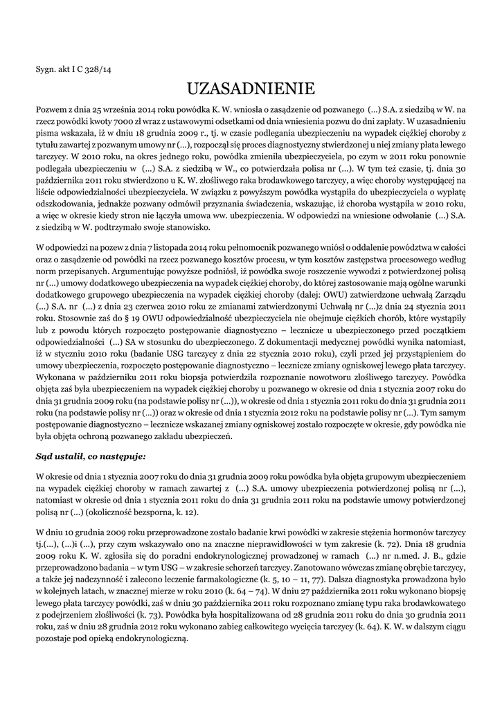 Sygn. akt I C 328/14 UZASADNIENIE Pozwem z dnia 25 września 2014 roku powódka K. W. wniosła o zasądzenie od pozwanego (...) S.A. z siedzibą w W. na rzecz powódki kwoty 7000 zł wraz z ustawowymi odsetkami od dnia wniesienia pozwu do dni zapłaty. W uzasadnieniu pisma wskazała, iż w dniu 18 grudnia 2009 r., tj. w czasie podlegania ubezpieczeniu na wypadek ciężkiej choroby z tytułu zawartej z pozwanym umowy nr (...), rozpoczął się proces diagnostyczny stwierdzonej u niej zmiany płata lewego tarczycy. W 2010 roku, na okres jednego roku, powódka zmieniła ubezpieczyciela, po czym w 2011 roku ponownie podlegała ubezpieczeniu w (...) S.A. z siedzibą w W., co potwierdzała polisa nr (...). W tym też czasie, tj. dnia 30 października 2011 roku stwierdzono u K. W. złośliwego raka brodawkowego tarczycy, a więc choroby występującej na liście odpowiedzialności ubezpieczyciela. W związku z powyższym powódka wystąpiła do ubezpieczyciela o wypłatę odszkodowania, jednakże pozwany odmówił przyznania świadczenia, wskazując, iż choroba wystąpiła w 2010 roku, a więc w okresie kiedy stron nie łączyła umowa ww. ubezpieczenia. W odpowiedzi na wniesione odwołanie (...) S.A. z siedzibą w W. podtrzymało swoje stanowisko. W odpowiedzi na pozew z dnia 7 listopada 2014 roku pełnomocnik pozwanego wniósł o oddalenie powództwa w całości oraz o zasądzenie od powódki na rzecz pozwanego kosztów procesu, w tym kosztów zastępstwa procesowego według norm przepisanych. Argumentując powyższe podniósł, iż powódka swoje roszczenie wywodzi z potwierdzonej polisą nr (...) umowy dodatkowego ubezpieczenia na wypadek ciężkiej choroby, do której zastosowanie mają ogólne warunki dodatkowego grupowego ubezpieczenia na wypadek ciężkiej choroby (dalej: OWU) zatwierdzone uchwałą Zarządu (...) S.A. nr (...) z dnia 23 czerwca 2010 roku ze zmianami zatwierdzonymi Uchwałą nr (...)z dnia 24 stycznia 2011 roku. Stosownie zaś do § 19 OWU odpowiedzialność ubezpieczyciela nie obejmuje ciężkich chorób, które wystąpiły lub z powodu których rozpoczęto postępowanie diagnostyczno – lecznicze u ubezpieczonego przed początkiem odpowiedzialności (...) SA w stosunku do ubezpieczonego. Z dokumentacji medycznej powódki wynika natomiast, iż w styczniu 2010 roku (badanie USG tarczycy z dnia 22 stycznia 2010 roku), czyli przed jej przystąpieniem do umowy ubezpieczenia, rozpoczęto postępowanie diagnostyczno – lecznicze zmiany ogniskowej lewego płata tarczycy. Wykonana w październiku 2011 roku biopsja potwierdziła rozpoznanie nowotworu złośliwego tarczycy. Powódka objęta zaś była ubezpieczeniem na wypadek ciężkiej choroby u pozwanego w okresie od dnia 1 stycznia 2007 roku do dnia 31 grudnia 2009 roku (na podstawie polisy nr (...)), w okresie od dnia 1 stycznia 2011 roku do dnia 31 grudnia 2011 roku (na podstawie polisy nr (...)) oraz w okresie od dnia 1 stycznia 2012 roku na podstawie polisy nr (...). Tym samym postępowanie diagnostyczno – lecznicze wskazanej zmiany ogniskowej zostało rozpoczęte w okresie, gdy powódka nie była objęta ochroną pozwanego zakładu ubezpieczeń. Sąd ustalił, co następuje: W okresie od dnia 1 stycznia 2007 roku do dnia 31 grudnia 2009 roku powódka była objęta grupowym ubezpieczeniem na wypadek ciężkiej choroby w ramach zawartej z (...) S.A. umowy ubezpieczenia potwierdzonej polisą nr (...), natomiast w okresie od dnia 1 stycznia 2011 roku do dnia 31 grudnia 2011 roku na podstawie umowy potwierdzonej polisą nr (...) (okoliczność bezsporna, k. 12). W dniu 10 grudnia 2009 roku przeprowadzone zostało badanie krwi powódki w zakresie stężenia hormonów tarczycy tj.(...), (...)i (...), przy czym wskazywało ono na znaczne nieprawidłowości w tym zakresie (k. 72). Dnia 18 grudnia 2009 roku K. W. zgłosiła się do poradni endokrynologicznej prowadzonej w ramach (...) nr n.med. J. B., gdzie przeprowadzono badania – w tym USG – w zakresie schorzeń tarczycy. Zanotowano wówczas zmianę obrębie tarczycy, a także jej nadczynność i zalecono leczenie farmakologiczne (k. 5, 10 – 11, 77). Dalsza diagnostyka prowadzona było w kolejnych latach, w znacznej mierze w roku 2010 (k. 64 – 74). W dniu 27 października 2011 roku wykonano biopsję lewego płata tarczycy powódki, zaś w dniu 30 października 2011 roku rozpoznano zmianę typu raka brodawkowatego z podejrzeniem złośliwości (k. 73). Powódka była hospitalizowana od 28 grudnia 2011 roku do dnia 30 grudnia 2011 roku, zaś w dniu 28 grudnia 2012 roku wykonano zabieg całkowitego wycięcia tarczycy (k. 64). K. W. w dalszym ciągu pozostaje pod opieką endokrynologiczną. Powódka zgłosiła ubezpieczycielowi zaistnienie okoliczności uzasadniającej przyznanie świadczenia w wysokości 7000 zł w dniu 27 kwietnia 2012 roku (k. 62 – 63). Pismem z dnia 9 maja 2012 roku pozwany ubezpieczyciel odmówił przyznania żądanego świadczenia, wskazując, iż z dostarczonej dokumentacji wynika, iż postępowanie diagnostyczno-lecznicze zmiany ogniskowej lewego płata tarczycy rozpoczęło się w styczniu 2010 roku, a więc przed przystąpieniem do ubezpieczenia (k. 75). W dniu 6 czerwca 2012 roku powódka wniosła o ponowne rozpatrzenie zgłoszenia i przyznanie odszkodowania, wskazując jednocześnie, iż proces leczenia płata lewego tarczycy rozpoczął się już w roku 2009, a więc w okresie obowiązywania ubezpieczenia w pozwanym zakładzie na podstawie umowy nr (...) (k. 76). W odpowiedzi na powyższe odwołanie pozwany podtrzymał swoją uprzednią decyzję, powołując się na zapis § 19 OWU (k. 78). Sąd zważył, co następuje: Stosownie do treści art. 805 § 1 i 2 pkt 2 k.c. przez umowę ubezpieczenia osobowego ubezpieczyciel zobowiązuje się, w zakresie działalności swojego przedsiębiorstwa, spełnić świadczenie, polegające na zapłacie umówionej sumy pieniężnej, renty lub innego świadczenia w razie zajścia przewidzianego w umowie