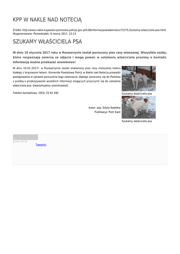 KPP W NAKLE NAD NOTECIĄ Źródło: http://www.naklo.kujawsko-pomorska.policja.gov.pl/k38/informacje/wiadomosci/72275,Szukamy-wlasciciela-psa.html Wygenerowano: Poniedziałek, 6 marca 2017, 22:13 SZUKAMY WŁAŚCICIELA PSA W dniu 10 stycznia 2017 roku w Rozwarzynie został porzucony pies rasy mieszanej. Wszystkie osoby, które rozpoznają zwierzę ze zdjęcia i mogą pomóc w ustaleniu właściciela prosimy o kontakt. Informację można przekazać anonimowo! W dniu 10.01.2017r. w Rozwarzynie został znaleziony pies rasy mieszanej koloru białego z brązowymi łatami. Komenda Powiatowa Policji w Nakle nad Notecią prowadzi postępowanie w sprawie porzucenia tego zwierzęcia, dlatego zwracamy się do Państwa z prośbą o przekazywanie wszelkich informacji mogących przyczynić się do ustalenia właściciela psa. Gwarantujemy anonimowość. Telefon kontaktowy: (052) 33 93 290 Szukamy właściciela psa Autor: asp. Edyta Nadolna Publikacja: Piotr Kant Szukamy właściciela psa Ocena: 0/5 (0) Tweetnij