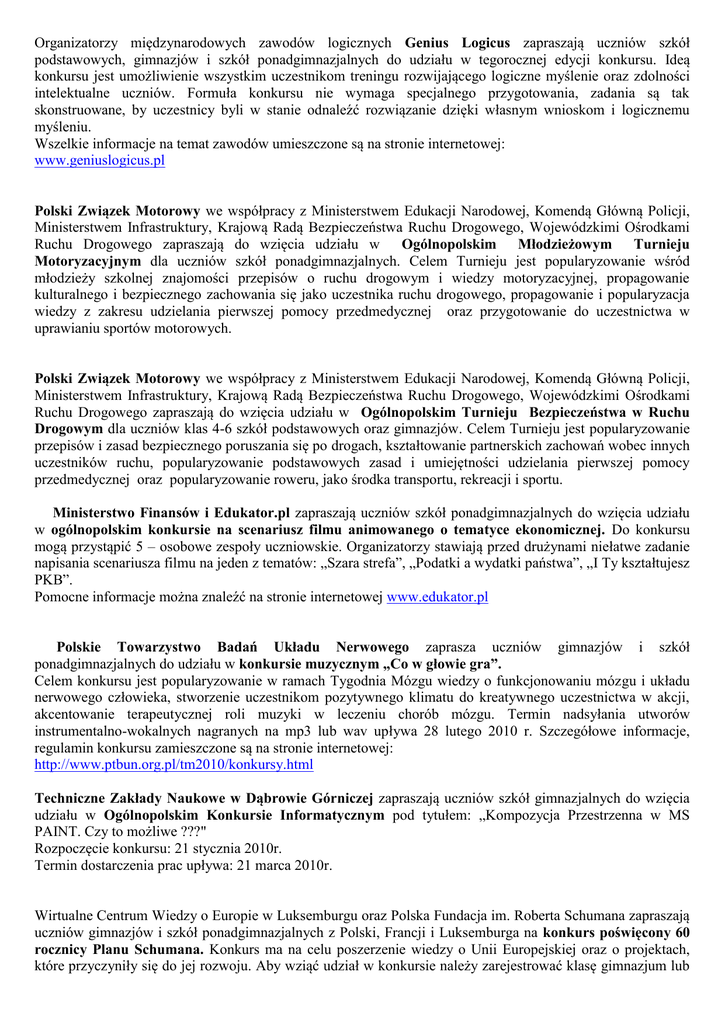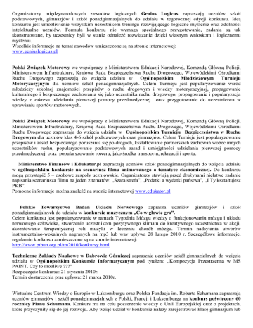 Organizatorzy międzynarodowych zawodów logicznych Genius Logicus zapraszają uczniów szkół podstawowych, gimnazjów i szkół ponadgimnazjalnych do udziału w tegorocznej edycji konkursu. Ideą konkursu jest umożliwienie wszystkim uczestnikom treningu rozwijającego logiczne myślenie oraz zdolności intelektualne uczniów. Formuła konkursu nie wymaga specjalnego przygotowania, zadania są tak skonstruowane, by uczestnicy byli w stanie odnaleźć rozwiązanie dzięki własnym wnioskom i logicznemu myśleniu. Wszelkie informacje na temat zawodów umieszczone są na stronie internetowej: www.geniuslogicus.pl Polski Związek Motorowy we współpracy z Ministerstwem Edukacji Narodowej, Komendą Główną Policji, Ministerstwem Infrastruktury, Krajową Radą Bezpieczeństwa Ruchu Drogowego, Wojewódzkimi Ośrodkami Ruchu Drogowego zapraszają do wzięcia udziału w Ogólnopolskim Młodzieżowym Turnieju Motoryzacyjnym dla uczniów szkół ponadgimnazjalnych. Celem Turnieju jest popularyzowanie wśród młodzieży szkolnej znajomości przepisów o ruchu drogowym i wiedzy motoryzacyjnej, propagowanie kulturalnego i bezpiecznego zachowania się jako uczestnika ruchu drogowego, propagowanie i popularyzacja wiedzy z zakresu udzielania pierwszej pomocy przedmedycznej oraz przygotowanie do uczestnictwa w uprawianiu sportów motorowych. Polski Związek Motorowy we współpracy z Ministerstwem Edukacji Narodowej, Komendą Główną Policji, Ministerstwem Infrastruktury, Krajową Radą Bezpieczeństwa Ruchu Drogowego, Wojewódzkimi Ośrodkami Ruchu Drogowego zapraszają do wzięcia udziału w Ogólnopolskim Turnieju Bezpieczeństwa w Ruchu Drogowym dla uczniów klas 4-6 szkół podstawowych oraz gimnazjów. Celem Turnieju jest popularyzowanie przepisów i zasad bezpiecznego poruszania się po drogach, kształtowanie partnerskich zachowań wobec innych uczestników ruchu, popularyzowanie podstawowych zasad i umiejętności udzielania pierwszej pomocy przedmedycznej oraz popularyzowanie roweru, jako środka transportu, rekreacji i sportu. Ministerstwo Finansów i Edukator.pl zapraszają uczniów szkół ponadgimnazjalnych do wzięcia udziału w ogólnopolskim konkursie na scenariusz filmu animowanego o tematyce ekonomicznej. Do konkursu mogą przystąpić 5 – osobowe zespoły uczniowskie. Organizatorzy stawiają przed drużynami niełatwe zadanie napisania scenariusza filmu na jeden z tematów: „Szara strefa”, „Podatki a wydatki państwa”, „I Ty kształtujesz PKB”. Pomocne informacje można znaleźć na stronie internetowej www.edukator.pl Polskie Towarzystwo Badań Układu Nerwowego zaprasza uczniów gimnazjów i szkół ponadgimnazjalnych do udziału w konkursie muzycznym „Co w głowie gra”. Celem konkursu jest popularyzowanie w ramach Tygodnia Mózgu wiedzy o funkcjonowaniu mózgu i układu nerwowego człowieka, stworzenie uczestnikom pozytywnego klimatu do kreatywnego uczestnictwa w akcji, akcentowanie terapeutycznej roli muzyki w leczeniu chorób mózgu. Termin nadsyłania utworów instrumentalno-wokalnych nagranych na mp3 lub wav upływa 28 lutego 2010 r. Szczegółowe informacje, regulamin konkursu zamieszczone są na stronie internetowej: http://www.ptbun.org.pl/tm2010/konkursy.html Techniczne Zakłady Naukowe w Dąbrowie Górniczej zapraszają uczniów szkół gimnazjalnych do wzięcia udziału w Ogólnopolskim Konkursie Informatycznym pod tytułem: „Kompozycja Przestrzenna w MS PAINT. Czy to możliwe ???" Rozpoczęcie konkursu: 21 stycznia 2010r. Termin dostarczenia prac upływa: 21 marca 2010r. Wirtualne Centrum Wiedzy o Europie w Luksemburgu oraz Polska Fundacja im. Roberta Schumana zapraszają uczniów gimnazjów i szkół ponadgimnazjalnych z Polski, Francji i Luksemburga na konkurs poświęcony 60 rocznicy Planu Schumana. Konkurs ma na celu poszerzenie wiedzy o Unii Europejskiej oraz o projektach, które przyczyniły się do jej rozwoju. Aby wziąć udział w konkursie należy zarejestrować klasę gimnazjum lub szkoły ponadgimnazjalnej na stronie internetowej www.cvce.lu/schuman_2010, gdzie w czasie trwania konkursu – od 8 lutego do 23 kwietnia 2010 r.- pojawią się testy sprawdzające znajomość zagadnień związanych z Planem Schumana. Dodatkowe informacje związane z konkursem umieszczone są na stronie internetowej: www.schuman.org.pl Organizatorzy XX edycji Ogólnopolskiego Konkursu Ekologicznego zapraszają uczniów gimnazjów i szkół ponadgimnazjalnych do udziału w tegorocznym przedsięwzięciu pt. „Różnorodność biologiczna – przyszłość Ziemi w świadomości ludzi”. Celem konkursu jest aktywizowanie młodzieży do poznawania aktualnej problematyki ekologicznej, kształtowanie postawy człowieka świadomego swego wpływu na środowisko, integrację młodych Polaków z różnych regionów kraju. Zadanie konkursowe polega na samodzielnym napisaniu pracy na jeden z zaproponowanych przez Komitet Konkursowy tematów i nadesłanie ich w terminie do 11 czerwca 2010 r. Regulamin konkursu, karta zgłoszenia oraz szczegółowe informacje umieszczone są na stronie internetowej www.mdk.bialystok.pl Ośrodek Działań Ekologicznych „Źródła” zaprasza uczniów szkół podstawowych, gimnazjów i szkół ponadgimnazjalnych do udziału w konkursie na reportaż z elementami fotoreportażu, na temat śródmiejskich ekosystemów wodnych i wodo-zależnych (małe rzeki, jeziora, starorzecza, stawy, mokradła, w tym łęgi i olsy). Ideą konkursu jest podnoszenie świadomości społecznej na temat ekosystemów wodnych, ich znaczenia, zagrożeń, możliwości ochrony. Regulamin konkursu „Drugie dno H2O...czyli woda w moim mieście”, karta zgłoszenia i szczegółowe informacje znajdują się na stronie internetowej http://h2o.zrodla.org Młodzieżowy Dom Kultury w Białymstoku ogłasza konkurs na animację artystyczną, grafikę komputerową oraz film dokumentalny pod nazwą ANIM@KCJA adresowany do uczniów szkół każdego typu. Celem konkursu jes