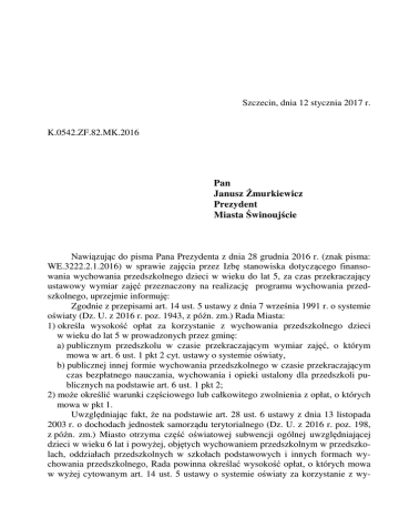 Szczecin, dnia 12 stycznia 2017 r. K.0542.ZF.82.MK.2016 Pan Janusz Żmurkiewicz Prezydent Miasta Świnoujście Nawiązując do pisma Pana Prezydenta z dnia 28 grudnia 2016 r. (znak pisma: WE.3222.2.1.2016) w sprawie zajęcia przez Izbę stanowiska dotyczącego finansowania wychowania przedszkolnego dzieci w wieku do lat 5, za czas przekraczający ustawowy wymiar zajęć przeznaczony na realizację programu wychowania przedszkolnego, uprzejmie informuję: Zgodnie z przepisami art. 14 ust. 5 ustawy z dnia 7 września 1991 r. o systemie oświaty (Dz. U. z 2016 r. poz. 1943, z późn. zm.) Rada Miasta: 1) określa wysokość opłat za korzystanie z wychowania przedszkolnego dzieci w wieku do lat 5 w prowadzonych przez gminę: a) publicznym przedszkolu w czasie przekraczającym wymiar zajęć, o którym mowa w art. 6 ust. 1 pkt 2 cyt. ustawy o systemie oświaty, b) publicznej innej formie wychowania przedszkolnego w czasie przekraczającym czas bezpłatnego nauczania, wychowania i opieki ustalony dla przedszkoli publicznych na podstawie art. 6 ust. 1 pkt 2; 2) może określić warunki częściowego lub całkowitego zwolnienia z opłat, o których mowa w pkt 1. Uwzględniając fakt, że na podstawie art. 28 ust. 6 ustawy z dnia 13 listopada 2003 r. o dochodach jednostek samorządu terytorialnego (Dz. U. z 2016 r. poz. 198, z późn. zm.) Miasto otrzyma część oświatowej subwencji ogólnej uwzględniającej dzieci w wieku 6 lat i powyżej, objętych wychowaniem przedszkolnym w przedszkolach, oddziałach przedszkolnych w szkołach podstawowych i innych formach wychowania przedszkolnego, Rada powinna określać wysokość opłat, o których mowa w wyżej cytowanym art. 14 ust. 5 ustawy o systemie oświaty za korzystanie z wy- 2 chowania przedszkolnego dzieci, o których mowa w art. 14 ust. 3 i ust. 3a ustawy, tj. które nie są objęte obowiązkowym rocznym przygotowaniem przedszkolnym. Przyjmując fakt, iż Miasto otrzyma część oświatowej subwencji ogólnej uwzględniającej dzieci w wieku 6 lat i powyżej objętych wychowaniem przedszkolnym, przy określaniu wysokości przedmiotowych opłat należy uwzględnić wymogi przepisów art. 14 ust. 3 i ust. 3a ustawy o systemie oświaty określających wiek dzieci obowiązanych odbyć roczne przygotowanie przedszkolne. Jednocześnie wyjaśniam, że powyższa informacja nie jest wiążącą wykładnią prawa, lecz prezentuje pogląd na zagadnienia sygnalizowane w Pana piśmie.
