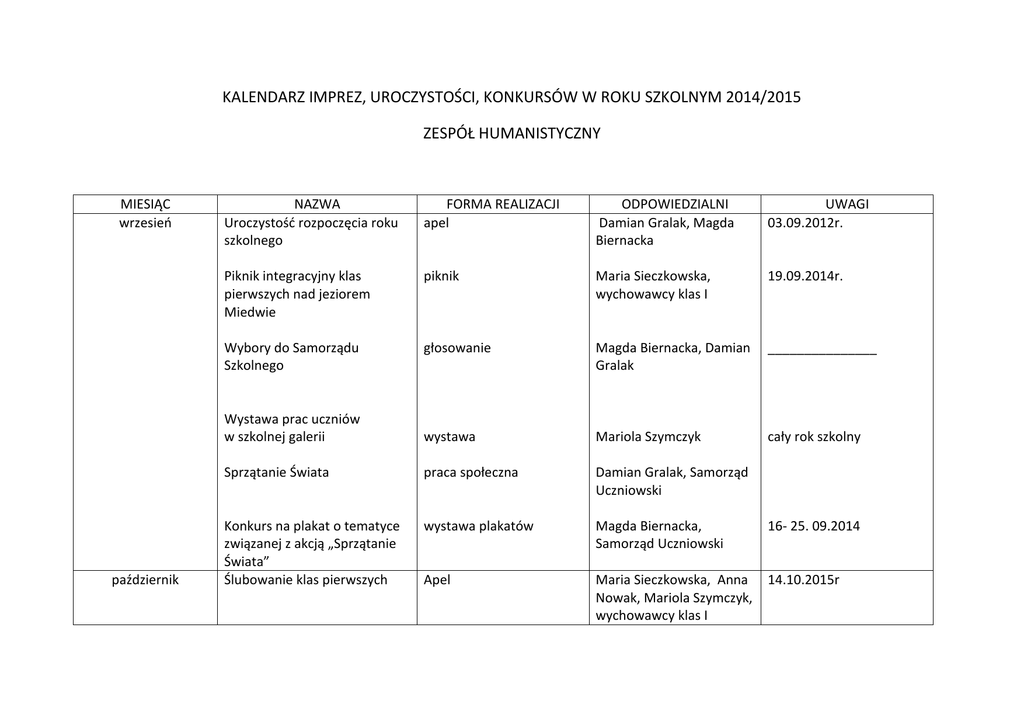 kalendarz imprez, uroczystości, konkursów w roku szkolnym 2014