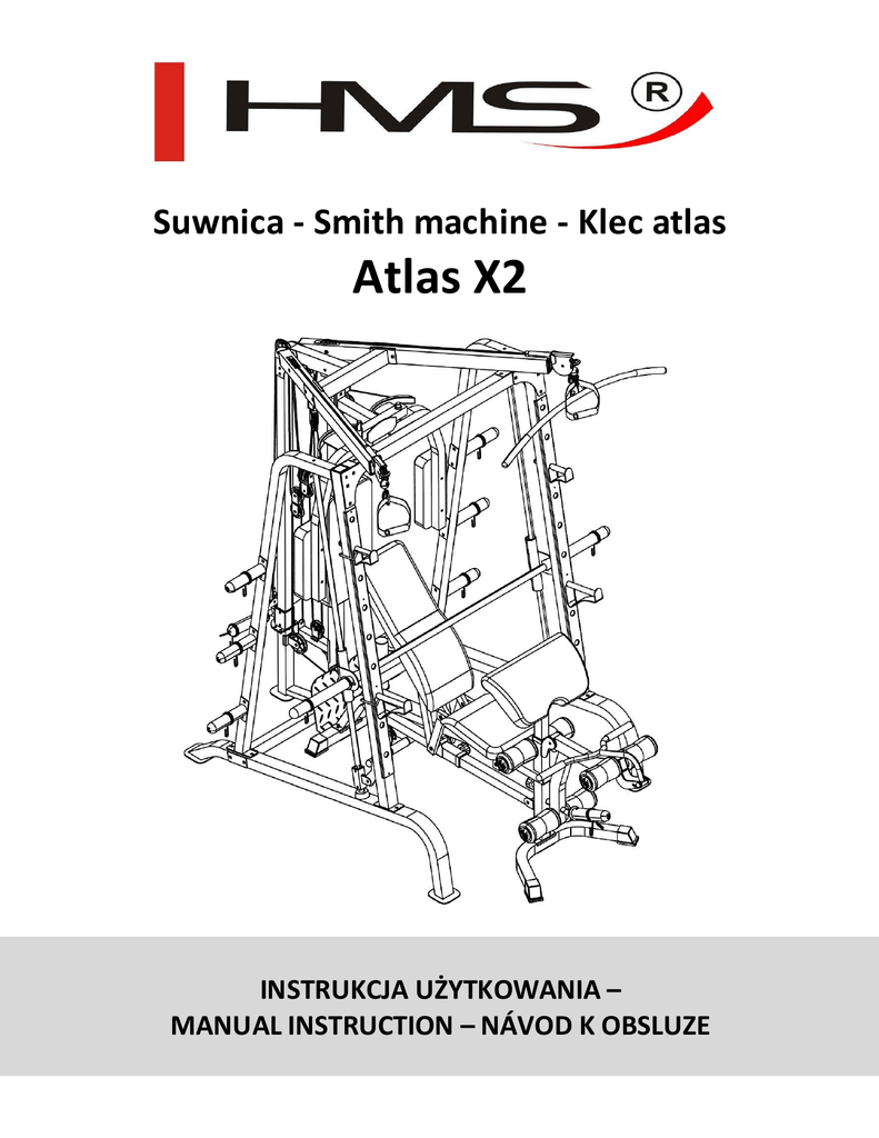 Suwnica - Smith machine - Klec atlas Atlas X2 INSTRUKCJA UŻYTKOWANIA – MANUAL INSTRUCTION – NÁVOD K OBSLUZE Atlas X2 UWAGI DOTYCZĄCE BEZPIECZEŃSTWA Produkt ten przeznaczony jest wyłącznie do użytku domowego i zaprojektowano go tak, aby zapewnić optymalne bezpieczeństwo. Powinny być przestrzegane następujące zasady: 1. 2. 3. 4. 5. 6. 7. 8. 9. 10. 11. 12. 13. 14. 15. 16. 17. Przed rozpoczęciem treningu skonsultuj się z lekarzem w celu stwierdzenia braku przeciwwskazań do korzystania ze sprzętu do ćwiczeń. Decyzja lekarza jest niezbędna w przypadku przyjmowania leków wpływających na pracę serca, ciśnienie krwi i poziom cholesterolu. Jest to także konieczne w przypadku osób w wieku powyżej 35 lat oraz osób mających kłopoty ze zdrowiem. Przed rozpoczęci em ćwi czeń za ws ze wykona j rozgrzewkę. Zwra ca j uwa gę na ni epokojące s ygna ły. Ni ewła ś ci we l ub na dmi erne ćwi czeni a s ą ni ebezpi eczne dl a zdrowi a . Jeś l i w cza s i e ćwi czeń poja wi ą s i ę ból e l ub za wroty głowy, ból w kl a tce pi ers i owej, ni eregul a rny rytm s erca l ub i nne ni epokojące obja wy, na l eży na tychmi a s t przerwa ć ćwi czeni a i s kons ul towa ć s i ę z l eka rzem. Ura zy mogą wyni ka ć z ni epra wi dłowego l ub zbyt i ntens ywnego treni ngu. W cza s i e ćwi czeń i po i ch za kończeni u za bezpi ecz s przęt treni ngowy przed dos tępem dzi eci i zwi erząt Urządzeni e na l eży pos ta wi ć na s uchej, s ta bi l nej i wła ś ci wi e wypozi omowa nej powi erzchni . Z bezpoś redni ego s ąs i edztwa urządzeni a na l eży us unąć ws zys tki e os tre przedmi oty. Na l eży chroni ć je przed wi l goci ą, ewentua l ne ni erównoś ci podłoża na l eży wyrówna ć. Za l eca ne jes t s tos owa ni e s pecja l nego podkła du a ntypoś l i zgowego, który za pobi egni e przes uwa ni u s i ę urządzeni a podcza s wykonywa ni a ćwi czeń. Wol na przes trzeń ni e powi nna być mni ejs za ni ż 0,6 m i wi ęks za ni ż powi erzchni a treni ngowa w ki erunka ch, w których s przęt jes t dos tępny. Wol na przes trzeń mus i ta kże za wi era ć przes trzeń do a wa ryjnego zejś ci a . Gdzi e s przęt jes t us ytuowa ny obok s i ebi e, wi el koś ć wol nej przes trzeni może być podzi el ona . Przed pi erws zym użyci em, a późni ej w regul a rnych ods tę≥ 0,6m ≥ 0,6m pa ch cza s u, na l eży s pra wdza ć mocowa ni e ws zys tki ch ś rub, bol ców i pozos ta łych połączeń. Przed rozpoczęci em ćwi czeń s pra wdź umocowa ni e częś ci i łączących je ś rub. Treni ng można rozpocząć tyl ko wtedy, jeżel i urządzeni e jes t ca łkowi ci e s pra wne. Urządzeni e powi nno być regul a rni e s pra wdza ne pod wzgl ędem zużyci a i us zkodzeń tyl ko wtedy będzi e ono s peł≥ 0,6m ≥ 0,6m ni a ło wa runki bezpi eczeńs twa . Szczegól ną uwa gę na l eży zwróci ć na uchwyty pi a nkowe, za ś l epki na nogi i ta pi cerkę, Proszę zachować wolną przestrzeń większą niż 0,6 m które ul ega ją na js zybs zemu zużyci u. Us zkodzone częś ci na l eży na tychmi a s t na pra wi ć l ub wymi eni ć do tego cza s u od widocznej na zdjęciu przestrzeni treningowej ni e wol no używa ć urządzeni a do treni ngu. Ni e wkła da j w otwory ża dnych el ementów. Zwra ca j uwa gę na wys ta jące urządzeni a regul a cyjne i i nne el ementy kons trukcyjne, które mogłyby przes zka dza ć w tra kci e ćwi czeń. Sprzęt wykorzys tuj jedyni e zgodni e z przezna czeni em. Jeś l i która ś z częś ci ul egni e us zkodzeni u bądź zużyci u l ub też us łys zys z ni epokojące dźwi ęki podcza s u żywa ni a s przętu, na tychmi a s t przerwi j ćwi czeni a . Ni e używa j s przętu ponowni e dopóki probl em ni e zos ta ni e us uni ęty. Ćwi cz w wygodnym ubra ni u i s portowym obuwi u. Uni ka j l uźnych ubra ń, którymi można za ha czyć o wys ta jące częś ci s przętu l ub które mogłyby ogra ni cza ć s wobodę ruchów. Sprzęt zaliczony został do klasy H według normy EN ISO 20957-1 i jest przeznaczony wyłącznie do użytku domowego. Nie może być używany w celach terapeutycznych, rehabilitacyjnych i komercyjnych. Podcza s podnos zeni a l ub przenos zeni a s przętu na l eży za chowa ć wła ś ci wą pos ta wę, a by ni e us zkodzi ć kręgos łupa . Produkt jes t przezna czony wyłączni e dl a os ób doros łych. Trzyma j dzi eci , ni e będące pod na dzorem z da l a od urządzeni a . Montując urządzeni e na l eży ś ci ś l e s tos owa ć s i ę do za łączonej i ns trukcji i używa ć tyl ko częś ci dołączonych do zes ta wu. Przed rozpoczęci em monta żu, na l eży s pra wdzi ć czy ws zys tki e częś ci , które za wi era dołączona l i s ta , zna jdują s i ę w zes ta wi e. OSTRZEŻENIE: PRZED UŻYCIEM SPRZĘTU FITNESS PRZECZYTAJ INSTRUKCJE. NIE PONOSIMY ODPO WIEDZIALNOŚCI ZA KONTUZJE UŻYTKOWNIKA LUB USZKODZENIA PRZEDMIOTÓW, KTÓRE ZOSTAŁY SPOWODOWANE NIEWŁAŚCIWYM UŻYTKOWANIEM TEGO PRODUKTU. DANE TECHNICZNE Wa ga netto – 191 kg Rozmi a r po rozłożeni u – 242 x 205 x 219 cm Ma ks yma l ne wa ga użytkowni ka – 135 kg KONSERWACJA: Do czys zczeni a urządzeni a ni e na l eży używa ć a gres ywnych ś rodków czys zczących. Używa j mi ękki ej, wi l gotnej ś ci ereczki do us uwa ni a za brudzeń i kurzu. Urządzeni a przechowuj w mi ejs ca ch s uchych by chroni ć je przed wi l goci ą i korozją. 2 Atlas X2 Lokalizacja naklejek ostrzegawczych 3 Atlas X2 Wykaz elementów montażowych Nr 73 - śruba imbusowa (M10 x 3 3/8″), 2 szt. Nr 72 - śruba imbusowa (M10 x 3 1/8″), 2 szt. Nr 71 - śruba imbusowa (M10 x 3″), 2 szt. Nr 105 - śruba imbusowa (M10 x 2 3/4″), 1 szt. Nr 70 - śruba imbusowa (M10 x 2 1/2″), 2 szt. Nr 80 - śruba imbusowa (M8 x 2 1/2″), 6 szt. Nr 69 - śruba imbusowa (M10 x 1 3/4″), 11 szt. Nr 83 - śruba imbusowa (M6 x 1 1/4″), 2 szt. Nr 104 - śruba imbusowa (M10 x 1 1/8″), 2 szt. Nr 74 - śruba zamkowa (M10 x 1″), 4 sz