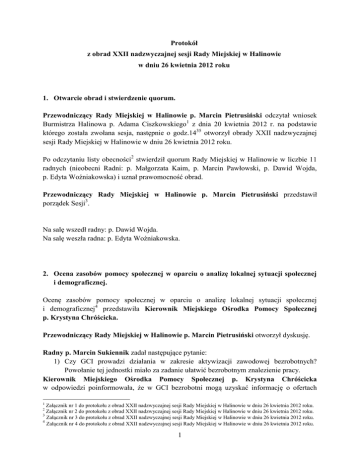 Protokół z obrad XXII nadzwyczajnej sesji Rady Miejskiej w Halinowie w dniu 26 kwietnia 2012 roku 1. Otwarcie obrad i stwierdzenie quorum. Przewodniczący Rady Miejskiej w Halinowie p. Marcin Pietrusiński odczytał wniosek Burmistrza Halinowa p. Adama Ciszkowskiego1 z dnia 20 kwietnia 2012 r. na podstawie którego została zwołana sesja, następnie o godz.1435 otworzył obrady XXII nadzwyczajnej sesji Rady Miejskiej w Halinowie w dniu 26 kwietnia 2012 roku. Po odczytaniu listy obecności2 stwierdził quorum Rady Miejskiej w Halinowie w liczbie 11 radnych (nieobecni Radni: p. Małgorzata Kaim, p. Marcin Pawłowski, p. Dawid Wojda, p. Edyta Woźniakowska) i uznał prawomocność obrad. Przewodniczący Rady Miejskiej w Halinowie p. Marcin Pietrusiński przedstawił porządek Sesji3. Na salę wszedł radny: p. Dawid Wojda. Na salę weszła radna: p. Edyta Woźniakowska. 2. Ocena zasobów pomocy społecznej w oparciu o analizę lokalnej sytuacji społecznej i demograficznej. Ocenę zasobów pomocy społecznej w oparciu o analizę lokalnej sytuacji społecznej i demograficznej4 przedstawiła Kierownik Miejskiego Ośrodka Pomocy Społecznej p. Krystyna Chróścicka. Przewodniczący Rady Miejskiej w Halinowie p. Marcin Pietrusiński otworzył dyskusję. Radny p. Marcin Sukiennik zadał następujące pytanie: 1) Czy GCI prowadzi działania w zakresie aktywizacji zawodowej bezrobotnych? Powołanie tej jednostki miało za zadanie ułatwić bezrobotnym znalezienie pracy. Kierownik Miejskiego Ośrodka Pomocy Społecznej p. Krystyna Chróścicka w odpowiedzi poinformowała, że w GCI bezrobotni mogą uzyskać informację o ofertach 1 Załącznik nr 1 do protokołu z obrad XXII nadzwyczajnej sesji Rady Miejskiej w Halinowie w dniu 26 kwietnia 2012 roku. Załącznik nr 2 do protokołu z obrad XXII nadzwyczajnej sesji Rady Miejskiej w Halinowie w dniu 26 kwietnia 2012 roku. 3 Załącznik nr 3 do protokołu z obrad XXII nadzwyczajnej sesji Rady Miejskiej w Halinowie w dniu 26 kwietnia 2012 roku. 4 Załącznik nr 4 do protokołu z obrad XXII nadzwyczajnej sesji Rady Miejskiej w Halinowie w dniu 26 kwietnia 2012 roku. 2 1 pracy. Ważnym elementem jest otoczenie bezrobotnych specjalistyczną opieką psychologiczną, zagwarantowanie spotkań z doradcą zawodowym takiego typu wsparcie oferuje Powiatowy Urząd Pracy w Mińsku Mazowieckim. Radny p. Dawid Wojda zadał następujące pytania: 1) jaki jest udział środków z budżetu Gminy Halinów w ogólnym budżecie MOPS-u? Kierownik Miejskiego Ośrodka Pomocy Społecznej p. Krystyna Chróścicka w odpowiedzi poinformowała, że środki na wypłatę świadczeń alimentacyjnych i świadczeń rodzinnych w całości finansowane są z budżetu państwa natomiast cześć świadczeń z zakresu pomocy społecznej finansowanych jest z budżetu gminy, wkład ten wynosi około 600 000,00 zł. 2) czy MOPS finansuje powstanie rodzinnych domów dziecka na terenie Gminy Halinów? Kierownik Miejskiego Ośrodka Pomocy Społecznej p. Krystyna Chróścicka w odpowiedzi poinformowała, że powstanie rodzinnych domów dziecka finansowane jest z budżetu państwa. Gmina dofinansowuje koszty utrzymania dziecka z terenu naszej Gminy w takiej placówce. Radna p. Katarzyna Goździewska zadała następujące pytanie: 1) dlaczego osoby z terenu Gminy Halinów kierowane są do placówek opiekuńczych np. do Mieni? Koszt utrzymania w Domu Pomocy Społecznej w Mieni jest wyższy o około 800 zł za miesiąc w porównaniu z prywatnym ośrodkiem działającym na terenie Halinowa? Kierownik Miejskiego Ośrodka Pomocy Społecznej p. Krystyna Chróścicka w odpowiedzi poinformowała, że osobę można umieścić w prywatnym ośrodku wtedy, gdy czas oczekiwania na miejsce w DPS jest dłuższy niż 3 miesiące. Przewodniczący Rady Miejskiej w Halinowie p. Marcin Pietrusiński zadał następujące pytanie: 1) ile dzieci z terenu Gminy jest umieszczonych w domach dziecka, rodzinnych domach dziecka? Co jest główną przyczyną umieszczania dzieci w domach dziecka? Sieroctwo czy odebranie praw rodzicielskich rodzicom? Kierownik Miejskiego Ośrodka Pomocy Społecznej p. Krystyna Chróścicka w odpowiedzi poinformowała, że około 40 dzieci umieszczonych jest w placówkach opiekuńczo wychowawczych. Główną przyczyną umieszczania jest odebranie, ograniczenie rodzicom przez sąd władzy rodzicielskiej. Niektóre dzieci po poprawie się sytuacji rodzinnej wracają do domów rodzinnych ale spory odsetek pozostaje. Radny p. Andrzej Milczarek podziękował za szczegółowe sprawozdanie i zwrócił się z prośbą o przekazanie go do Komisji do spraw Zdrowia, Spraw Społecznych, Bezpieczeństwa i Porządku Publicznego w celu dokładnego przeanalizowania i przygotowania wniosków do budżetu na przyszły rok aby odzwierciedlały najważniejsze potrzeby MOPS. 2 W wyniku braku pytań Przewodniczący Rady Miejskiej w Halinowie p. Marcin Pietrusiński zamknął dyskusje. 3. Informacja p. Sebastiana Bodzenty – prezesa Zarządu Spółki EKO-INWESTYCJA w Sulejówku w zakresie działalności spółki w roku 2011, w tym omówienie postępu prac budowy kanalizacji w Okuniewie. Prezes spółki EKO-INWESTYCJA p. Sebastian Bodzenta przedstawił sprawozdanie z działalności spółki5 za rok obrotowy 2011 oraz poinformował o najważniejszych punktach sprawozdania finansowego, harmonogramie prac oraz o postępie prac budowy kanalizacji w Okuniewie. Przewodniczący Rady Miejskiej w Halinowie p. Marcin Pietrusiński otworzył dyskusję. Radny p. Andrzej Milczarek zadał następujące pytania: 1) Czy ogłoszono przetarg na przebudowę oczyszczalni ścieków w Sulejówku? Prezes spółki EKO-INWESTYCJA p. Sebastian Bodzenta w odpowiedzi poinformował, że przetarg na modernizację i rozbudowę oczyszczalni ścieków w Sulejówku został ogłoszony w dniu 22 grudnia 2011 roku, a rozstrzygnięty w dniu dzisiejszym (tj. 26.04.2012 r.). Procedura przetargowa trwała bardzo długo dlatego, że było bardzo dużo zapytań 