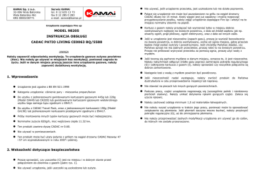 KAMAi Sp. z o.o. 32-006 Wola Batorska Wola Batorska 461 KRS 0000230771 Serwis KAMAi tel. 0 12 635 13 73 fax 0 12 285 0 283 e-mail: [email protected] Urządzenie zapalające Fire up MODEL 98205 INSTRUKCJA OBSŁUGI CADAC PATIO LIVING CE0063 BQ/5588 UWAGA Należy zapewnić odpowiednią wentylację. To urządzenie gazowe zużywa powietrze (tlen). Nie należy go używać w miejscach bez wentylacji, ponieważ zagraża to życiu. Jeśli w danym miejscu pracują jeszcze inne urządzenia gazowe, należy zapewnić dodatkową wentylację. Nie używać, jeśli urządzenie przecieka, jest uszkodzone lub nie działa poprawnie. Palące się urządzenie nie może być pozostawione na grillu na węgiel drzewny CADAC dłużej niż 15 minut. Kiedy węgiel jest już zapalony i można rozpocząć przygotowywanie posiłku, należy zdjąć urządzenie zapalające Fire Up i włożyć na to miejsce normalny zbiornik na popiół. Kartusz z gazem należy przyłączać lub wymieniać tylko w miejscu dobrze wentylowanym najlepiej na świeżym powietrzu, z dala od źródeł zapłonu jak np. otwarty ogień, prąd pilotowy, ogień elektryczny, oraz z dala od innych osób. Jeśli w urządzenie jest nieszczelne (zapach gazu), proszę je wynieść bezzwłocznie na świeże powietrze, w dobrze wentylowane, wolne od ognia miejsce, gdzie przeciek będzie mógł zostać wykryty i powstrzymany. Jeśli chcieliby Państwo zbadać, czy Państwa sprzęt nie ma żadnych przecieków, proszę robić to na świeżym powietrzu. Proszę nie próbować wykrywać przecieku za pomocą ognia, proszę użyć wody z mydłem. Jeśli tworzą się pęcherze mydlane w danym miejscu, oznacza to, iż jest nieszczelne. Należy natychmiast odłączyć źródło gazy poprzez zamknięcie pokrętła regulacyjnego (G) i odkręcenie kartusza z gazem (I), należy sprawdzić czy wszystkie połączenia są dobrze zamontowane. Następnie test z wodą z mydłem powinien być powtórzony. 1. Wprowadzenie Jeśli nieszczelność nadal występuje, należy zwrócić produkt dystrybutora w celu przeprowadzenia inspekcji lub naprawy. do Państwa Urządzenie jest zgodne z BS EN 521:1998 Nie stawiać na piecach lub innych gorących powierzchniach. Kategoria urządzenia: ciśnienie pary – mieszanka propan/butan Podczas pracy, części urządzenia nagrzewają się (szczególnie palnik i nierdzewny Do użytku z jednorazowymi gwintowanymi kartuszami gazowymi 445g lub 220g (Model CA445 lub CA220) lub gwintowanymi kartuszami gazowymi wielokrotnego użytku tego samego typu zgodnymi z EN417. Do użytku z CADAC Travel Pack, wraz z jednorazowymi kartuszami 190g (Model CA190) lub jednorazowymi kartuszami przebijanymi zgodnymi z EN417. Próby montowania innych typów kartuszy gazowych może być niebezpieczne. Nominalne zużycie 820g/h, moc wejściowa ciepła 11.32 kw. Ten produkt zawiera dyszę CADAC nr 0.60. Nie używać w pomieszczeniach. Ten produkt może być użyty jedynie z grillem na węgiel drzewny CADAC Neoway 47 i 57 cm wyprodukowanym w roku 2007 i później. 2. Wskazówki dotyczące bezpieczeństwa Proszę sprawdzić, czy uszczelka (C) jest na miejscu i w dobrym stanie przed połączeniem do zbiornika z gazem (patrz rys. 1). Nie używać urządzenia, jeśli uszczelki są uszkodzone lub zużyte. pierścień stalowy). Należy unikać dotykania rękami gorących części. Zaleca się użycie rękawic. Należy zachować odstęp minimum 1,5 od materiałów łatwopalnych. Nie należy ruszać urządzenia w trakcie jego pracy, ponieważ może to spowodować zwiększenie się płomienia. Jeśli płomień zaczyna mocno buchać, należy przykręcić pokrętło regulacyjne (G), aż do zmniejszenia płomienia. Nie należy przeprowadzać żadnych modyfikacji urządzenia ani używać go do celów, do których nie zostało przeznaczone. 3. Lista części A. Urządzenie zapalające B. Czasza C. Uszczelka D. Palnik E. Dysza F. Kołki podtrzymujące G. Pokrętło regulacyjne H. Zapalnik I. Kartusz z gazem J. Zawór K. Klamry regulacyjne otworów wentylacyjnych L. Uchwyt M. Kratownica N. Rura mieszająca 4. Instrukcja montażu Urządzenie zapalające CADAC Fire Up nie wymaga składania i jest gotowe do użytku. Należy jedynie podłączyć je do kartusza z gazem (I). Urządzenie Fire Up należy dołączyć do kartusza z gazem poprzez przykręcenie łącznika zamontowanego na górze kartusza do łącznika na zaworze (J). Przykręcić butlę gazową zgodnie z ruchem wskazówek zegara do oporu. Przy usuwaniu kartusza z gazem należy sprawdzić, czy palnik (D) jest zgaszony a następnie poczekać, aż urządzenie zapalające Fire Up ostygnie, po czym należy kręcić kartusz w kierunku przeciwnym do ruchu wskazówek zegara aż do całkowitego odłączenia go od urządzenia. Należy trzymać urządzenie w bezpiecznej odległości, aby uniknąć wdychania resztek gazu. Należy zamontować urządzenie Fire Up do spodu czaszy (B) poprzez zaczepienie kołków podtrzymujących (F) na wewnętrznej obręczy urządzenia Fire Up przy czym otwarty koniec rowku dopasowującego powinien się znajdować na klamrach regulacyjnych otworów wentylacyjnych (K). Należy przekręcić urządzenie zgodnie z ruchem wskazówek zegara, aby zaczepiło się do czaszy. Klamry regulacyjne otworów wentylacyjnych mają trzy ustawienia. Zamknięte, półotwarte i otwarte. Patrz rys 4 (a, b, c i d) Przy zdejmowaniu urządzenia Fire Up z grilla CADAC, należy trzymać uchwyt (L) i kręcić urządzeniem w kierunku przeciwnym do ruchu wskazówek zegara. Nie należy dotykać innych części urządzenia zapalającego za wyjątkiem uchwytu, gdyż mogą one być bardzo gorące. 5. Używanie urządzenia Zaleca się używanie rękawic ochronnych. UWAGA: Łatwo dostępne części mogą być bardzo gorące. Należy nie dopuszczać dzieci w pobliże urządzenia. Po zamontowaniu urządzenia zapalającego Fire Up do grilla węglowego CADAC zgodnie z instrukcją w punkcie 4, należy ułożyć węgiel na środku kratownicy (M) grilla (pa