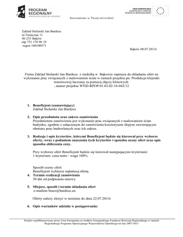 Inwestujemy w Twoją przyszłość Zakład Stolarski Jan Bardosz ul.Tartaczna 11 46-233 Bąków nip 751 170 96 19 regon 160100571 Bąków 08.07.2013r Firma Zaklad Stolarski Jan Bardosz z siedzibą w Bąkowie zaprasza do składania ofert na wykonanie prac związanych z malowaniem ścian w ramach projektu pn. Produkcja klejonki warstwowej łaczonej za pomocą złączy klinowych , numer projektu WND-RPOP.01.03.02-16-042/12 1. Beneficjent (zamawiający) Zakład Stolarski Jan Bardosz 2. Opis przedmiotu oraz zakres zamówienia Przedmiotem zamówienia jest wykonanie prac związanych z malowaniem ścian budynku, zgodnie z załączonym do zamówienia kosztorysem ślepym zawierającym obmiary prac budowlanych oraz ich zakres. 3. Rodzaje i opis kryteriów, którymi Beneficjent będzie się kierował przy wyborze oferty, wraz z podaniem znaczenia tych kryteriów i sposobu oceny ofert oraz opis sposobu obliczenia ceny. Przy wyborze ofert Beneficjent będzie się kierował następującymi kryteriami: 1 kryterium: cena netto - waga 100% Sposób oceny ofert: Beneficjent wybierze najtańszą ofertę. 4. Termin realizacji zamówienia 30 dni od podpisania umowy 5. Miejsce, sposób i termin składania ofert e-mailem [email protected] Oferty należy złożyć w terminie do dnia 22.07.2013r 6. Opis warunków udziału w postępowaniu: Projekt współfinansowany przez Unię Europejską ze środków Europejskiego Funduszu Rozwoju Regionalnego w ramach Regionalnego Programu Operacyjnego Województwa Opolskiego na lata 2007-2013 Inwestujemy w Twoją przyszłość O zamówienie może ubiegać się wykonawca, który: - posiada uprawnienia do wykonywania określonej działalności lub czynności, jeżeli ustawy nakładają obowiązek posiadania takich uprawnień Oferta musi zawierać minimum takie informacje jak: - dane oferenta - dane beneficjenta, do którego skierowana jest oferta - cenna netto oraz cena brutto - warunki gwarancji - datę realizacji zamówienia - datę ważności oferty - datę sporządzenia oferty - podpis i pieczęć oferenta - uzupełniony kosztorys ślepy 7. Rozstrzygniecie postępowania i zlecenie realizacji zamówienia Postępowanie ofertowe zostanie rozstrzygnięte w dniu 22.07.2013r do godz. 12.00. Po tym dniu na stronie internetowej beneficjenta www.bardosz.eu pojawi się informacja o wyborze najkorzystniejszej oferty. W przypadku wątpliwości prosimy o kontakt pod numerem 692 666 902. Projekt współfinansowany przez Unię Europejską ze środków Europejskiego Funduszu Rozwoju Regionalnego w ramach Regionalnego Programu Operacyjnego Województwa Opolskiego na lata 2007-2013