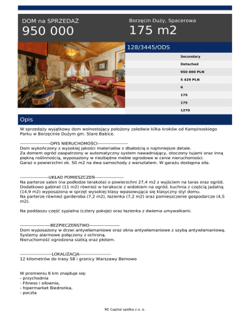 DOM na SPRZEDAŻ 950 000 Borzęcin Duży, Spacerowa 175 m2 128/3445/ODS Secondary Detached 950 000 PLN 5 429 PLN 6 175 175 1270 Opis W sprzedaży wyjątkowy dom wolnostojący położony zaledwie kilka kroków od Kampinoskiego Parku w Borzęcinie Dużym gm. Stare Babice. --------------------OPIS NIERUCHOMOŚCI-------------------Dom wykończony z wysokiej jakości materiałów z dbałością o najmniejsze detale. Za domem ogród zaopatrzony w automatyczny system nawadniający, otoczony tujami oraz inną piękną roślinnością, wyposażony w niezbędne meble ogrodowe w cenie nieruchomości. Garaż o powierzchni ok. 50 m2 na dwa samochody z warsztatem. W garażu dostępna siła. -------------------UKŁAD POMIESZCZEŃ------------------Na parterze salon (na podłodze terakota) o powierzchni 27,4 m2 z wyjściem na taras oraz ogród. Dodatkowo gabinet (11 m2) również w terakocie z widokiem na ogród, kuchnia z częścią jadalną (14,9 m2) wyposażona w sprzęt wysokiej klasy wpasowująca się klasyczny styl domu. Na parterze również garderoba (7,2 m2), łazienka (7,2 m2) oraz pomieszczenie gospodarcze (4,5 m2). Na poddaszu część sypialna (cztery pokoje) oraz łazienka z dwiema umywalkami. --------------------BEZPIECZEŃSTWO-------------------Dom wyposażony w drzwi antywłamaniowe oraz okna antywłamaniowe z szybą antywłamaniową. Systemy alarmowe połączony z ochroną. Nieruchomość ogrodzona siatką oraz płotem. ---------------------LOKALIZACJA--------------------12 kilometrów do trasy S8 i granicy Warszawy Bemowo W promieniu 6 km znajduje się: - przychodnia - Fitness i siłownia, - hipermarket Biedronka, - poczta RE Capital spółka z o. o. - restauracje oraz różnego rodzaju punkty usługowe. Zapraszamy do obejrzenia. RE Capital Nieruchomości mail: [email protected] Juliusz Kwiatkowski tel. +48530985656 tel. 225353628 email: [email protected] RE Capital spółka z o. o. Powered by TCPDF (www.tcpdf.org)