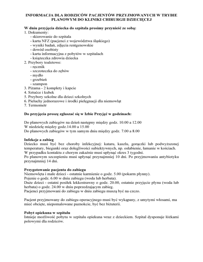 INFORMACJA DLA RODZICÓW PACJENTÓW PRZYJMOWANYCH W TRYBIE PLANOWYM DO KLINIKI CHIRURGII DZIECIĘCEJ W dniu przyjęcia dziecka do szpitala prosimy przynieść ze sobą: 1. Dokumenty: - skierowanie do szpitala - karta NFZ (pacjenci z województwa śląskiego) - wyniki badań, zdjęcia rentgenowskie - dowód osobisty - karta informacyjna z pobytów w szpitalach - książeczka zdrowia dziecka 2. Przybory toaletowe: - ręcznik - szczoteczka do zębów - mydło - grzebień - szampon 3. Piżama - 2 komplety i kapcie 4. Sztućce i kubek 5. Przybory szkolne dla dzieci szkolnych 6. Pieluchy jednorazowe i środki pielęgnacji dla niemowląt 7. Termometr Do przyjęcia proszę zgłaszać się w Izbie Przyjęć w godzinach: Do planowych zabiegów na dzień następny między godz. 10.00 a 12.00 W niedzielę między godz.14.00 a 15.00 Do planowych zabiegów w tym samym dniu między godz. 7.00 a 8.00 Infekcje a zabieg Dziecko musi być bez choroby infekcyjnej: kataru, kaszlu, gorączki lub podwyższonej temperatury, biegunki oraz dolegliwości subiektywnych, np. osłabienie, łamanie w kościach. W przypadku kontaktu z chorym zakaźnie musi upłynąć okres 3 tygodni. Po planowym szczepieniu musi upłynąć przynajmniej 10 dni. Po przyjmowaniu antybiotyku przynajmniej 14 dni. Przygotowanie pacjenta do zabiegu Niemowlęta i małe dzieci - ostatnie karmienie o godz. 5.00 (pokarm płynny). Pojenie o godz. 6.00 w dniu zabiegu (woda lub herbata). Duże dzieci - ostatni posiłek lekkostrawny o godz. 20.00, ostatnie przyjęcie płynu (woda lub herbata) o godz. 24.00 w dniu poprzedzającym zabieg. Pacjenci przyjmowani do zabiegu w dniu zabiegu muszą być na czczo. Pacjent przyjmowany do zabiegu operacyjnego musi być wykąpany, z umytymi włosami, ma mieć obcięte, niepomalowane paznokcie, być bez biżuterii. Pobyt opiekuna w szpitalu Istnieje możliwość pobytu w szpitalu opiekuna wraz z dzieckiem. Szpital dysponuje łóżkami polowymi dla rodziców. Inne informacje Harmonogram operacji może ulec zmianie. Nr telefonu kancelarii Kliniki Chirurgii: (32) 207 18 34 (wypisy, L4, zaświadczenia, wyniki badań itp.) Nr telefonu sekretariatu Kliniki Chirurgii: (32) 207 17 50 (ustalenie terminu zabiegu) Nr telefonu Poradni Chirurgicznej: (32) 207 16 50, 32/ 207 16 51